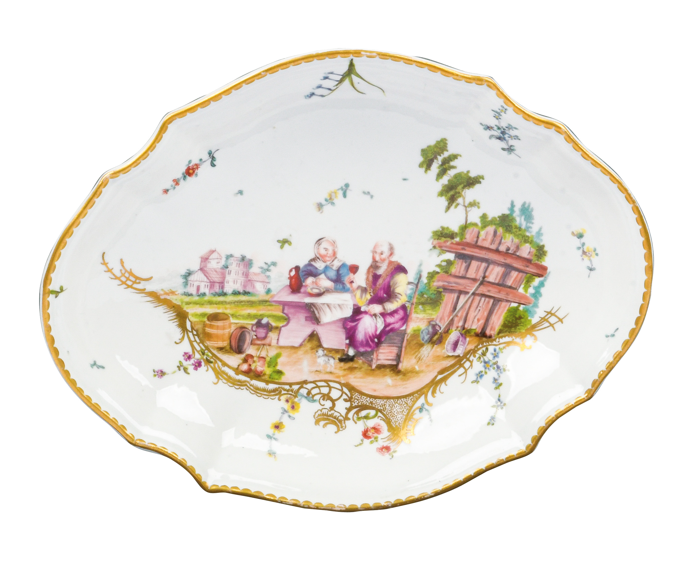 Oval gemuldet, mit steigender Fahne und Flechtwerkrelief, gesäumt von kapuzinerbraunem Lippenrand. Spiegel bunt bemalt mit Floraldekor. Porzellan, verso unterglasurblaue, steigende Löwenmarke, REM Sammlungs-No. 000080. Vgl. B. Beaucamp-Markowsky, S. 39, Nr. 4.