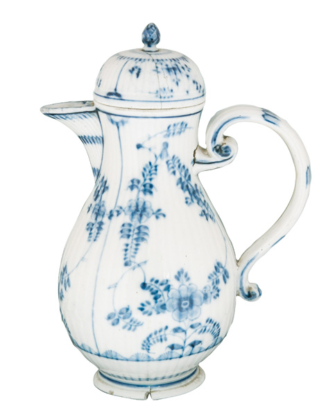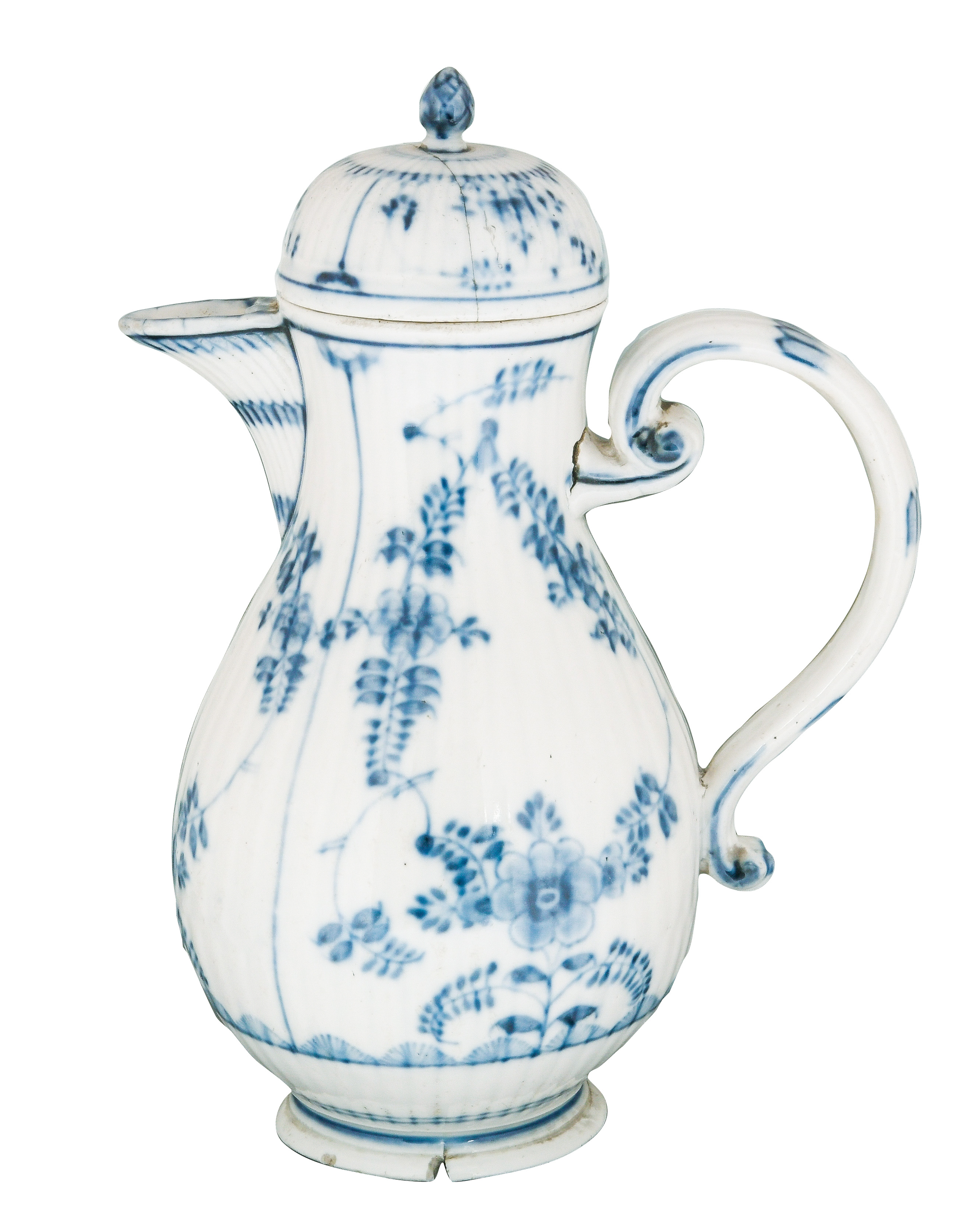 Birnförmig, mit seitlich geschweiftem S-Henkel und kurzer, V-förmiger Schnaupe. Wandung mit gebrochenem Stab, unterglasurblau bemalt mit Heckenmuster. Porzellan, am Boden unterglasurblaue, bekrönte, ligierte CT-Marke mit Buchstabe „W“, REM Sammlungs-No. 000101. Vgl. B. Beaucamp-Markowsky, S. 328ff, Nr. 203ff. (Deckel geklebt, min. best.)