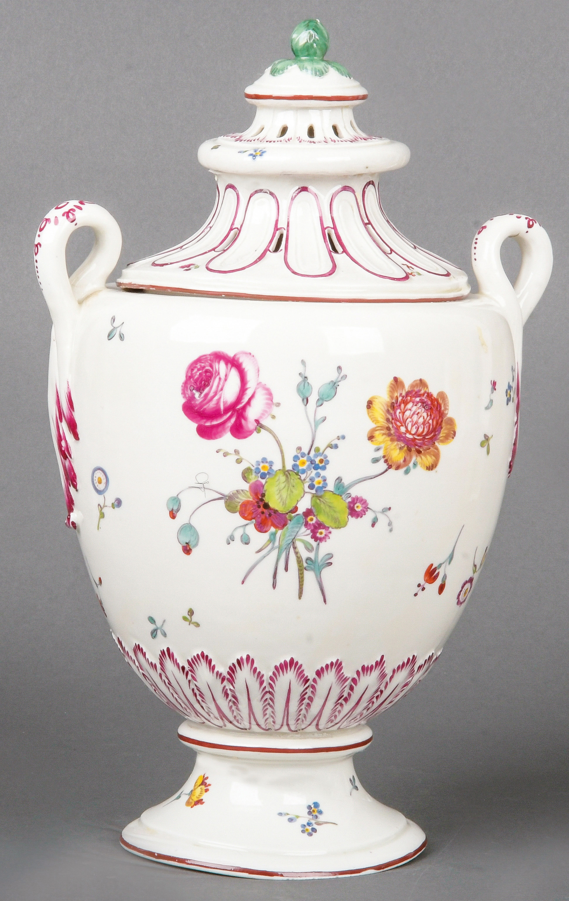 Eiförmig, auf eingeschnürtem, rundem Standfuß. Seitliche, erhöhte, durchbrochene, schlaufenförmige Henkel. Abgerundete Schultern mit darauf ruhendem, gestuftem und sich nach oben verjüngendem, durchbrochenem Deckel. Beide Schauseiten bunt bemalt mit Blumenbouquet, umgeben von Streublumen. Porzellan, am Boden unterglasurblaue, bekrönte, ligierte CT-Marke. Modell von Franz Conrad Linck. Vgl. C. L. Fuchs / F. Hepp, „Die Vasen der Manufaktur Frankenthal“, Aussstellungskatalog Kurpfälzisches Museum Heidelberg 2006, S. 70, Nr. 54 (das Gegenstück der hier gezeigten)