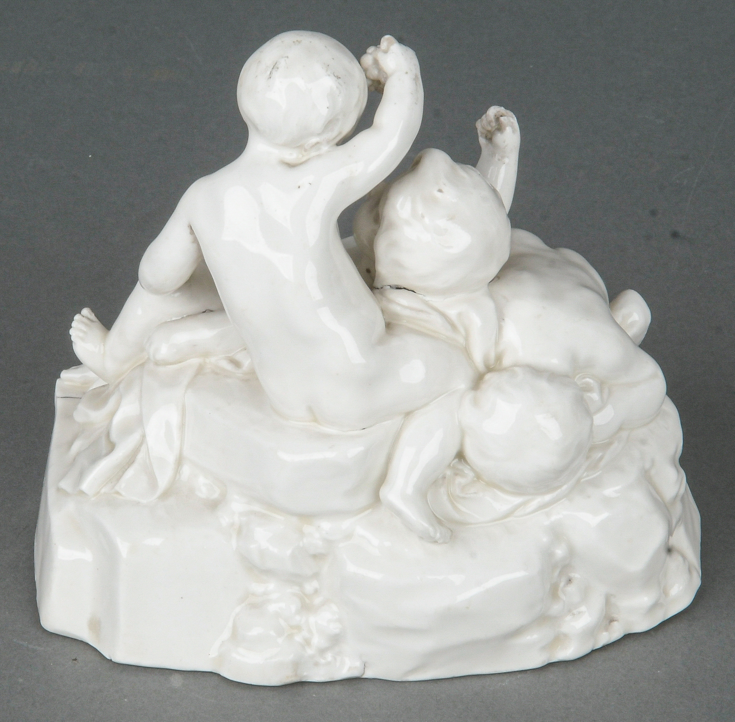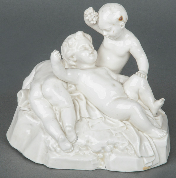Allegorische Darstellung in Form dreier nackter Kinder beim spielerischen Traubenessen, auf ovalem, unregelmäßigem Felssockel. Porzellan, weiß glasiert, am Boden unterglasurblaue, bekrönte, ligierte CT-Marke, REM Sammlung-No. 000004. Modell von Johann Peter Melchior. Vgl. B. Beaucamp-Markowsky, S. 574ff, Nr. 313ff.