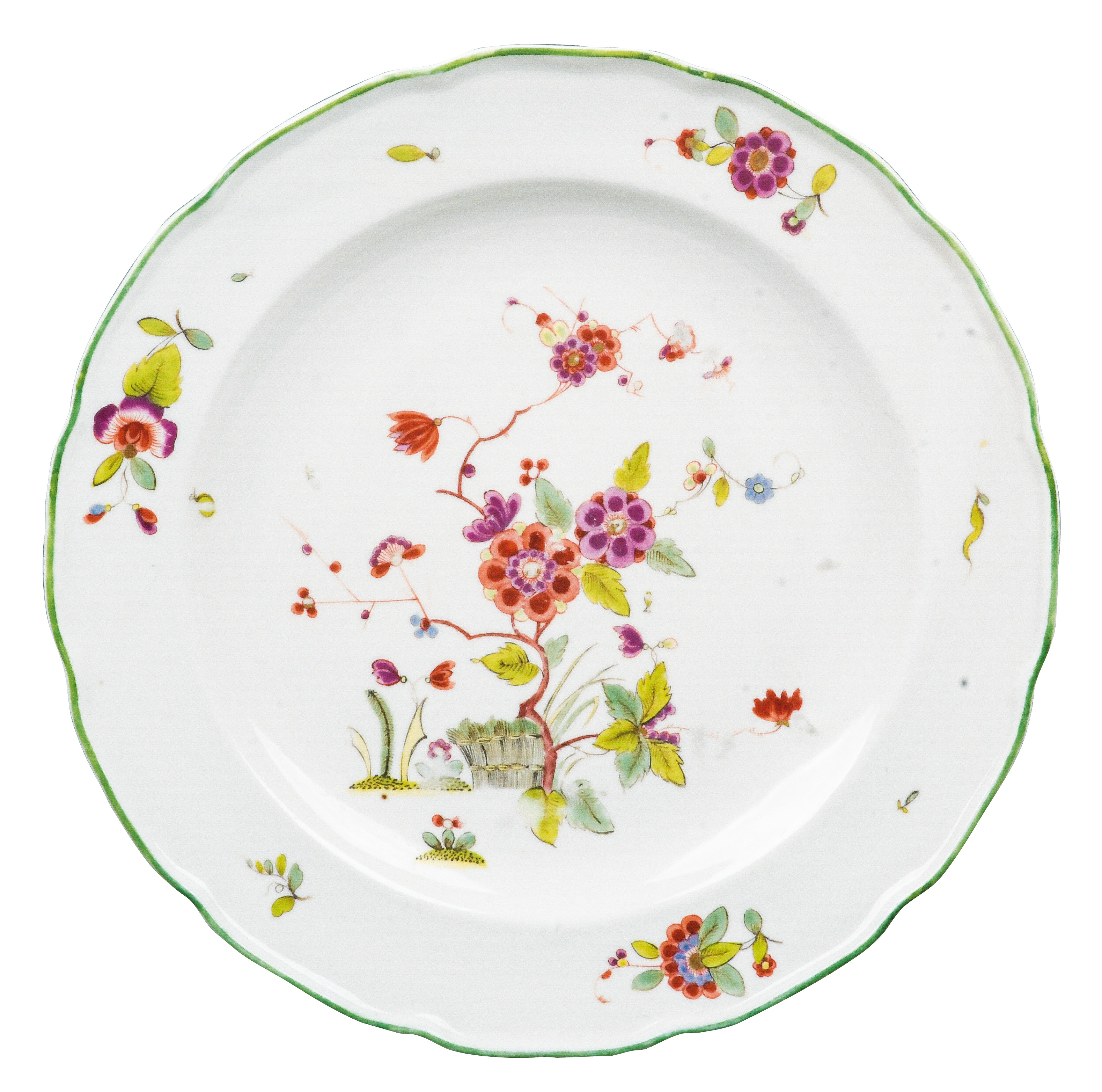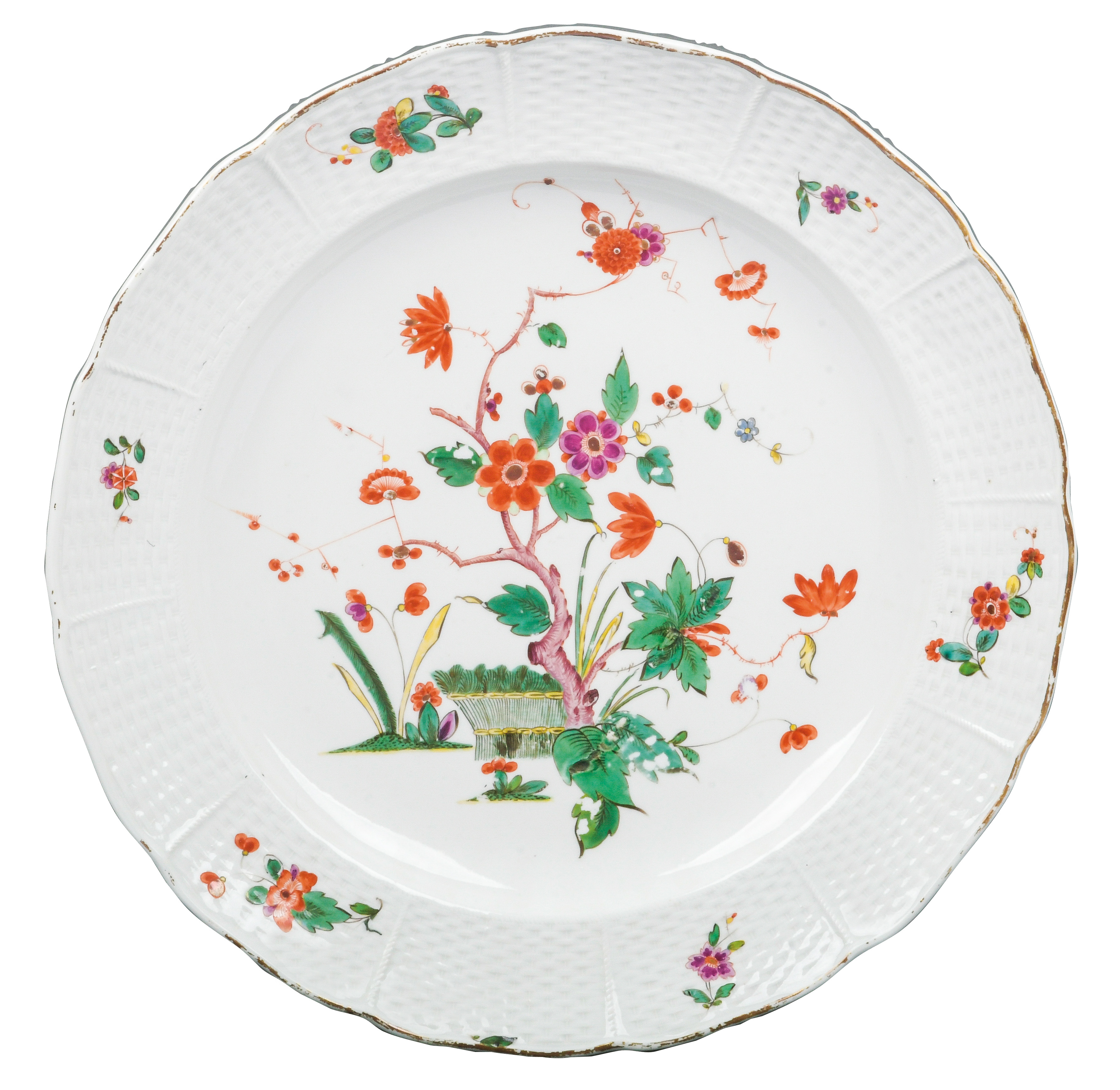 Rund gemuldet, mit steigender Korbflechtrelieffahne, gold gesäumt. Spiegel bunt bemalt mit indianischem Floraldekor. Porzellan, verso unterglasurblaue, steigende Löwenmarke mit „iH“, REM Sammlungs-No. 02287. Vgl. B. Beaucamp-Markowsky, S. 45ff, Nr. 9ff.