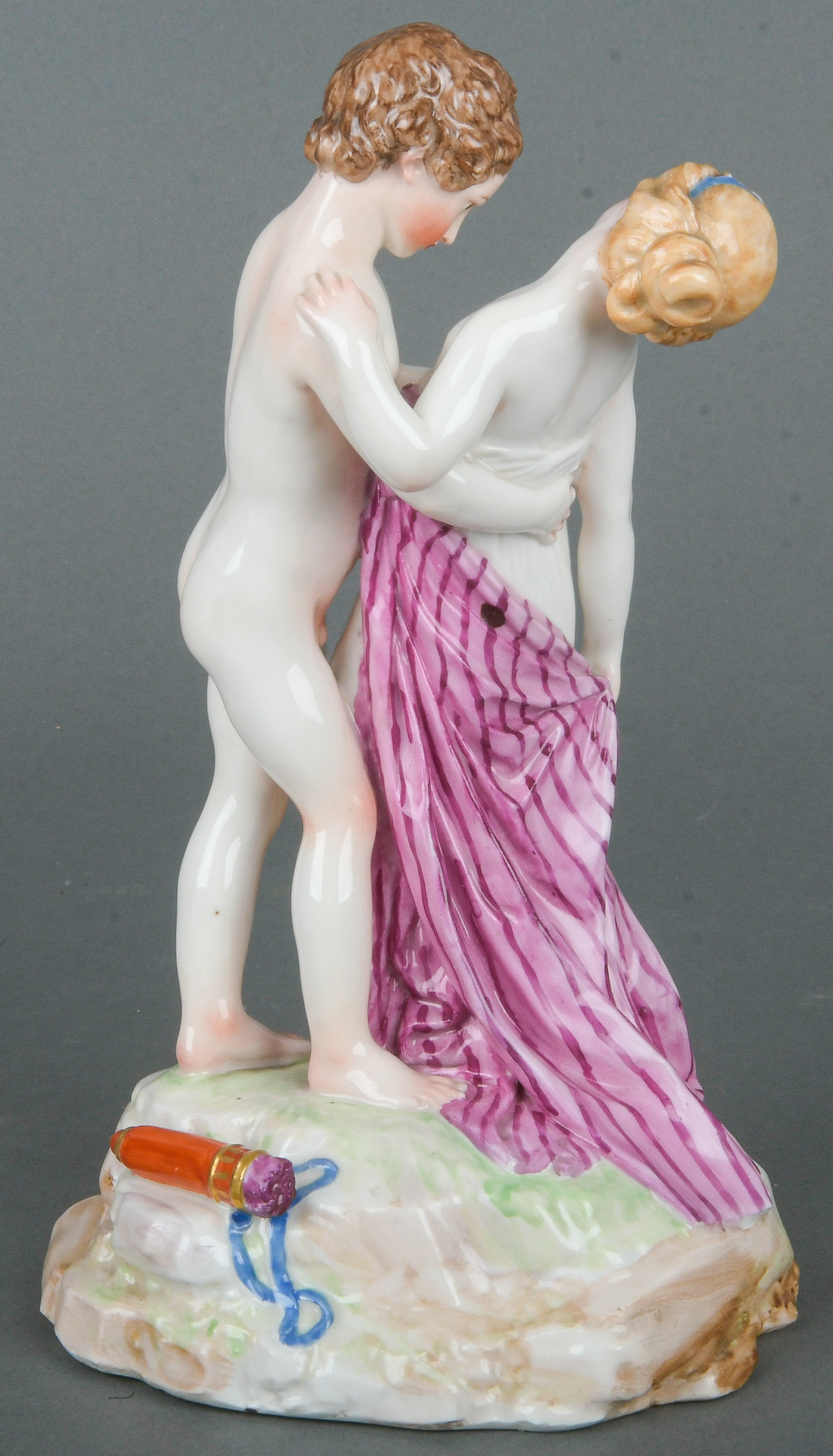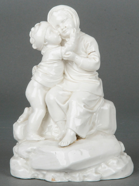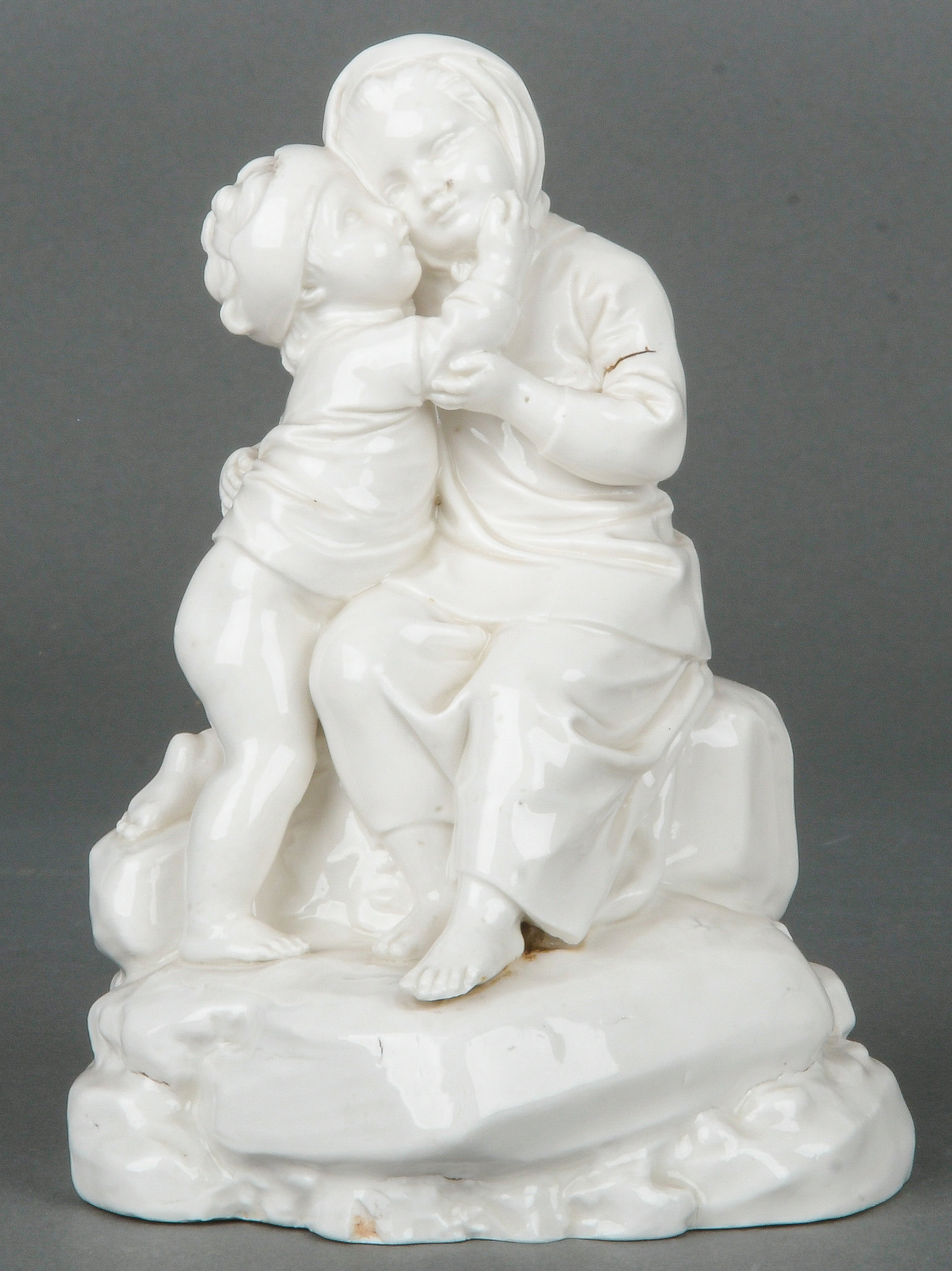 Auf ovalem, felsigem Sockel stehend bzw. sitzend. Porzellan, weiß glasiert, am Boden unterglasurblaue, bekrönte, ligierte CT-Marke mit Ritzzeichen „No2“ und „W“, REM Sammlungs-No. 002226. Modell von Johann Peter Melchior. Vgl. C. T. Hofmann, Taf. 142, Nr. 574.
