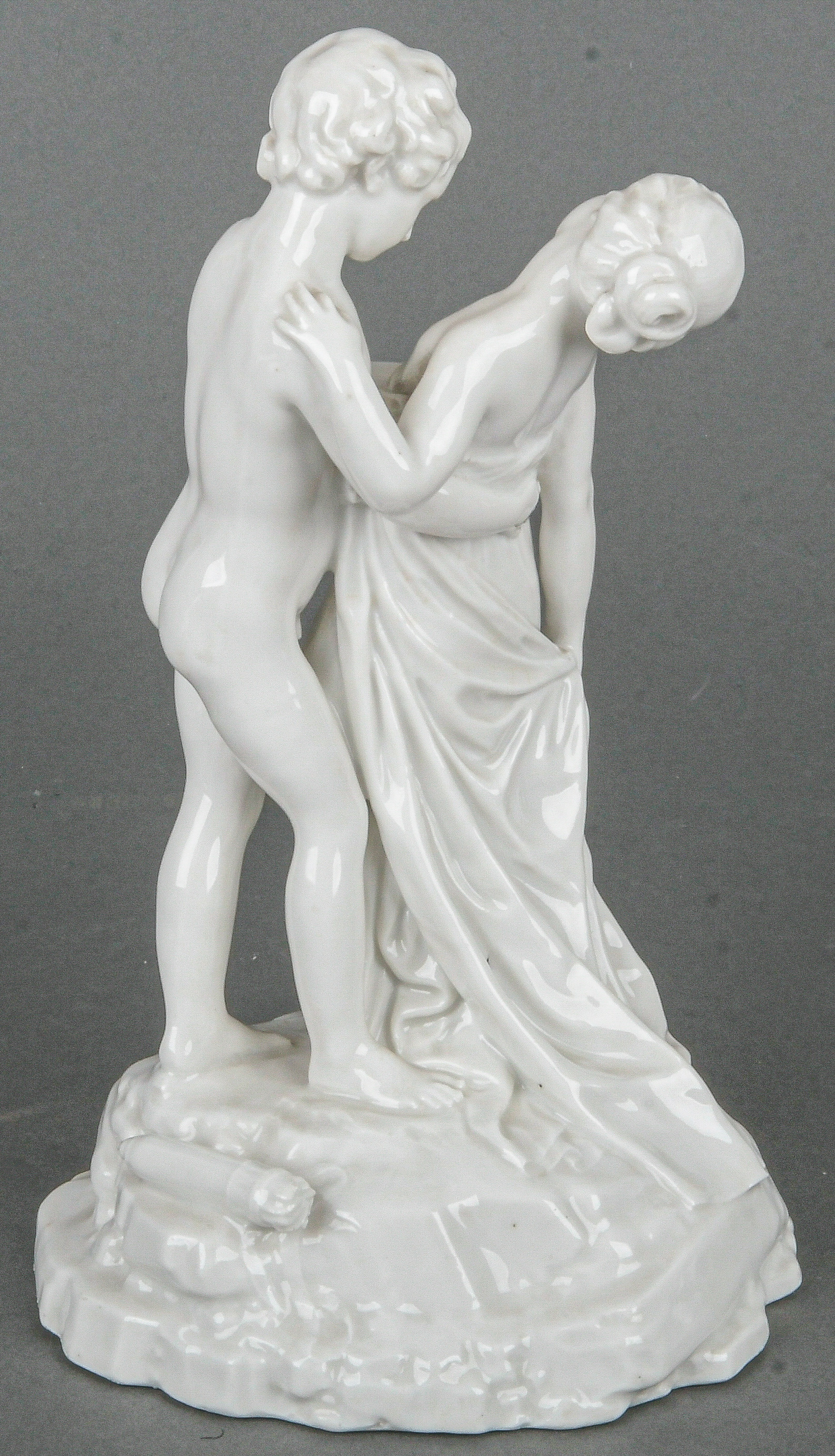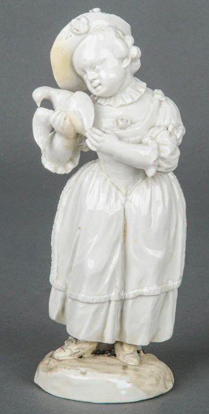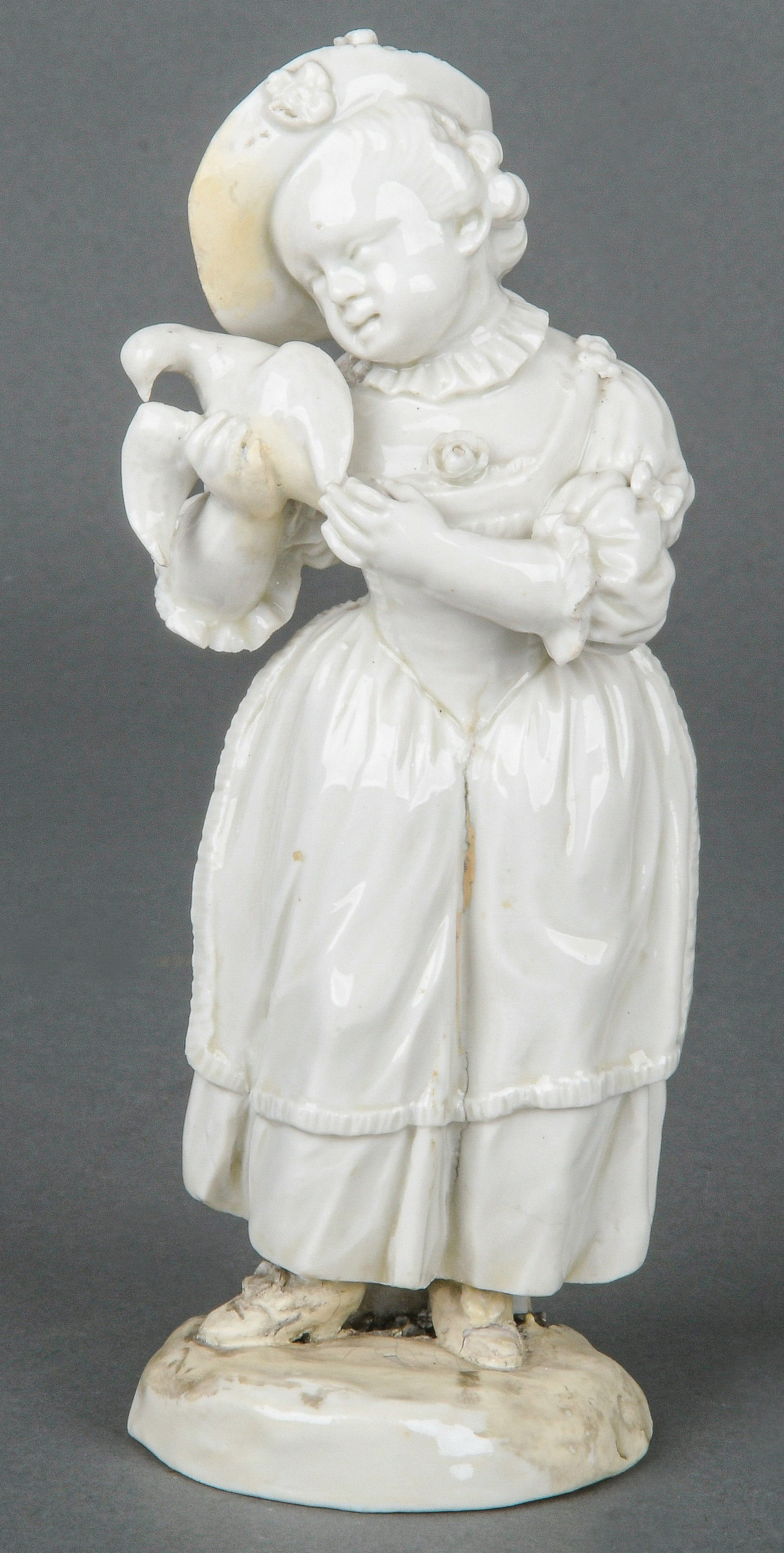 Auf rundem unregelmäßigem Sockel stehend. In den Händen eine Taube haltend. Porzellan, weiß glasiert, am Boden unterglasurblaue, bekrönte, ligierte CT-Marke, REM Sammlungs-No. 00007. Modell von Adam Bauer. Vgl. E. Heuser, 1922, S. 173, Nr. 169, id. abgebildet. (stark rest.)