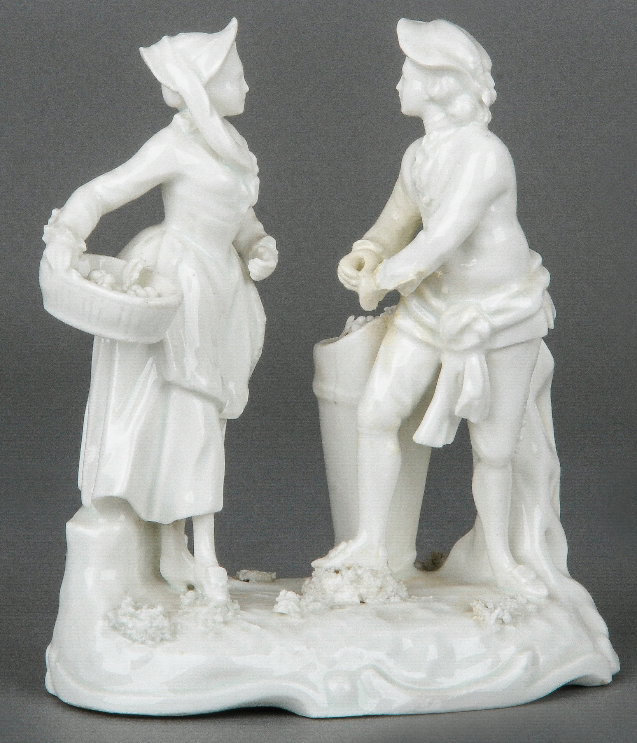 Aus der Serie der vier Jahreszeiten. Winzer und Winzerin, auf ovalem roccaillereliefiertem Sockel mit aufbossierten Grasbüscheln stehend. Porzellan, weiß glasiert, am Boden unterglasurblaue, bekrönte, ligierte CT-Marke, REM Sammlungs-No. 002180. Modell von Carl Gottlieb Lück. Vgl. C.T. Hofmann, Taf. 111, Nr. 462. (rest.)