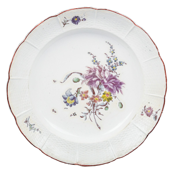 Rund gemuldet, mit steigender Korbflechtrelieffahne und purpurn staffiertem Lippenrand. Spiegel bunt bemalt mit Floraldekor. Porzellan, verso unterglasurblaue steigende Löwenmarke, REM Sammlungs-No. 000081. Vgl. B. Beaucamp-Markowsky, S. 39ff, Nr. 5.