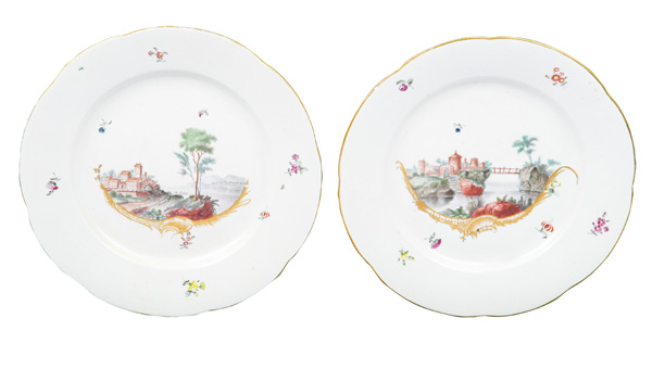 Rund gemuldet, mit breiter Fahne, umlaufend mit Grisaille-Bordüre, gold gesäumt. Spiegel mit ovalem Medaillon, gesäumt von Zickzack-Dekor in Gold. Reserve graucamaieu bemalt mit Doppelhenkelvase, umgeben von bunt gemalter Draperie, oberhalb ein Blumenflor mit Strohhut, Schäferschippe, Blasinstrument mit Floraldekor, eine sogenannte „Schäferidylle“. Porzellan, am Boden unterglasurblaue, bekrönte, ligierte CT-Marke, REM Sammlungs-No. 000062. Vgl. B. Beaucamp-Markowsky, S. 1543ff, Nr. 70ff.