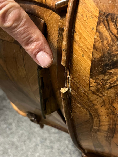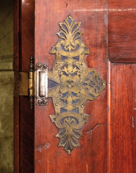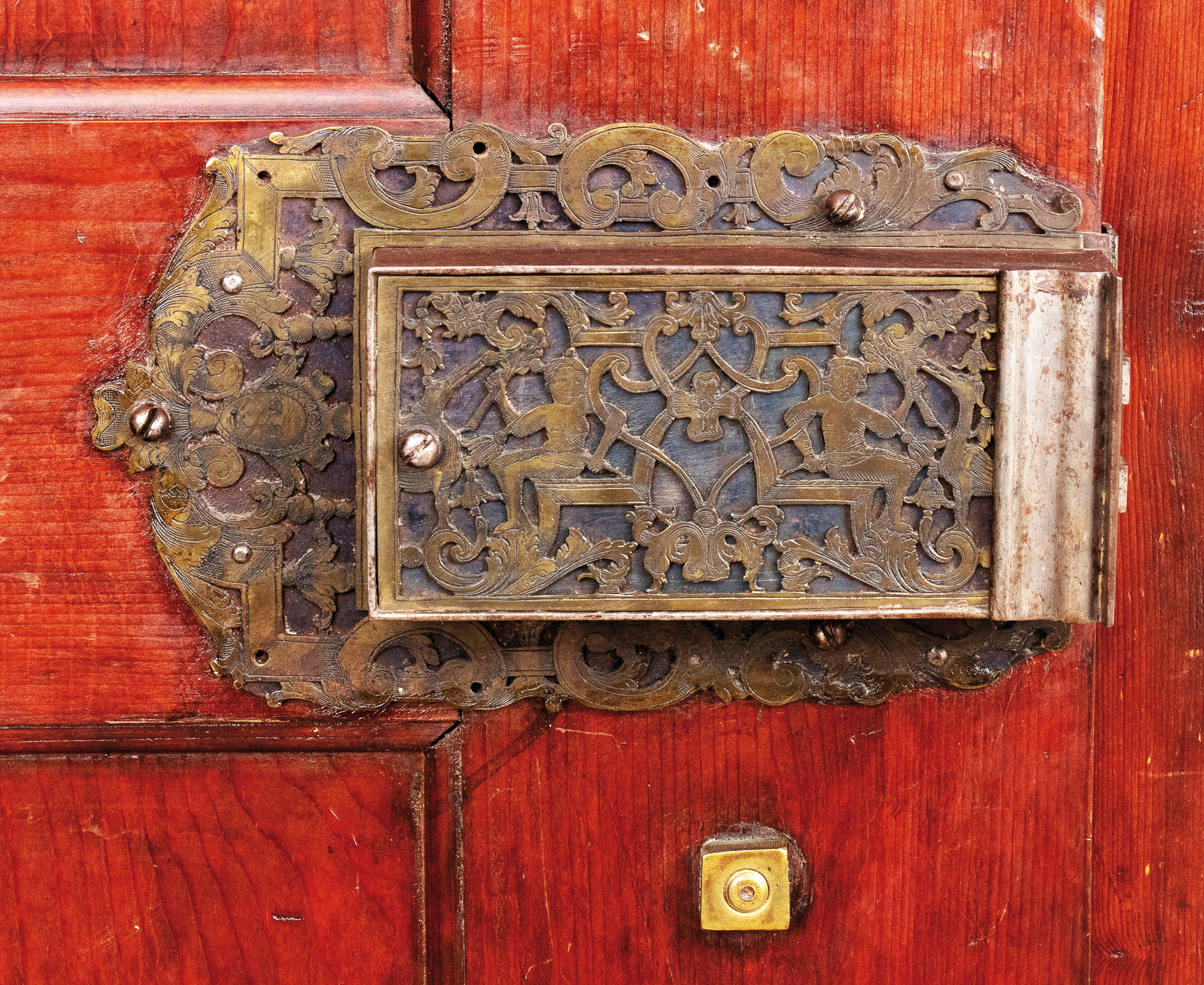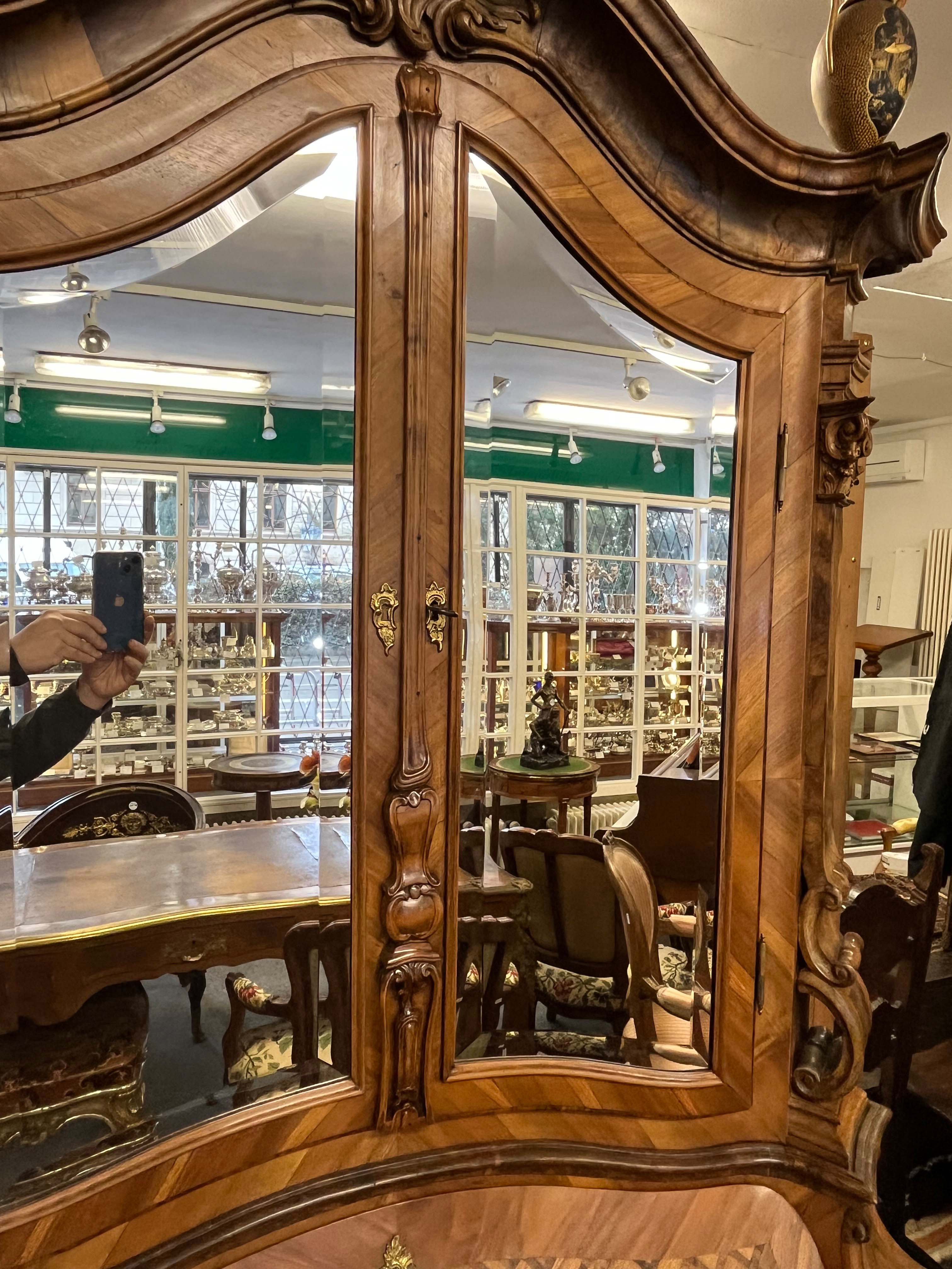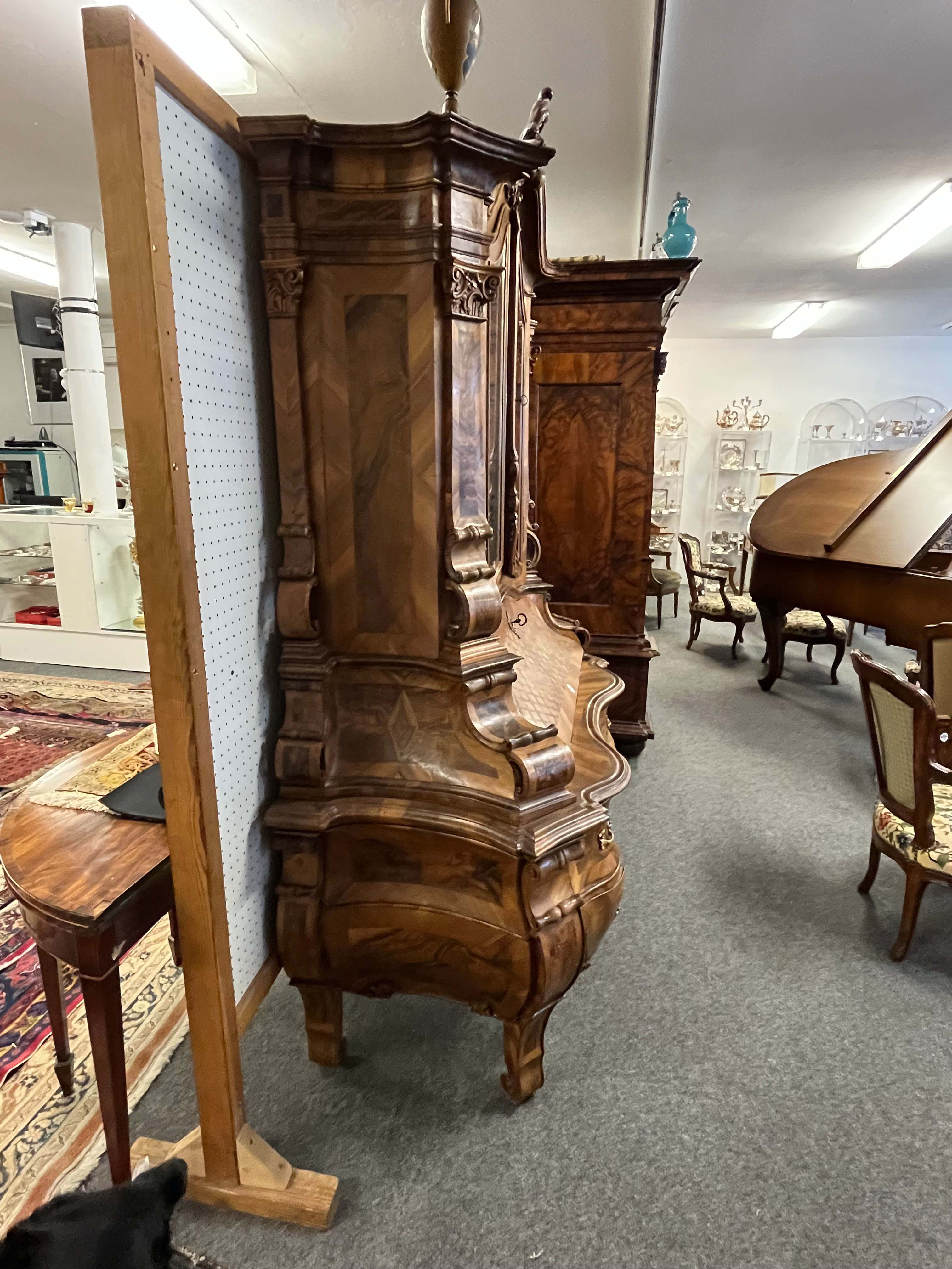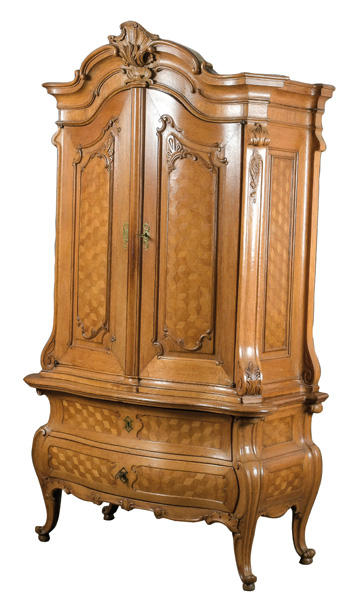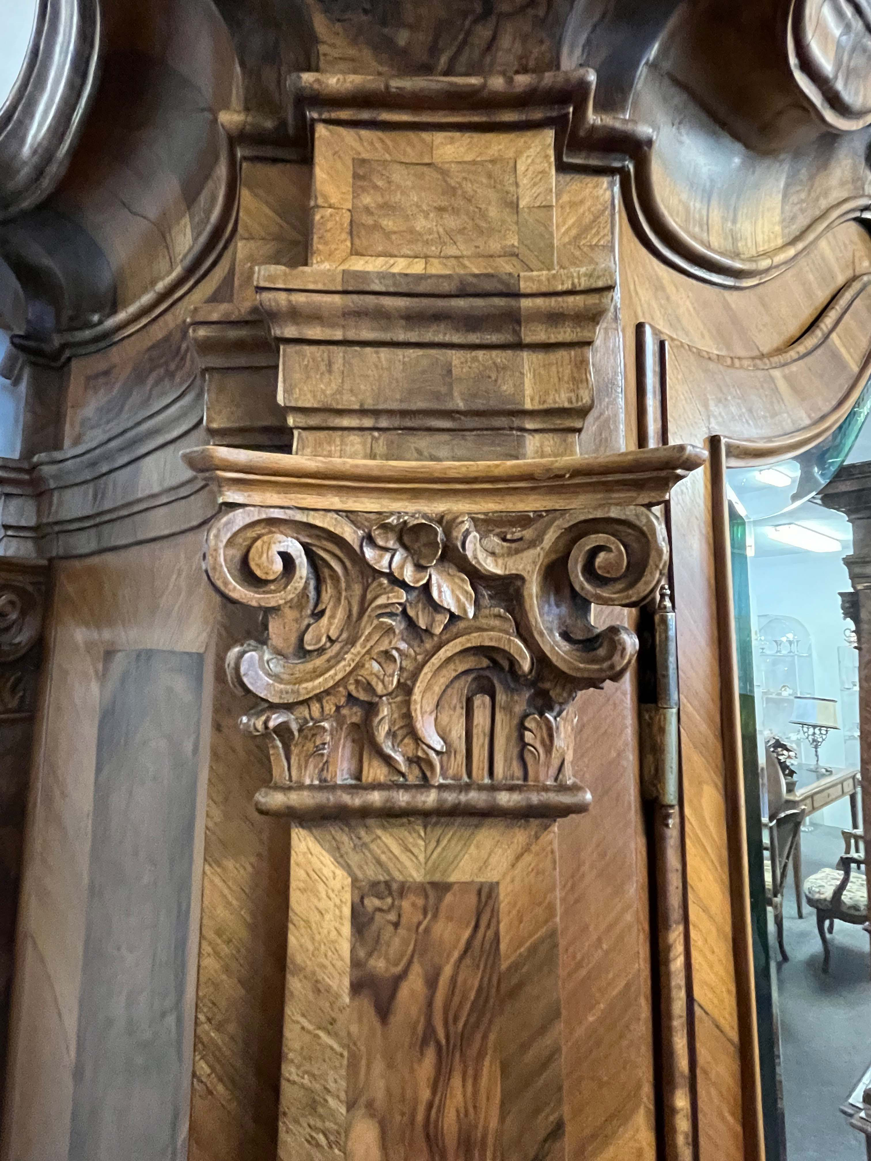 | Rechteckiger, zweitüriger Korpus mit zweischübigem Sockel auf gequetschten Ballenfüßen. Abgeschrägte Ecken mit korinthischen Pilastern mit Schnitzwerk. Türen aufwendig mit aufgesetzten Bastionsfüllungen, je bekrönt von gesprengtem Rundgiebel. Kopfteil meisterhaft profiliert und mehrfach verkröpft. Weichholz, furniert mit Nussbaum und Nussbaumwurzel, teilw. geschnitzt; Türbänder, Scharniere, Riegel und aufwendiges Kastenschloss aus fein geschmiedetem, gebleutem Eisen bzw. Messing. Unberührter Original-Zustand mit schöner Patina. Vgl. H. Kreisel / G. Himmelheber, „Die Kunst des deutschen Möbels“, Bd. II, Nr. 1073.