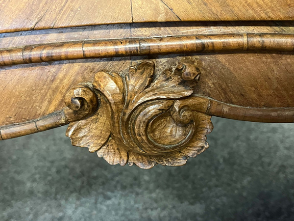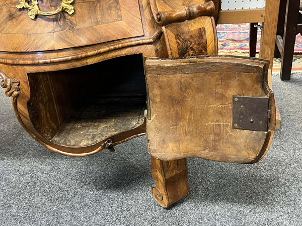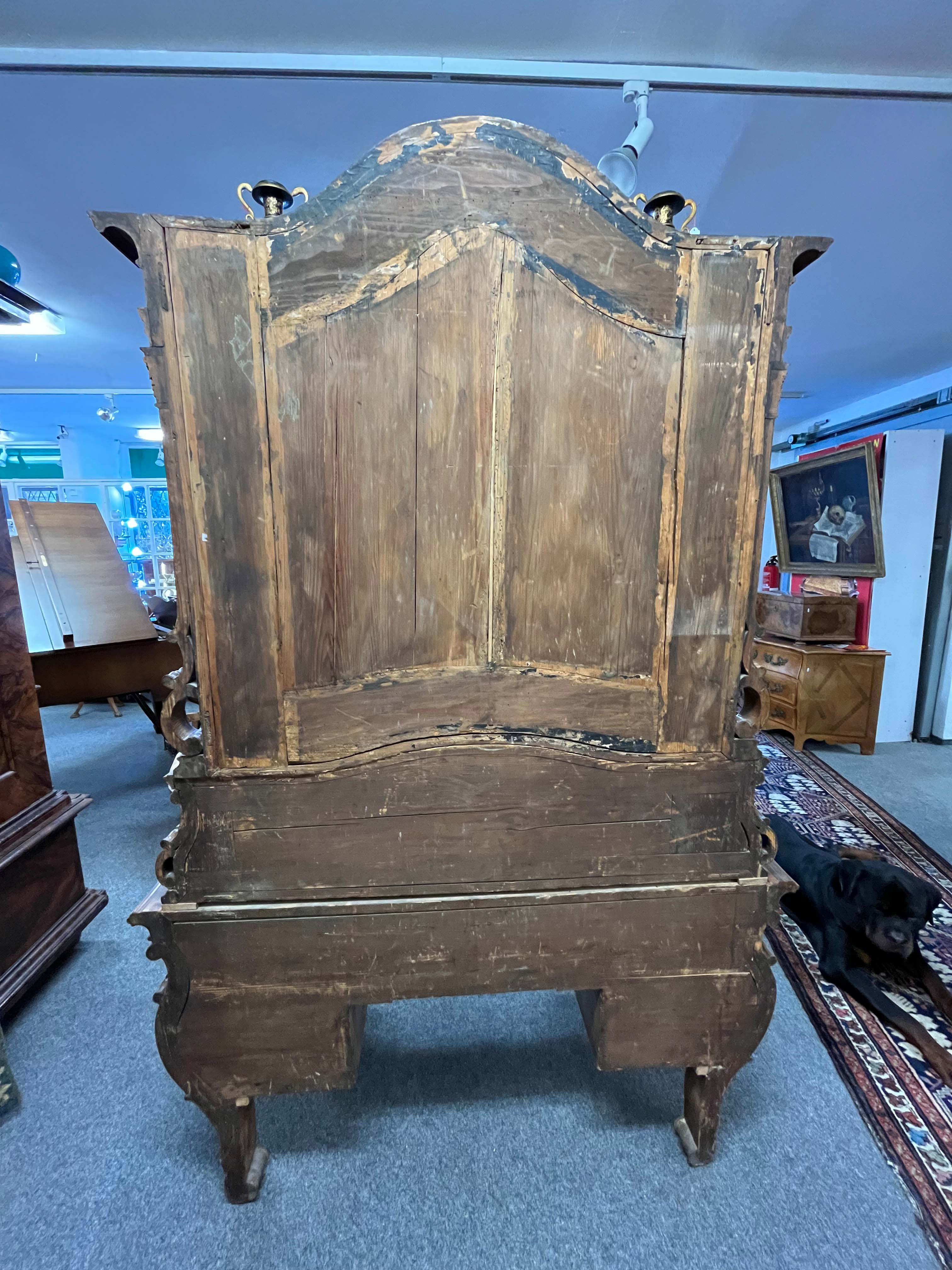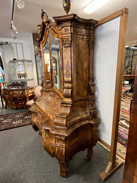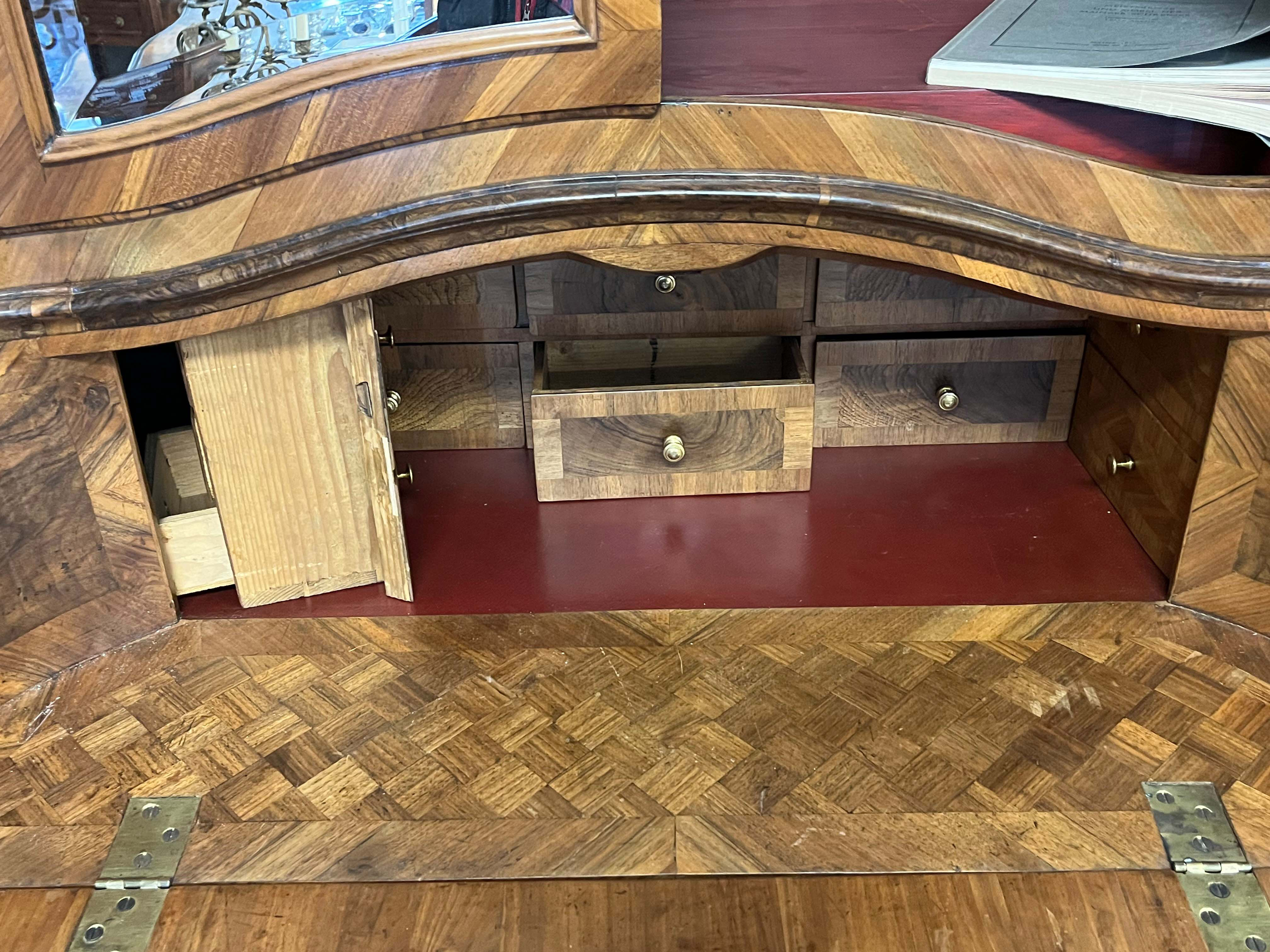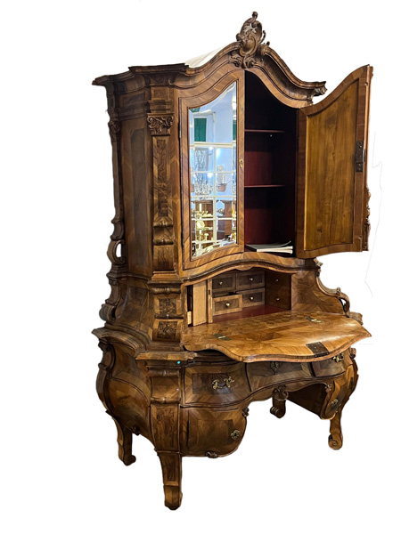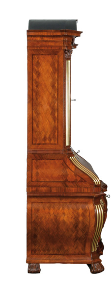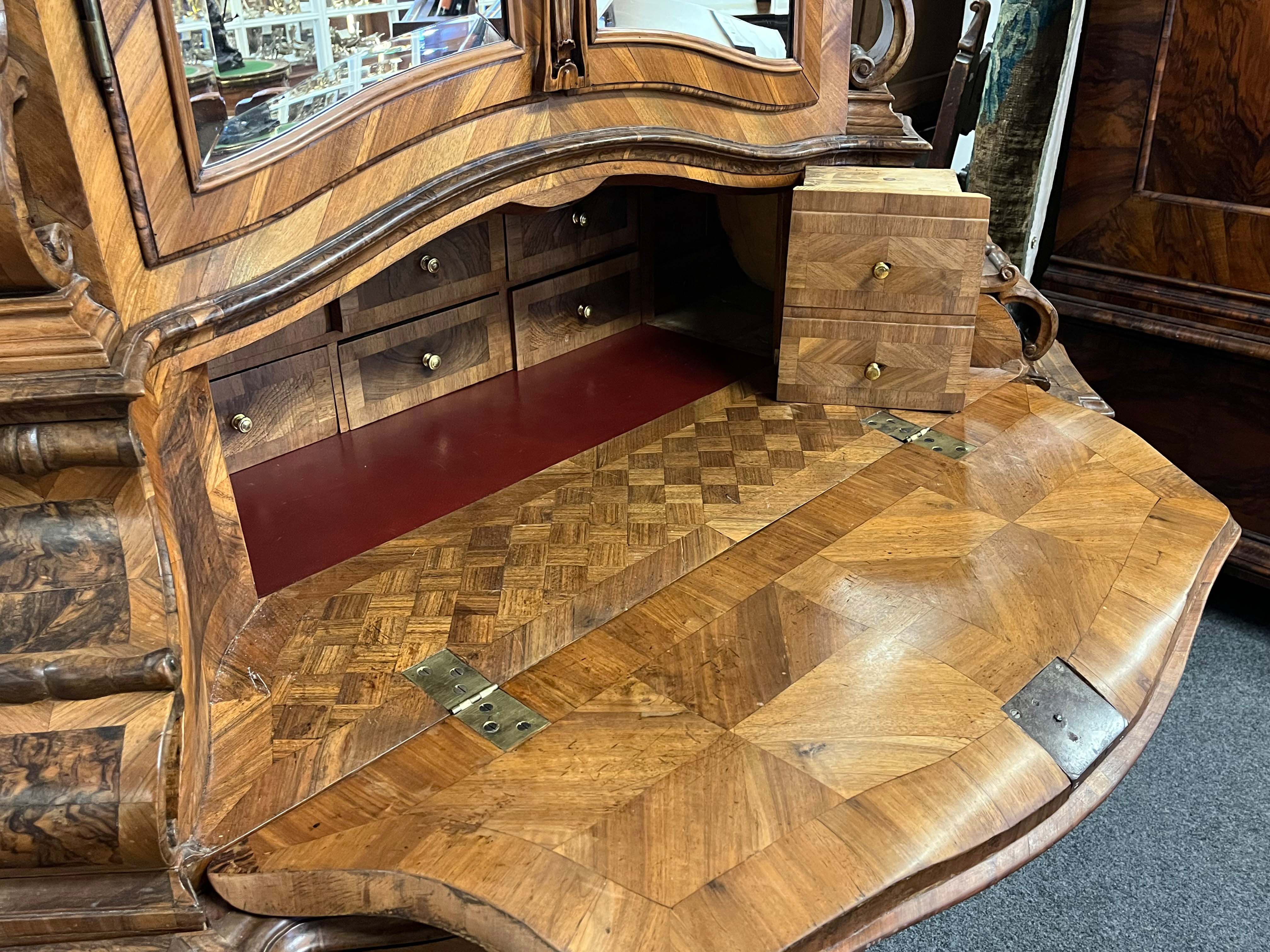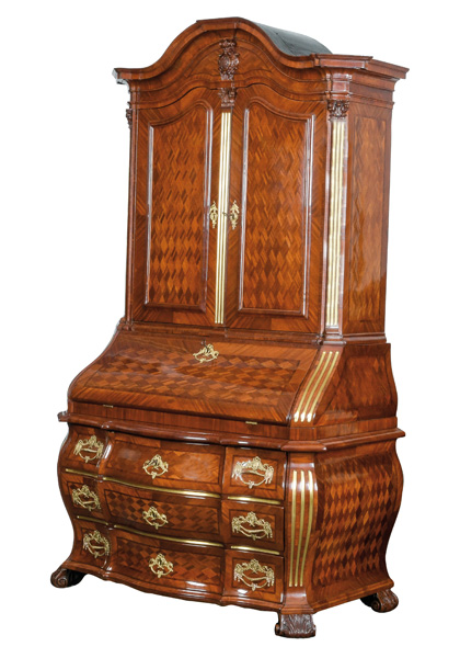 | Auf vier nach außen gestellten und sich nach unten verjüngenden Volutenfüßen stehend. Zweischübiges Kommodenteil mit geschweifter Zarge, abgeschrägten Kanten, gewellten Seiten und überstehender, profilerter Plattenkante mit abgerundeten Ecken. Zurückgesetzter, zweitüriger Aufsatz mit herausziehbarer, lederbezogener Schreibplatte an der Unterkante. Leicht gebogene Front mit den typischen Spangen an den Kanten und gerade Seiten, jeweils in Füllung gearbeitet. Hinter den Türen aufwendige Einteilung: Beinahe mittig plaziert ein durchgehender Schub, flankiert von je acht Schüben. Mittig unterhalb ein offenes Fach mit vier Schüben, der obere mit Geheimfach. Darüber herausziehbarer Tabernakel mit zwei Pilastern, korinthischen Kapitellen und dahinter liegenden Geheimfächern (Fachböden fehlen). Herausragendes, geschweiftes und mehrfach profiliertes Abschlußgesims mit geschnitzter Muschelkartusche. Massiv Eiche geschnitzt mit Rocaillen, Akanthus, Blattwerk, Muscheln und eingerollten Schnecken, teiilweise furniert mit Würfelmaketerie. Alle Schreinerarbeiten sind meisterlich ausgeführt. Das Möbel befindet sich in guten Zustand, hat eine schöne Patina und die Original-Schlösser und -Beschläge.