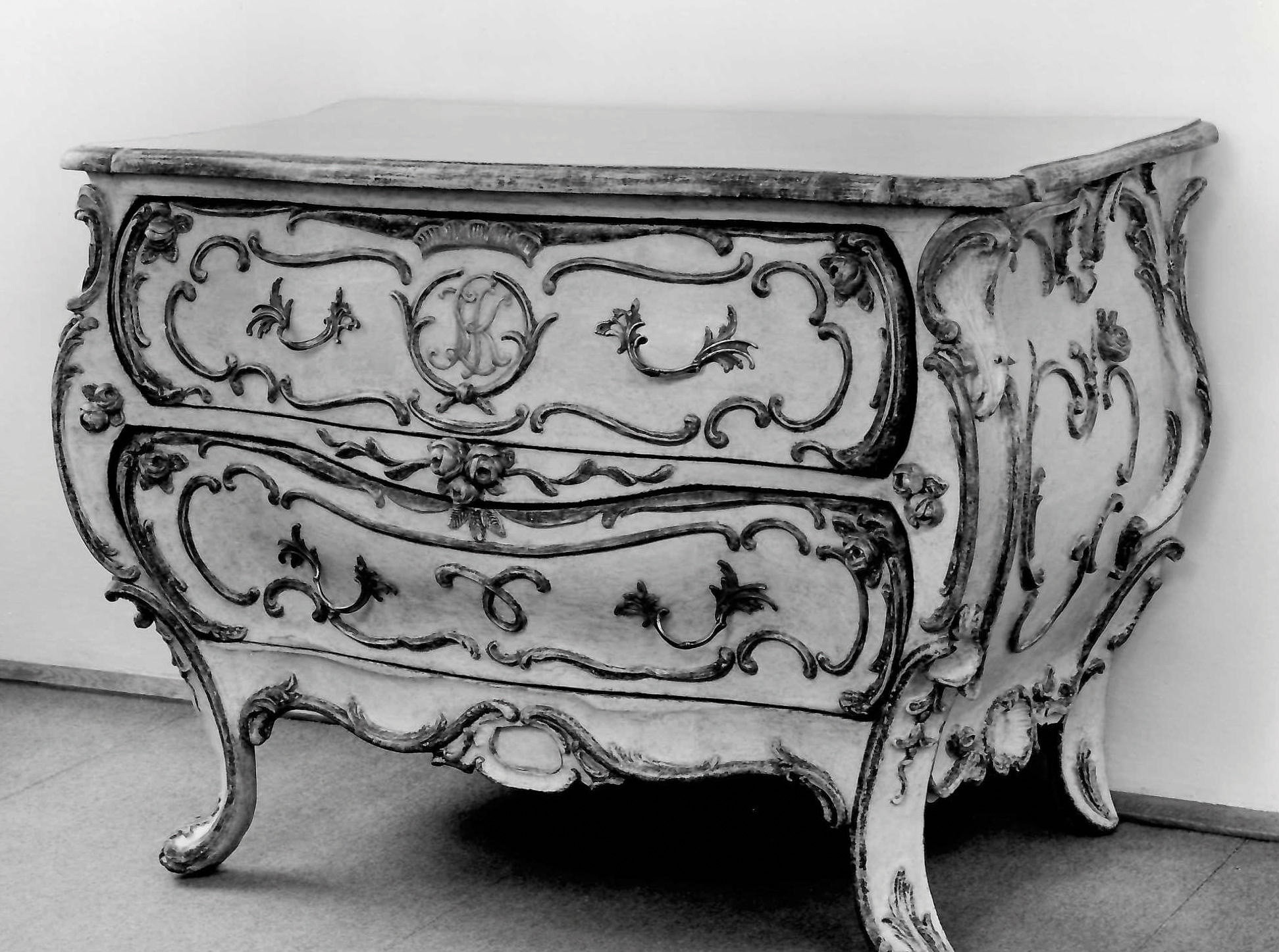 | Wohl nach einem Entwurf des Ferdinand Hundt (1703-1758) mit ligiertem Allianz-Monogramm „JS & CL“ unter Grafenkrone. Weichholz, geschnitzt, schieferweiß gefasst und in Gold und Silber gehöht. Dreiseitig geschweifte, profilierte und frontseitig über den Eckstollen gerundete Platte über virtuos geschweiftem, zweischübigem Korpus auf wellig ausgeschnittener Zarge und nach aussen geschweiften Beinen. Schöne Rokokovoluten in S- und C-Schwüngen umrahmen die schauseitigen Felder, Rosenblüten und Rankenwerk zieren den mehrfach bombierten Korpus. Die mittlereFronttraverse mit drei Rosen unter palmettenumrahmten Allianz-Monogramm, wohl „JS & CL“, darüber eine fünfblätterige Grafenkrone. Die Eckstollen aus drei C-Voluten geformt und fein geschnitzt, die Schmalseiten wiederum mit Rosen und Rankenwerk verziert. Fein ausgeformte florale Bronze-Handhaben.Provenienz: Aus fränkischem Adelsbesitz, mit ligiertem Besitzermonogramm „JS & CL“ (von Seinsheim?); Kunsthandel Fischer-Böhler, München 1950er Jahre;Privatbesitz.Die hier angebotene, in einem prächtigen Originalzustand erhaltene Rokokokommode gehört zu einer kleine Gruppe von besonders seltenen, schieferweiss gefassten Kommodenmöbeln, wie sie in Bamberg in der Zeit um 1755-1765 entstanden sind und wir sie in schönster Form in der aus Schloss Seehof stammenden sogen. «Nacht-Kommode» - ehemals fürstbischöfliches Schlafzimmer - her kennen, einem Prunkmöbel, das sich heute im Metropolitan Museum in New York befindet (Nr. 1974.356.129). In ihrem Buch über das Bamberger Hofschreinerhandwerk, bildet Sigrid Sangl unsere Kommode mit Grafenkrone zusammen mit der Kommode aus demMetropolitan Museum ab und datiert letztere um 1760. Aus stilistischen Gründen, ist eine Datierung unserer Kommode in die Zeit um 1755/60 sinnvoll. Beiden Kommoden gemeinsam sind ihre organische Gestaltung mit ihren wulstartigen Ziervoluten, welche die Kommodenflächen elegant rahmen. Es sind diese Wulstformen, welche wir in so ähnlich dominanter Form etwa an den Kassettenfüllungen der Wandschranktüren im 1. Obergeschoss in Schloss Seehof vorfinden und die in die Zeit um 1755 zu datieren sind, einer Zeit, als die massgeblichen Gestaltungen der fürstbischöflichen Wohnräume unddes Festsaals durch den Bamberger Fürstbischof Johann Philipp Anton von und zu Frankenstein (1695-1753) weitestgehend abgeschlossen und später durch Adam Friedrich von Seinsheim (1708-1779) vervollständigt und besonders in der Parkgestaltung verfeinert wurden. In den 1950er Jahren begann der Ausverkauf der mobilen Ausstattung von Schloss Seehof, bei Bamberg durch den berühmten, aus Bamberg gebürtigen, MünchenerKunsthändler Karl Fischer (1889-1973), Inhaber der Kunsthandlung Fischer-Böhler. Fast die vollständige Möblierung dieses oberfränkischen Schlosses – ein Juwel, welches den Krieg wie ein Wunder im Innern wie im Äussern fast gänzlich unbeschadet überstanden hatte - wurde durch die damals führende Münchener Kunsthandlung an eine bedeutende Kundschaft und hauptsächlich in die USA veräussert. Unter den Möbeln befanden sich etwa die berühmte Treillage-Garnitur des sogen. Frankenstein-Salett, ein eigentlicher Höhepunkt des deutschen Rokokos, aber auch Kommoden, Sitzbänke, Konsolen, Spiegel und sogar ein Grossteil der Gartenskulpturen von Ferdinand Dietz. Der Verkauf der hier angebotenen Kommode an Karl Fischer-Böhler ist in den zeitlichen Zusammenhang mit den Seehof-Verkäufen einzuordnen, welche abcirca 1955 durch Fischer-Böhler abgewickelt wurden. Die Seehof-Verkäufe wurden in den 50er Jahren in der Presse ausführlich kommentiert und von bedeutenden Kunsthistorikern, allen voran Prof. Dr. Heinrich Kreisel (1989-1975), scharf kritisiert. Zukünftiger Forschung wird es gelingen, nachzuweisen, welche fränkische Adelsfamilie als Auftraggeber unserer seltenen und charaktervollen Kommode in Frage kommt. Nach den grossen Verlusten der 50er Jahre, nimmt unsere Bamberger Kommode eine umso herausragendere Stellung unter den wenigen erhaltenen weißgefassten höfischen Kommoden Oberfrankens und Bayerns ein.Vgl. Sigrid Sangl, „Das Bamberger Hofschreinerhandwerk im 18. Jahrhundert“, München 1990, S. 109 mit Abbildung der hier angebotenen Kommode und Abb. 105 für die Seehofer Kommode im Metropolitan Museum of Art, New York;Prof. Dr. Heinrich Kreisel, „Der Untergang der Garten- und Raumausstattung des Schlosses Seehof“, in: Schöne Heimat, Jg. 48, H. 1/ 2 , München 1959; Sigrid Sangl, „Das Bamberger Hofschreinerhandwerk“, München 1990, Nr. 109, id. abgebildet.