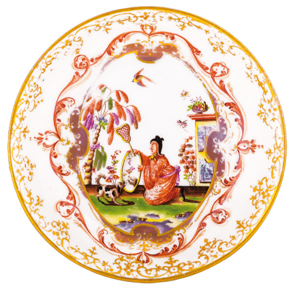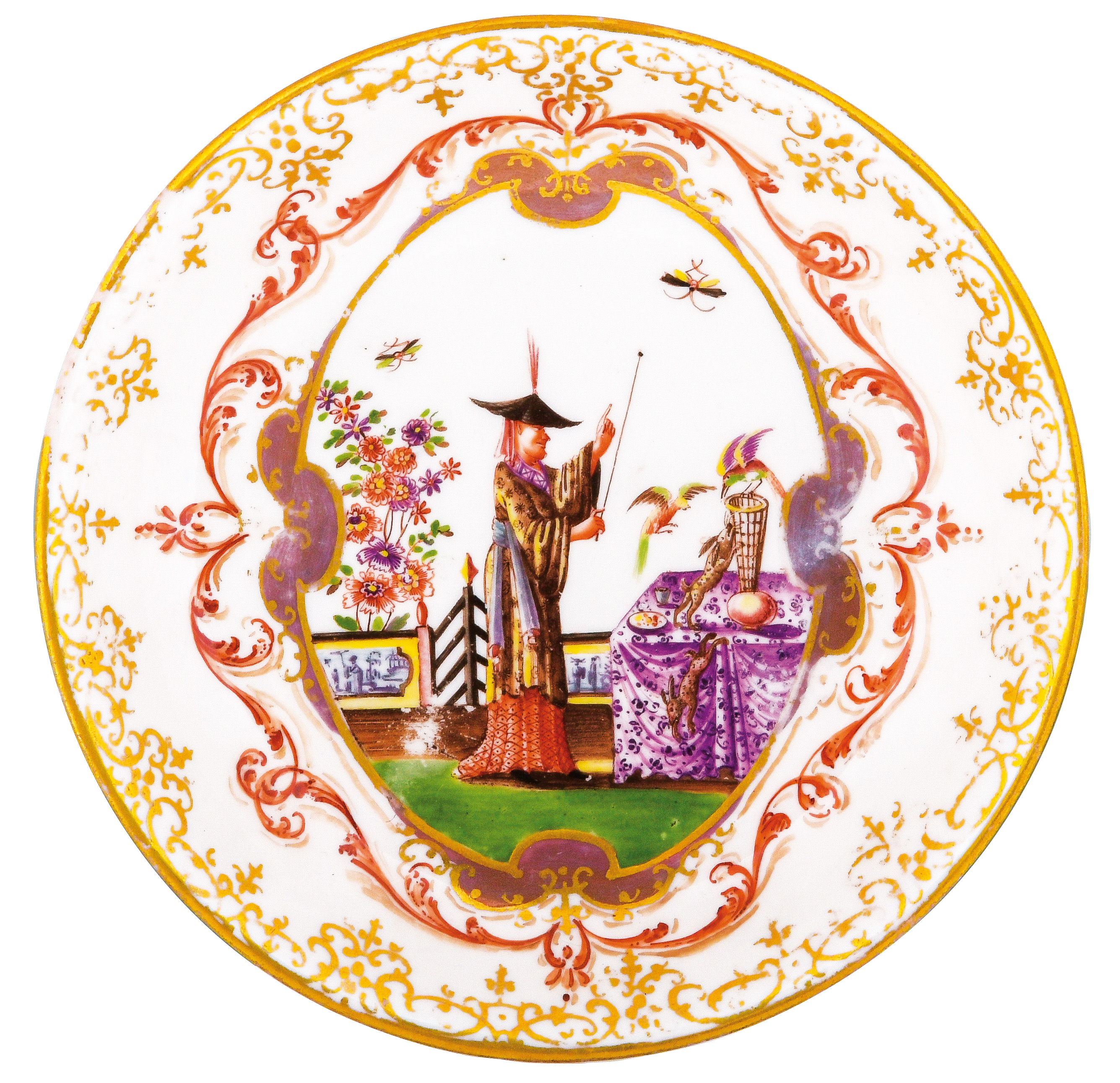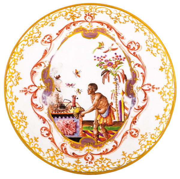 | Gemuldet, mit steigender Fahne und Goldspitzenbordüre. Spiegel mit Goldspitzenkartusche, unterlegt mit Böttgerlüster und umsäumt von korallenroten Blattranken. Reserve exzellent bunt bemalt mit stehendem Afrikaner, Papageien und Insekten in Landschaft. Weißes Böttgerporzellan, ohne Marke, verso Goldziffer „4.“. Vgl. R. Rückert 1966, Taf. 44, Nr.140ff.