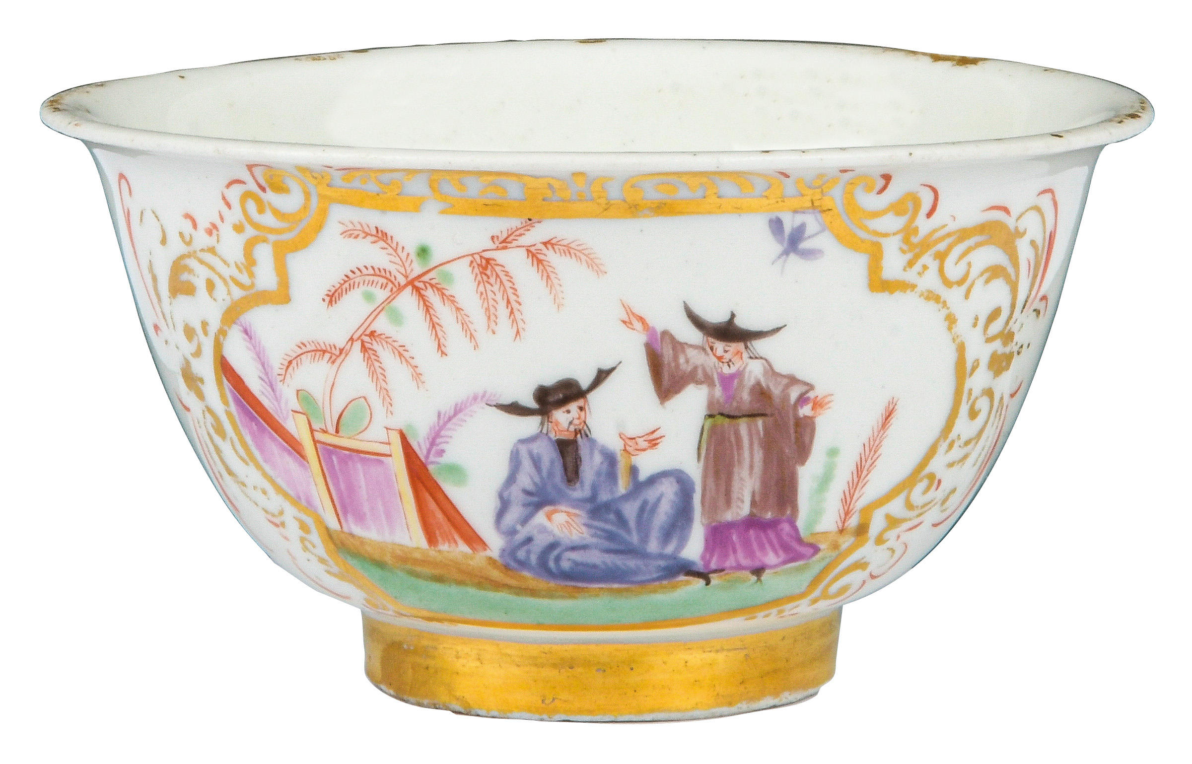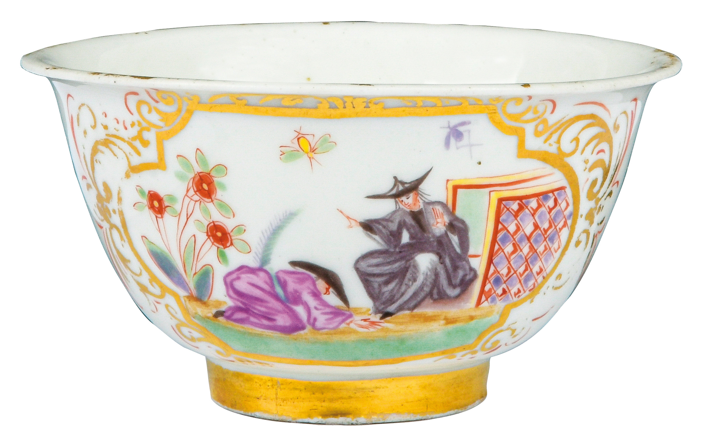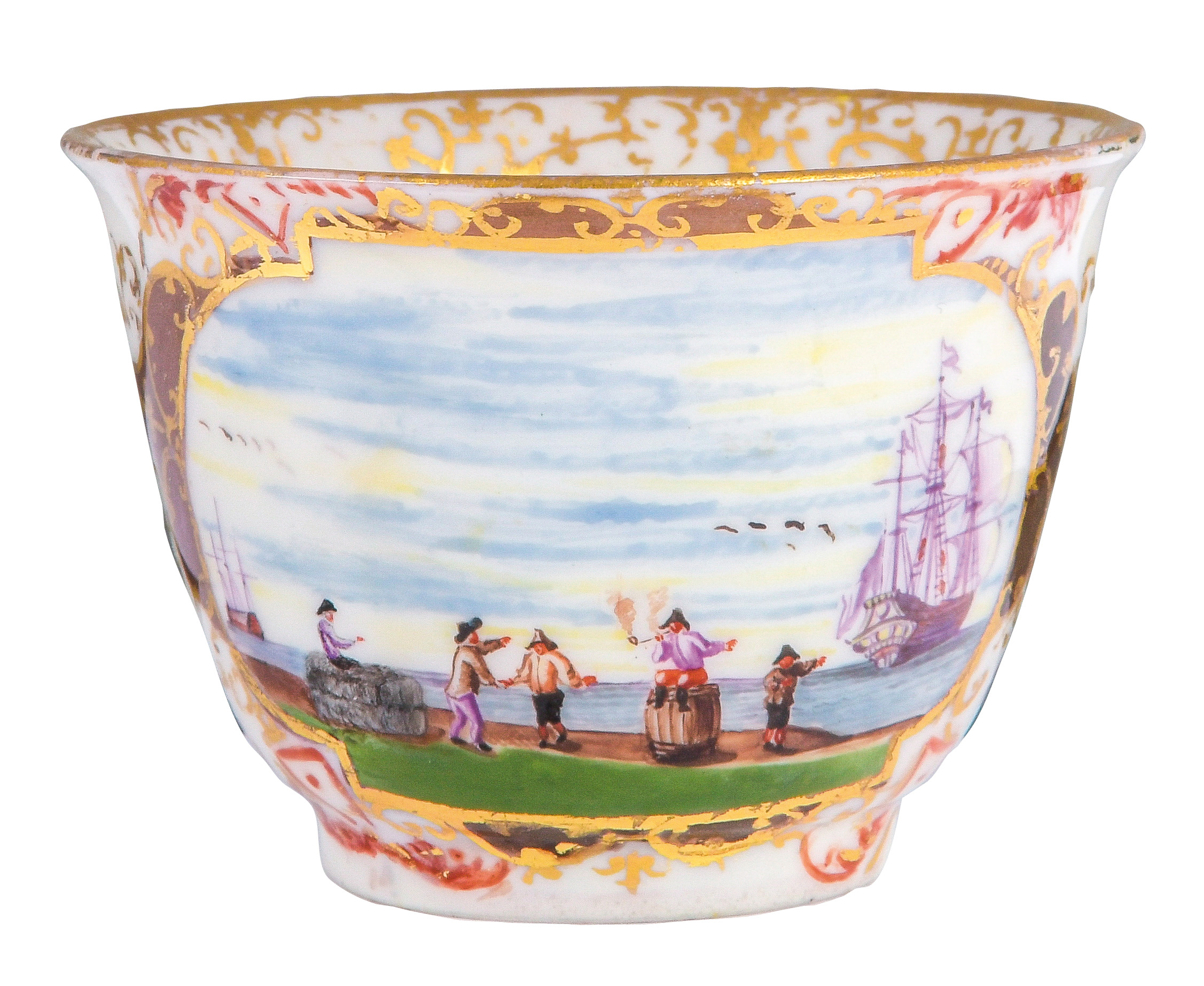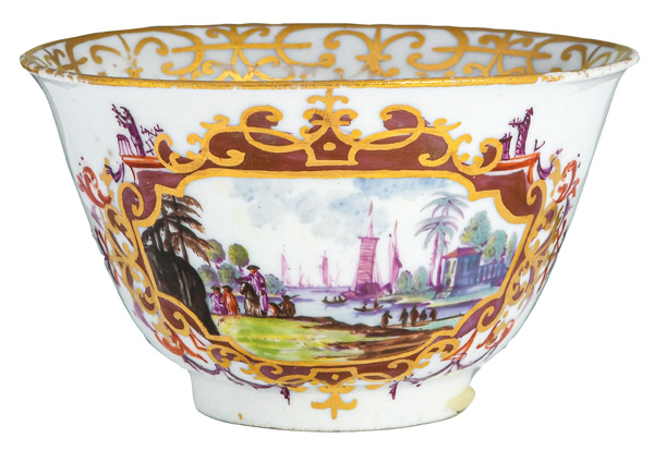 | Walzenförmig, sich nach unten verjüngend mit überlappendem Lipppenrand und Goldspitzenbordüre. Schauseite bunt bemalt mit Kauffahrteiszenerie in Goldspitzenkartusche mit Böttgerlüster, korallenrot gesäumt. Verso bunt bemalt mit Kakiemonblütenzweigen. Weißes Böttgerporzellan, ohne Marke. Malerei Umkreis von Johann Gregorius Hoeroldt. Vgl. R. Rückert 1966, Taf. 43, Nr. 133ff.