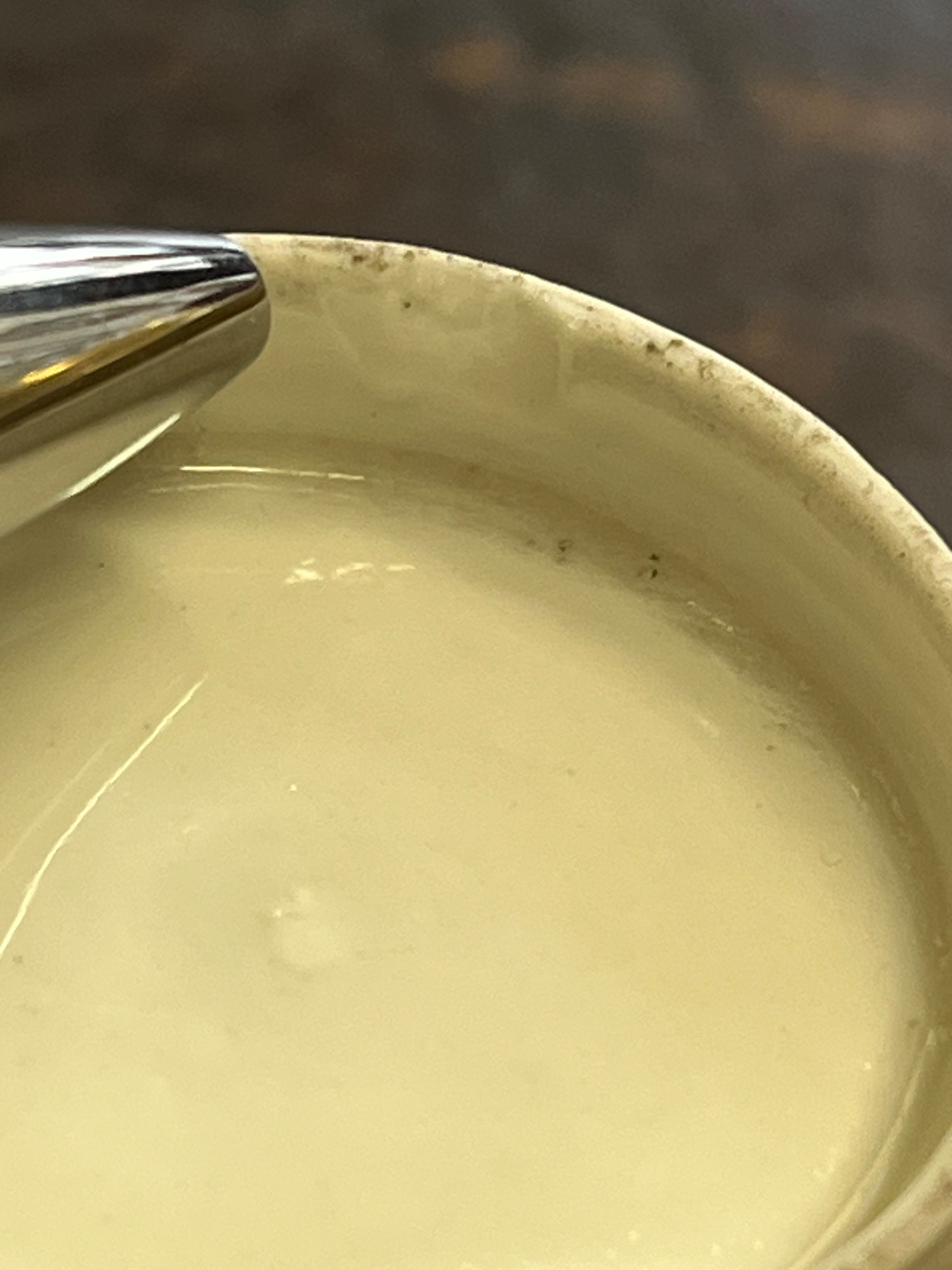 | Walzenförmig, sich nach unten verjüngend mit überlappendem Lipppenrand. Schauseiten bunt bemalt mit Chinoiserien in Goldspitzenkartuschen. Weißes Böttgerporzellan, ohne Marke. Hausmalerei von Sabina Auffenwerth.