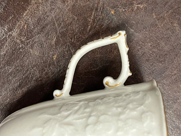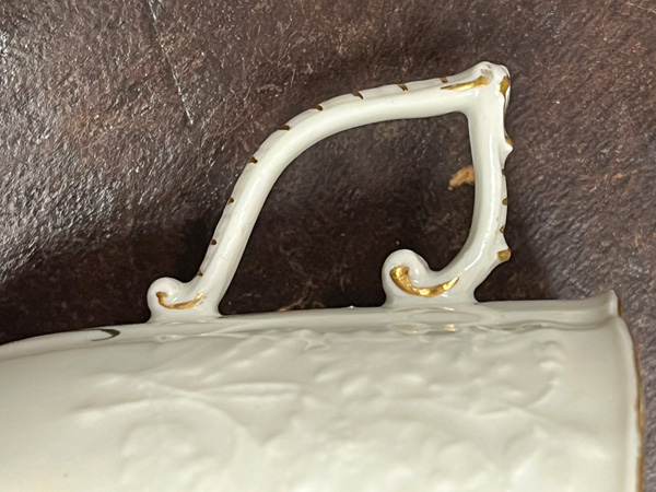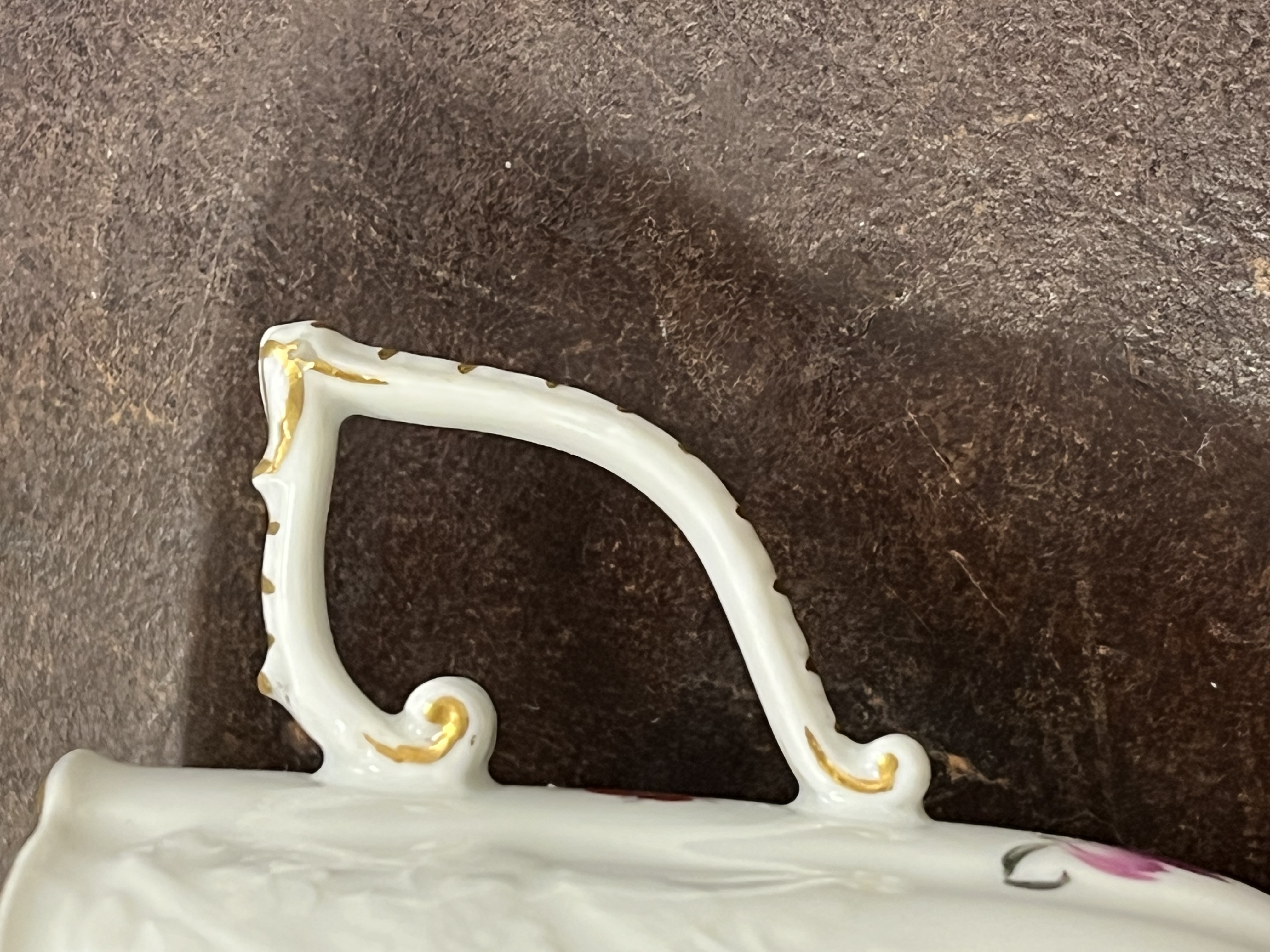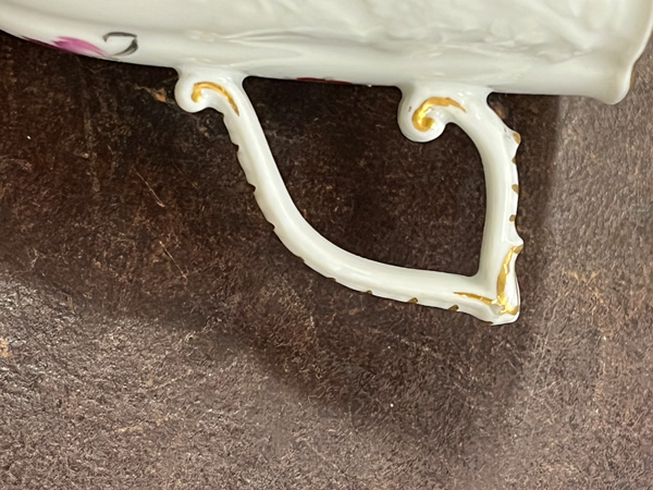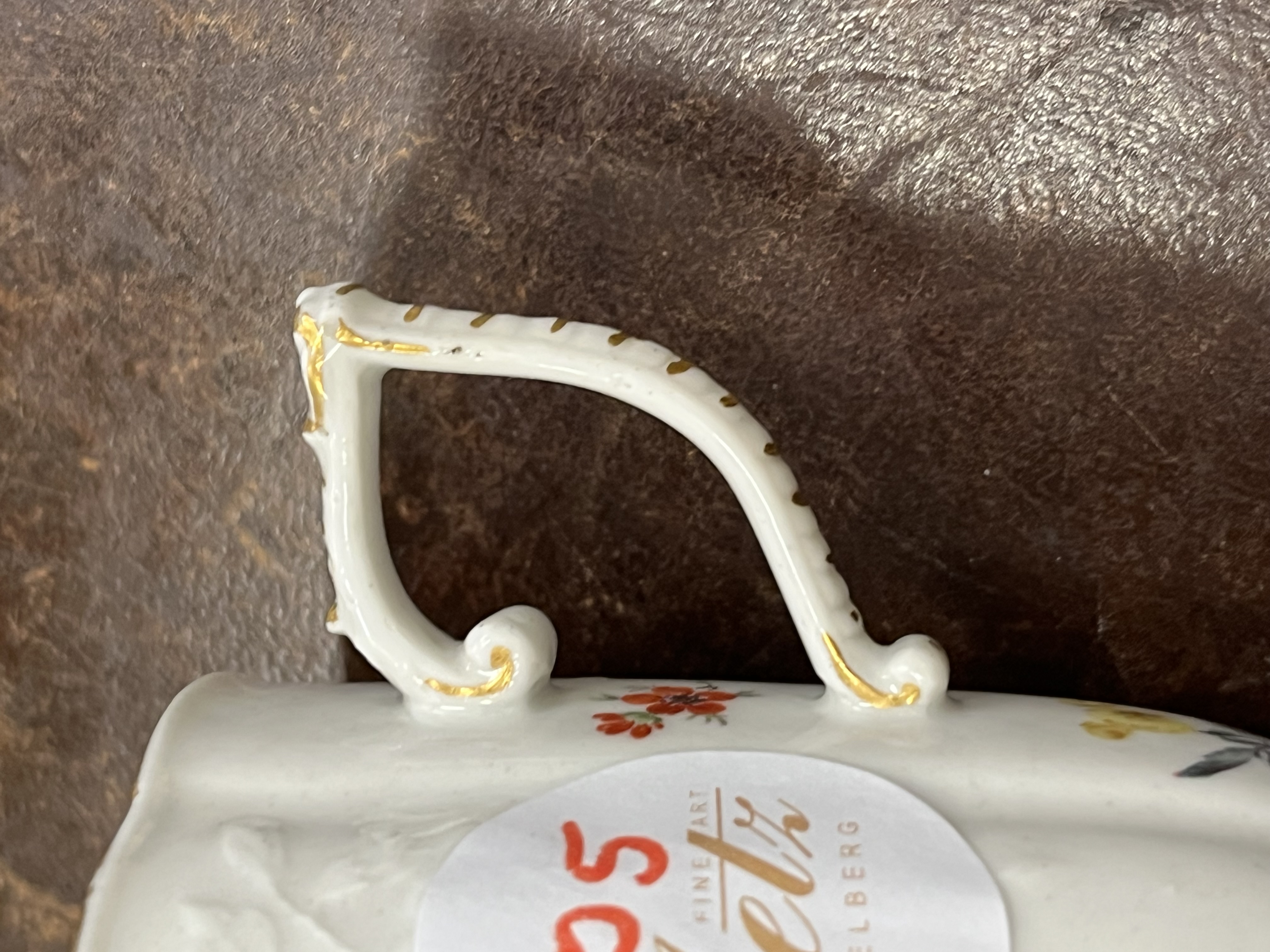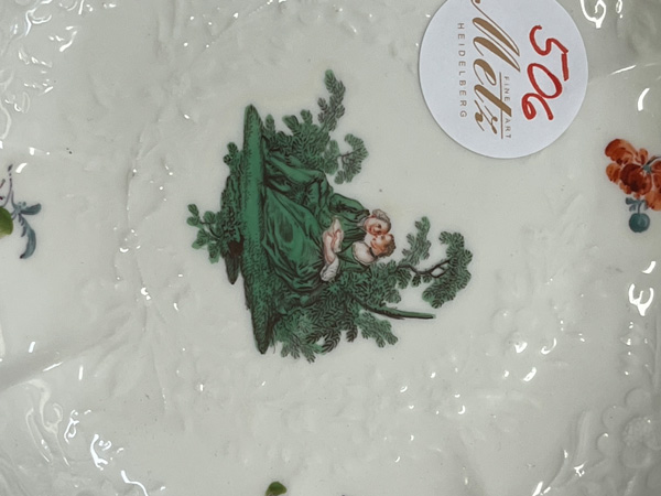 | Schauseiten mit floralem Reliefdekor „Dulong“. Freiräume kupfergrün bemalt mit Watteauszenerie und bunt bemalt mit Streublumen, Ränder gold gesäumt. Porzellan, am Boden unterglasurblaue Schwertermarke sowie purpurn „CHC“ (Cönigliche Hof Conditorei).