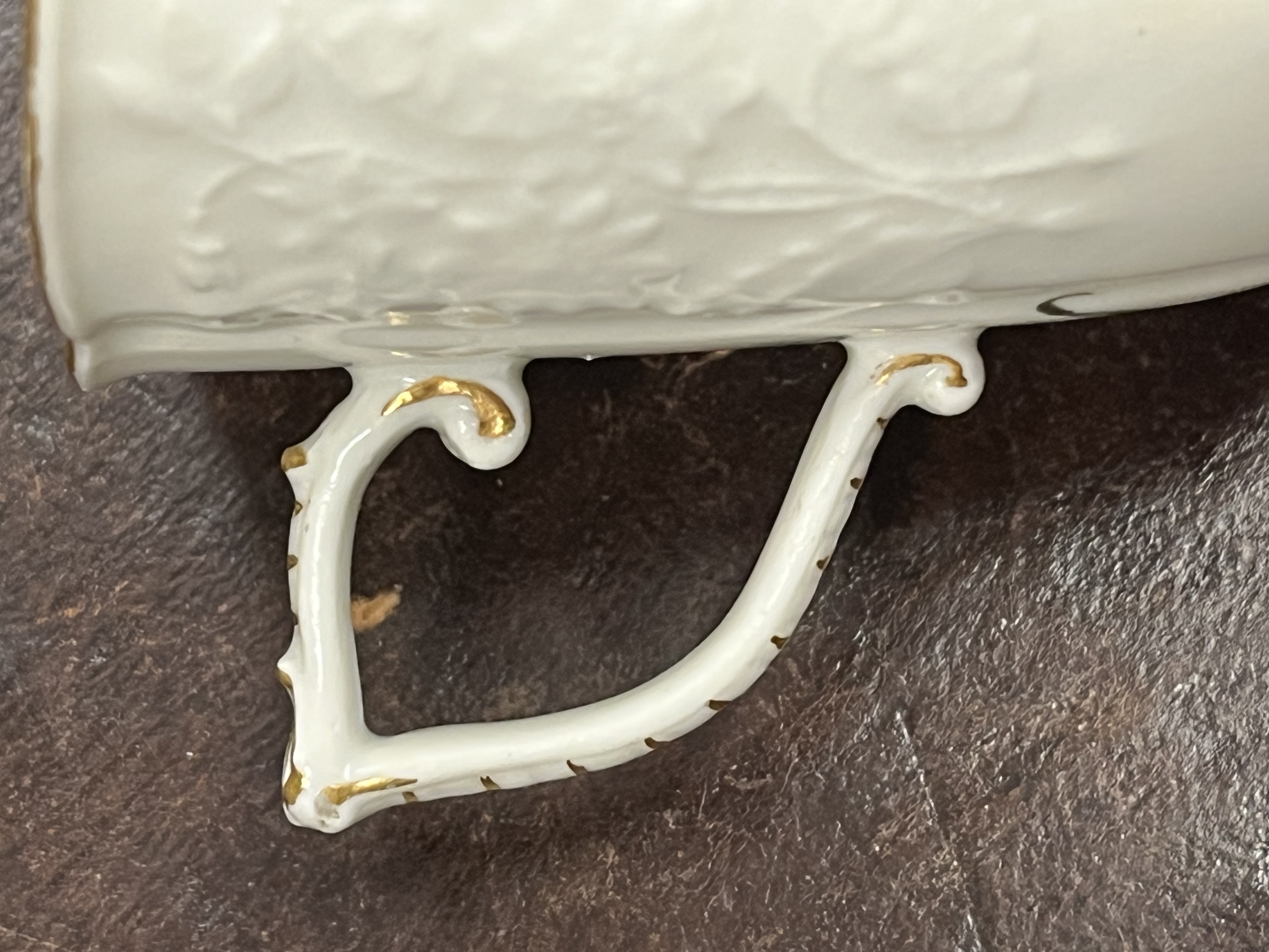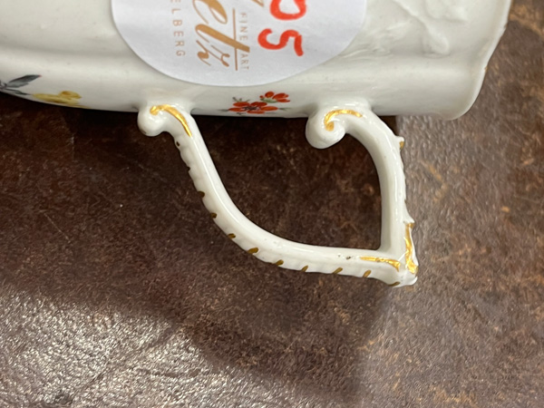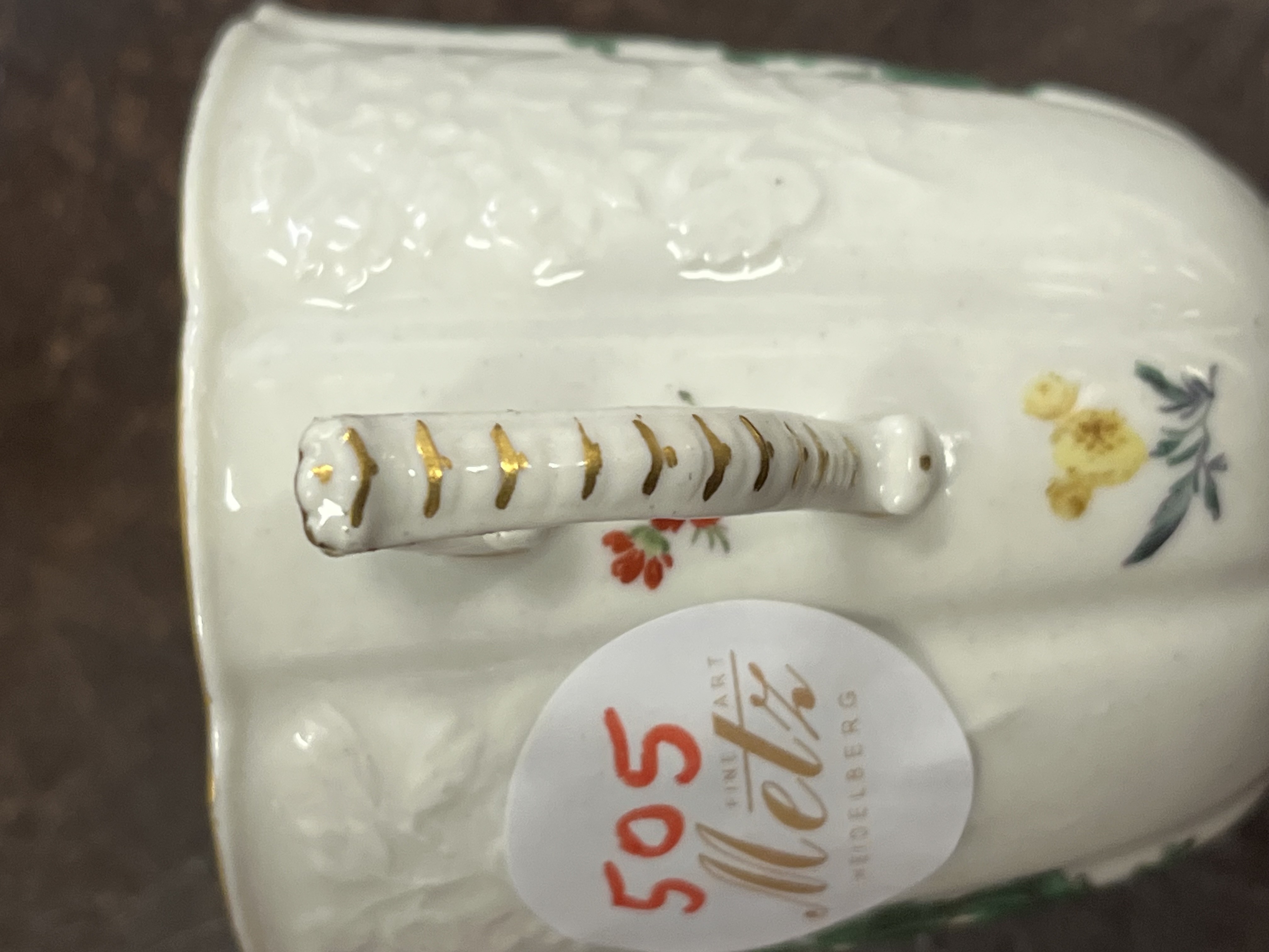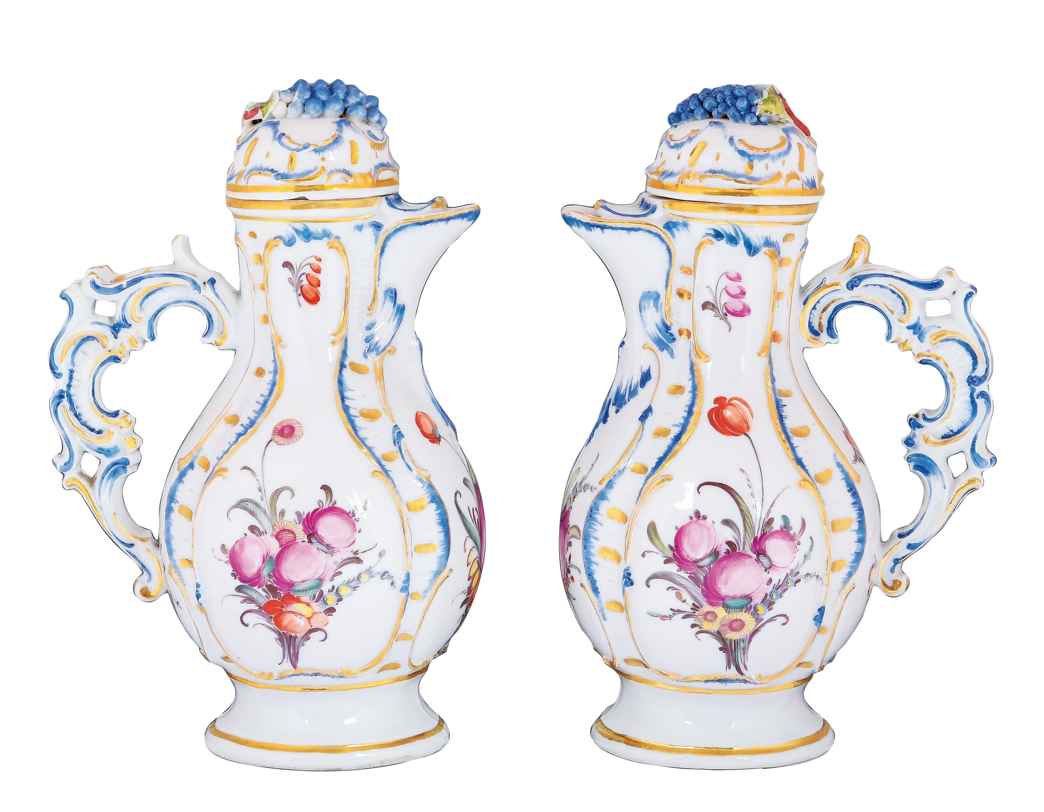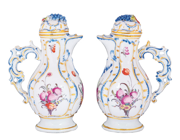 | Je birnförmig, auf rundem, eingeschnürtem Standring. Aufwendig rocaillemodellierter, durchbrochener Henkel und kurze, V-förmige Schnaupe. Gewölbter Deckel, bekrönt von roten Weintrauben. Wandung aufwendig roccaillemodelliert, blau und gold gesäumt. Freiräume bunt bemalt mit Floraldekor. Porzellan, ohne Marke, am Boden Ritzzeichen „9L“ oder „76“. Malerei Umkreis Joseph Zächenberger. (unwesentlich min. best.)