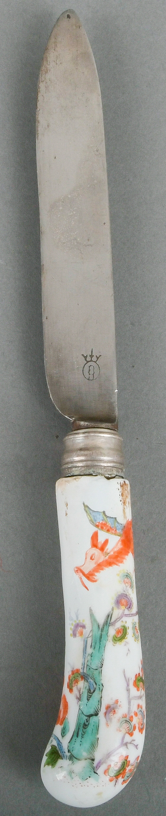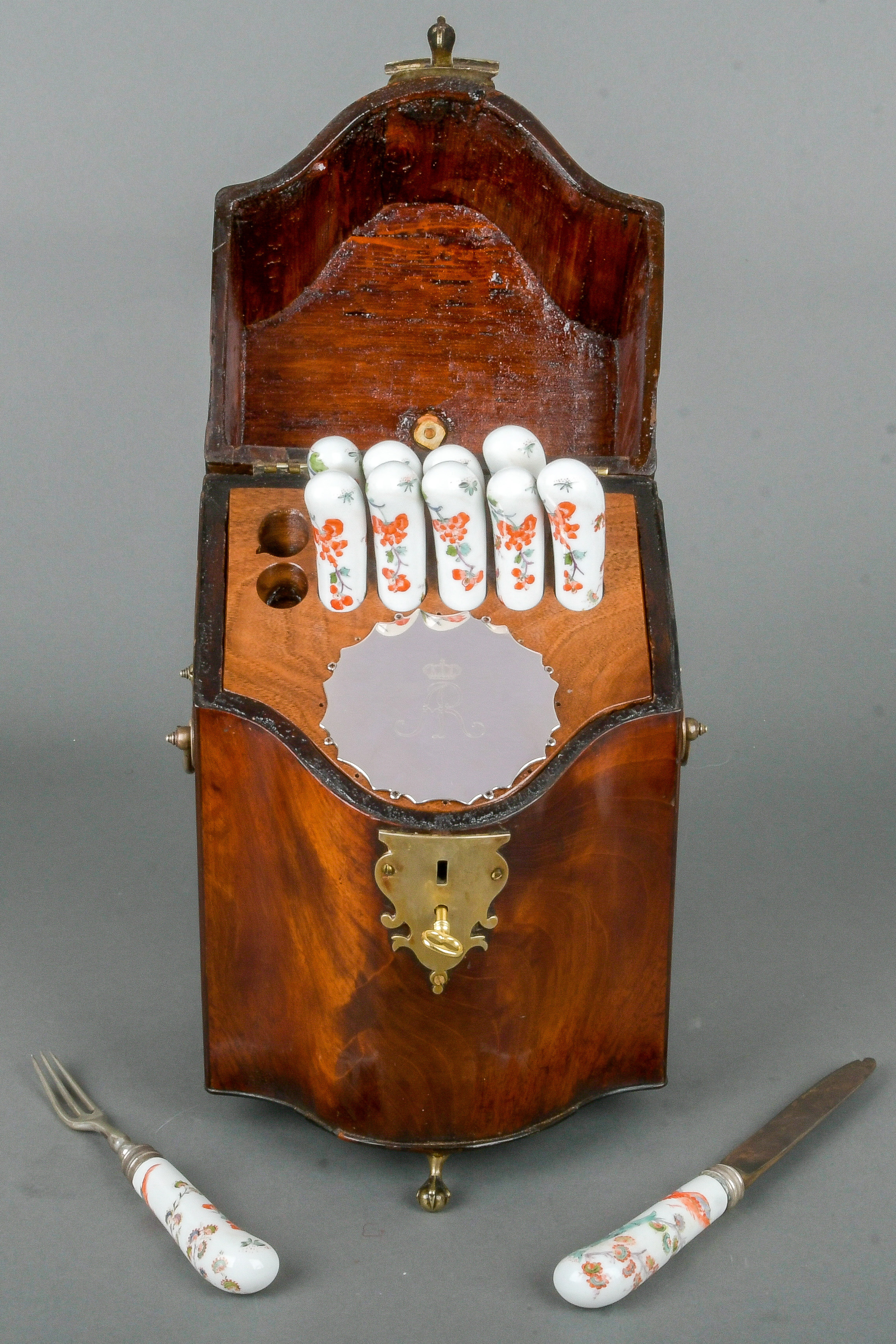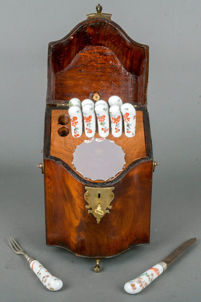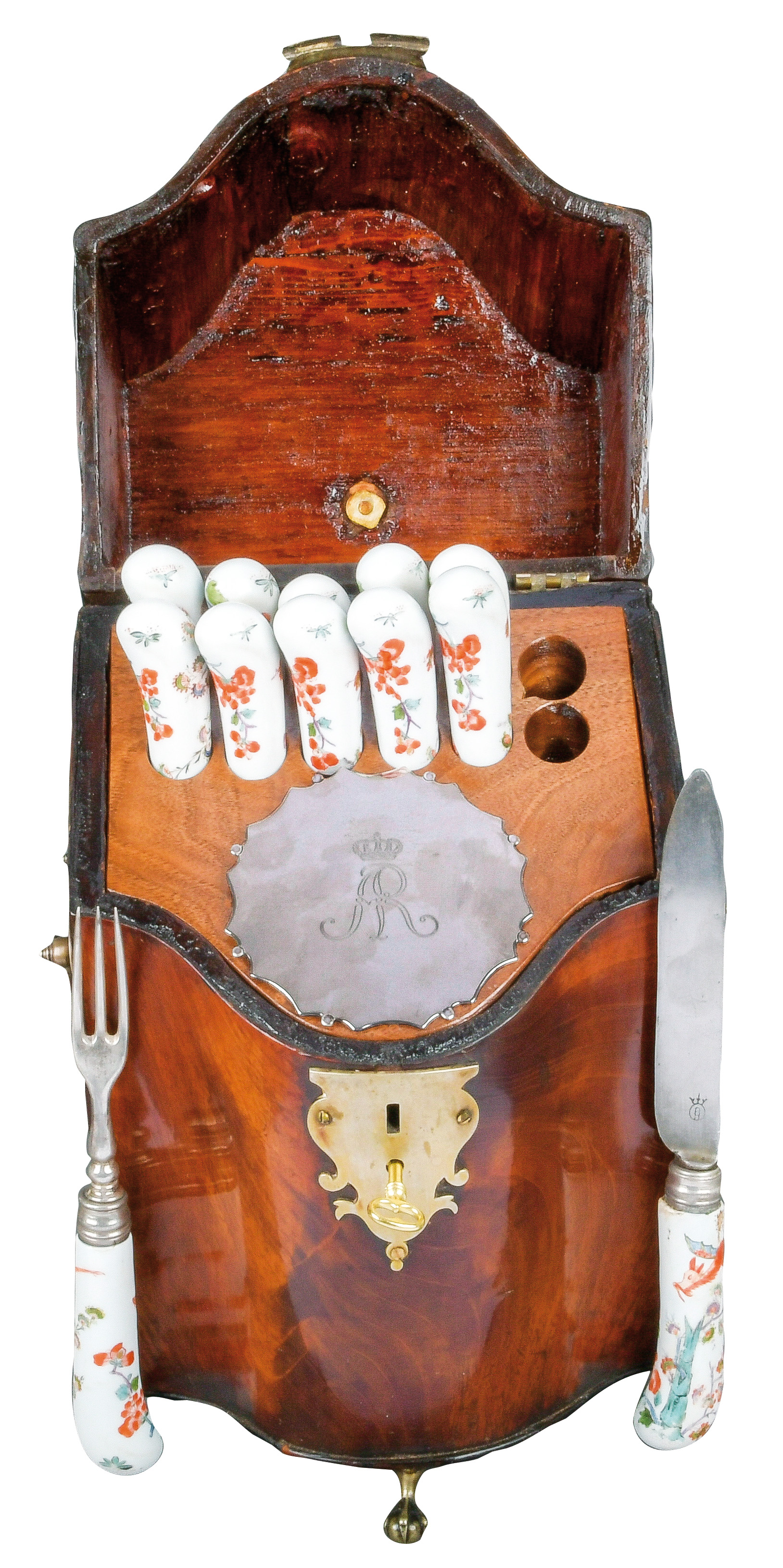 | Je mit Porzellan-Pistolengriff, bunt bemalt mit asiatischen fliegenden Drachen und Kakiemonblütenzweigen. Bestehend aus: Sechs Messer und sechs Gabeln mit Zinken und Klingen aus Eisen und Silbermanschette. Geschweifter Mahagoni-Besteckkasten auf Messingfüßen. Innen die eingesteckten Besteckteile. Unterhalb eine runde Silberplakette mit dem ligierten Monogramm „AR“ mit Krone.