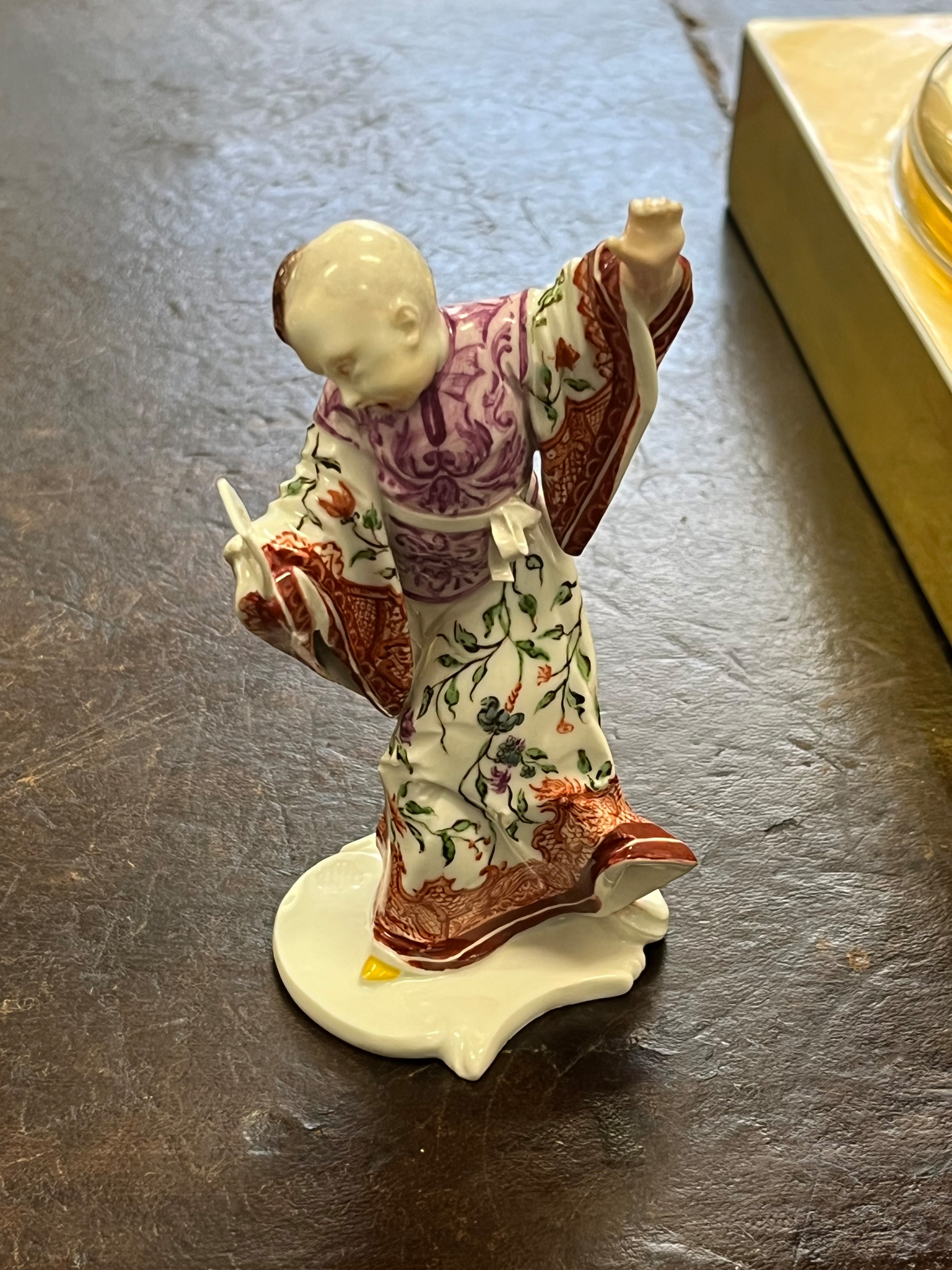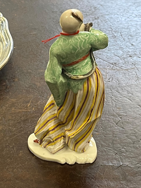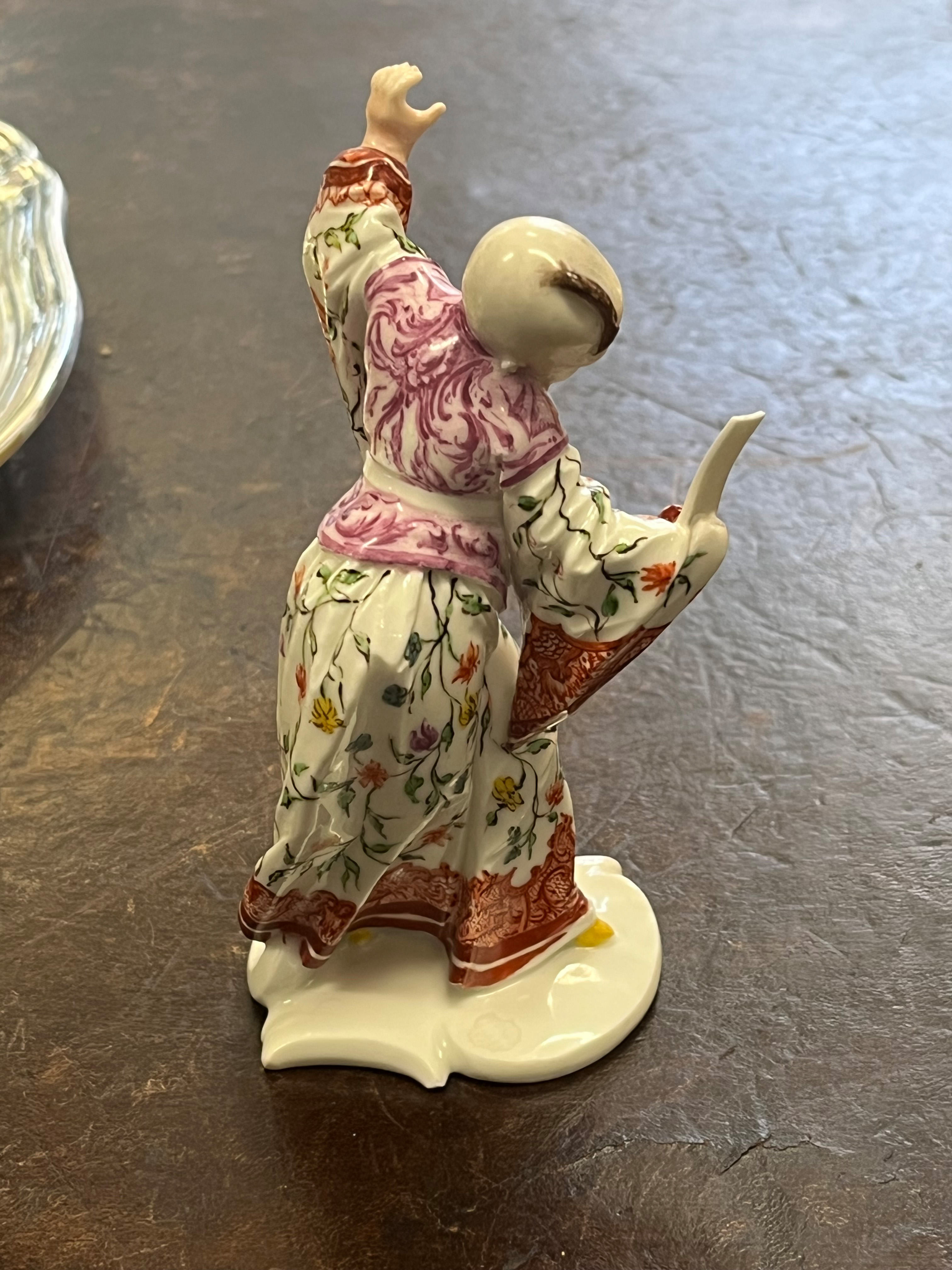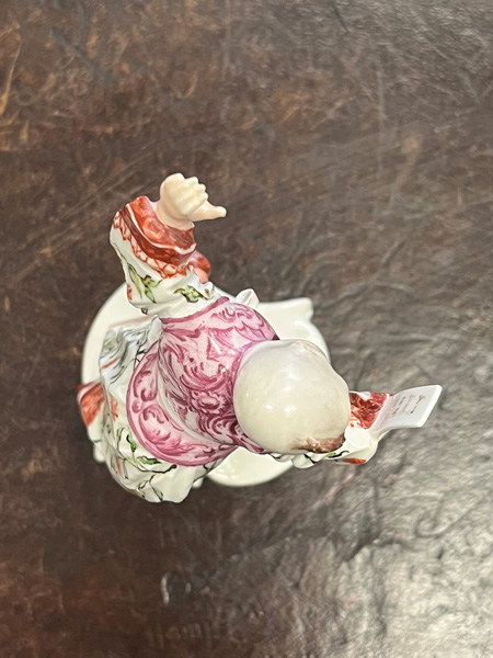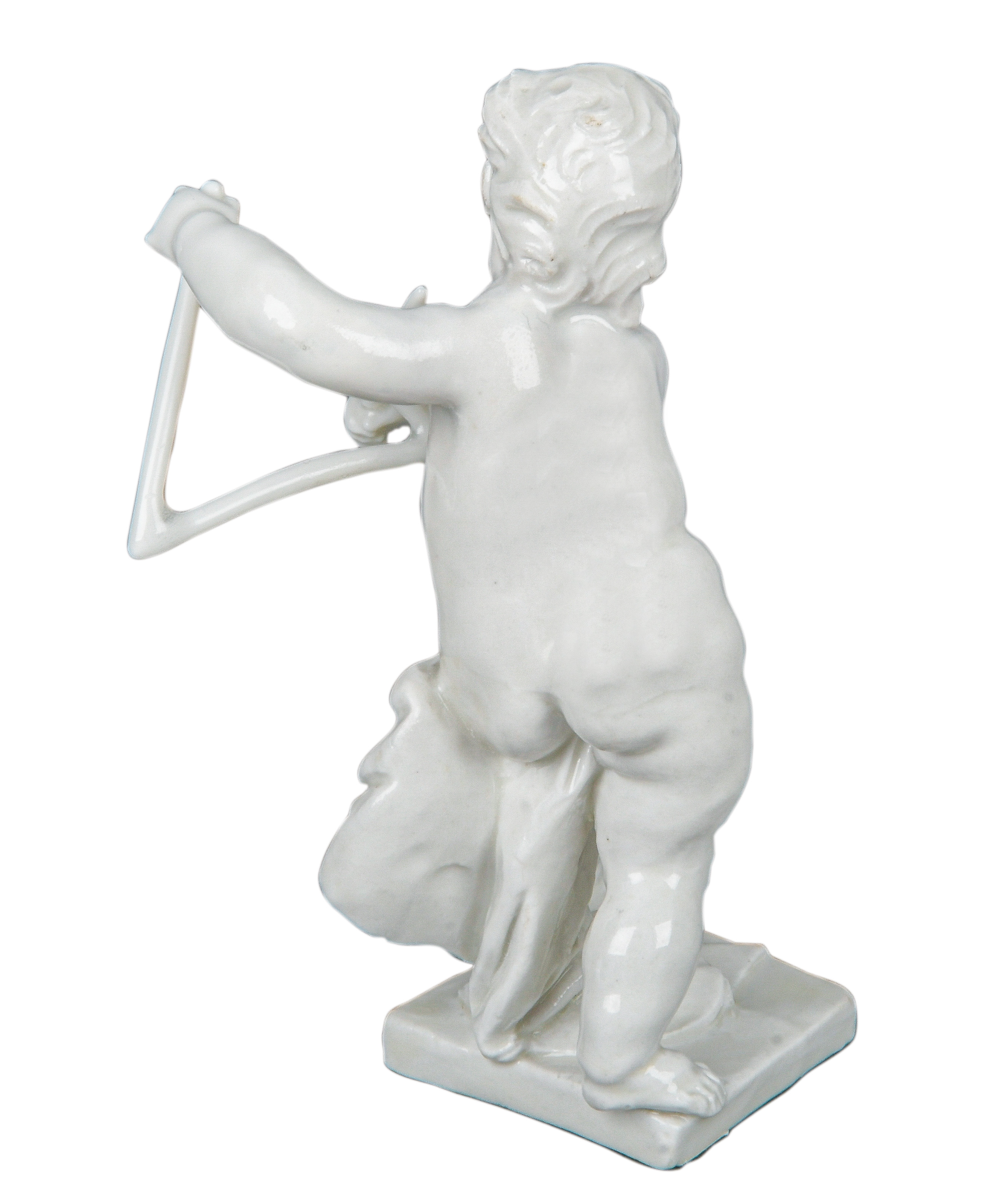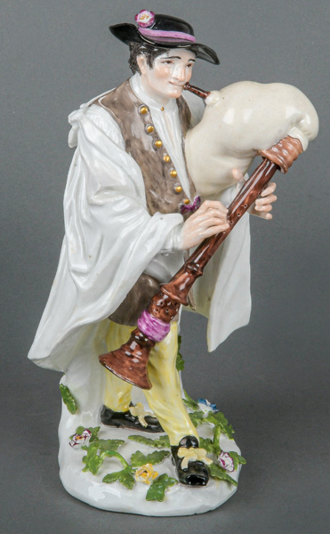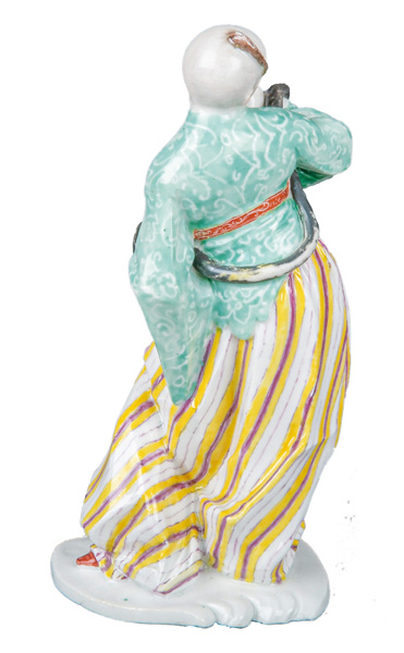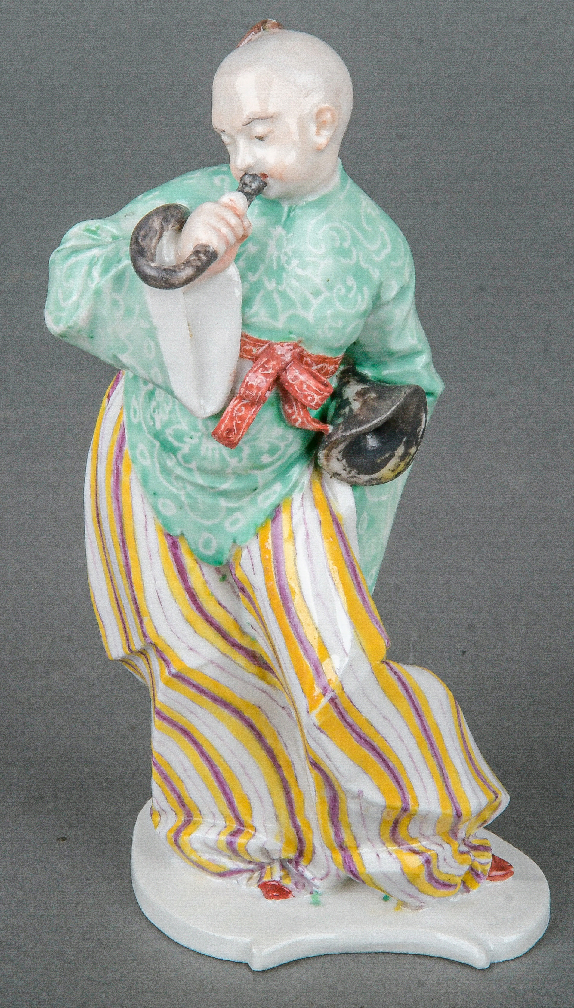 | Auf ovalem, unregelmäßigem Sockel mit aufbossierten Blüten und Blättern stehend. In den Händen das Instrument haltend. Porzellan, bunt bemalt, ohne Marke. Modell von Johann Joachim Kaendler. Vgl. S.-K. Andres-Acevedo, „Die autonomen figürlichen Plastiken“, Stuttgart 2023, S. 114, Nr. 288. (best. mit Rissen)