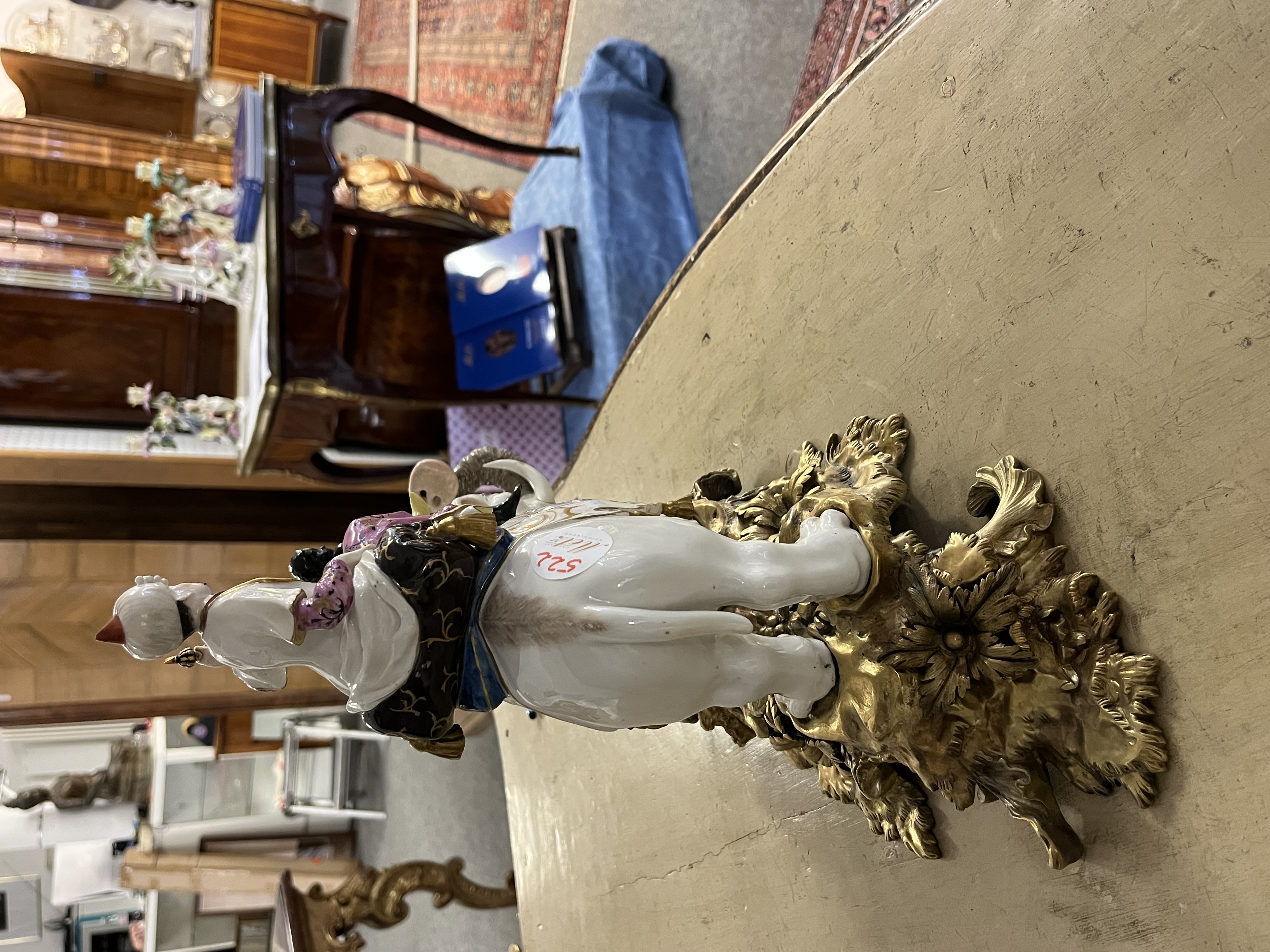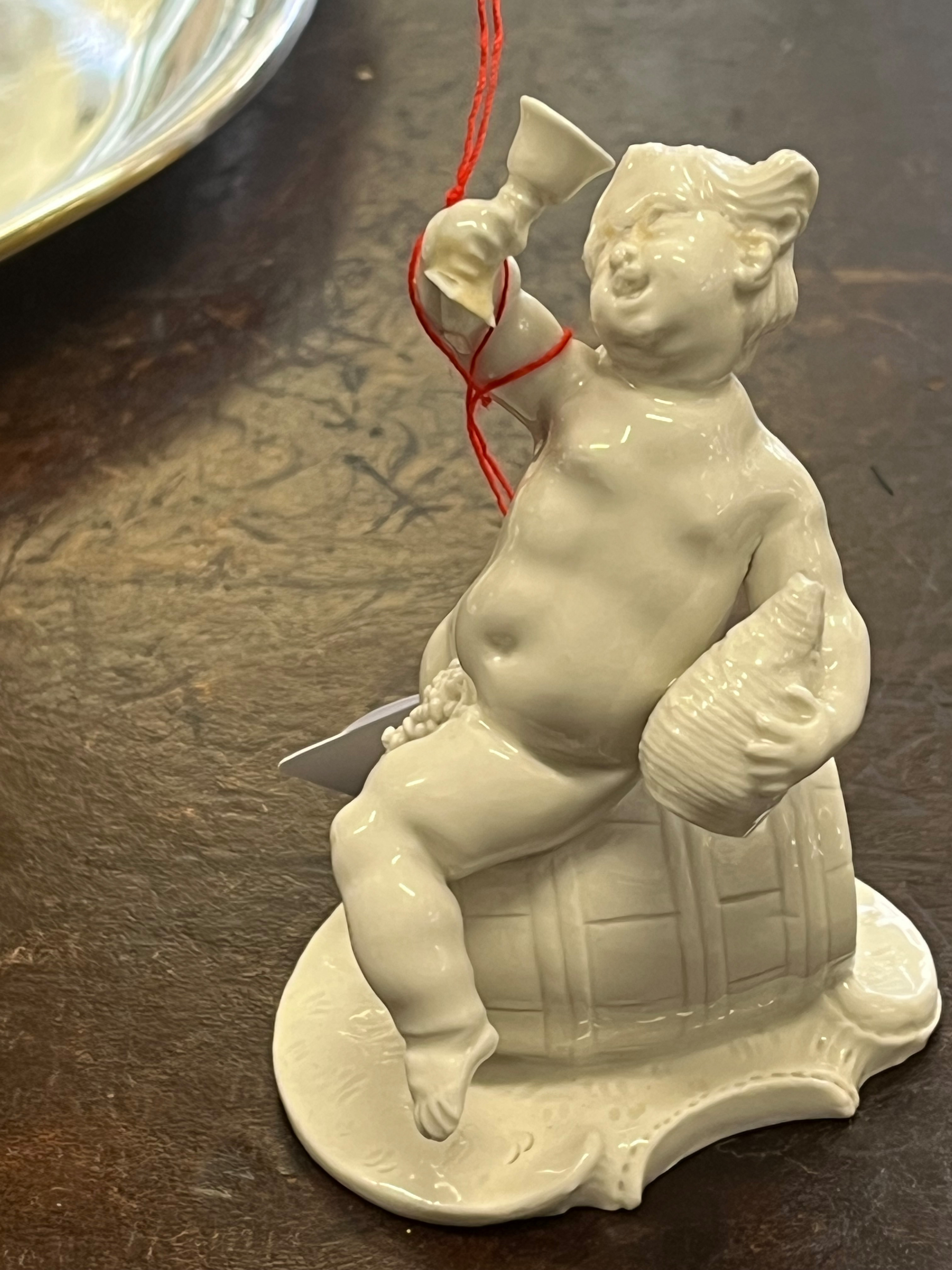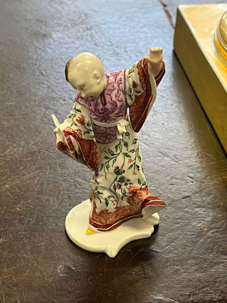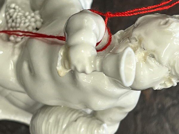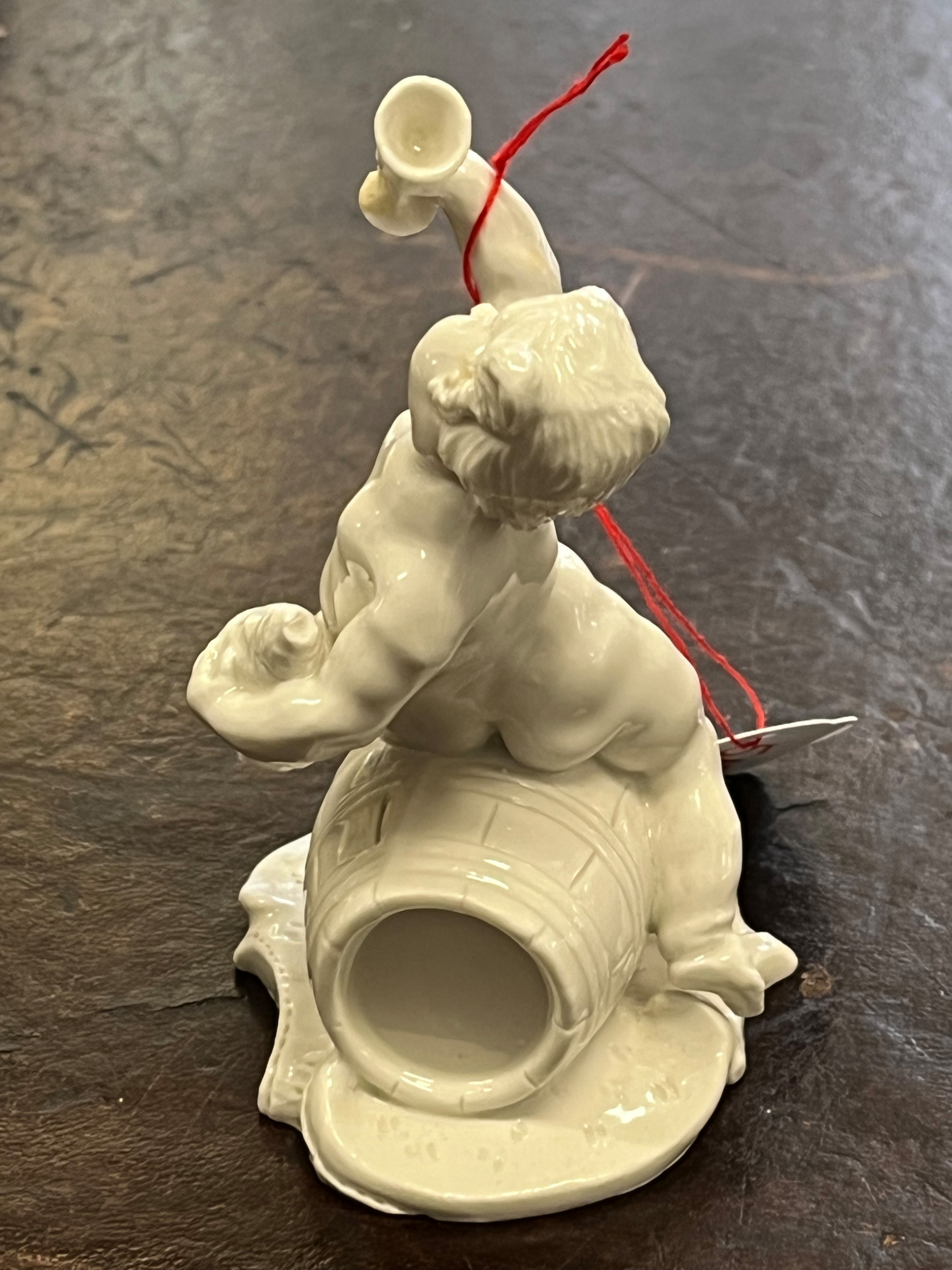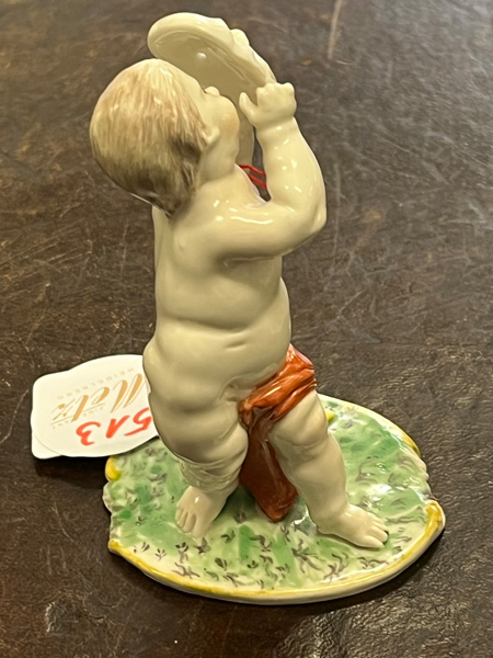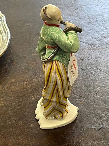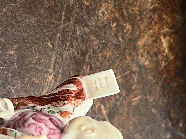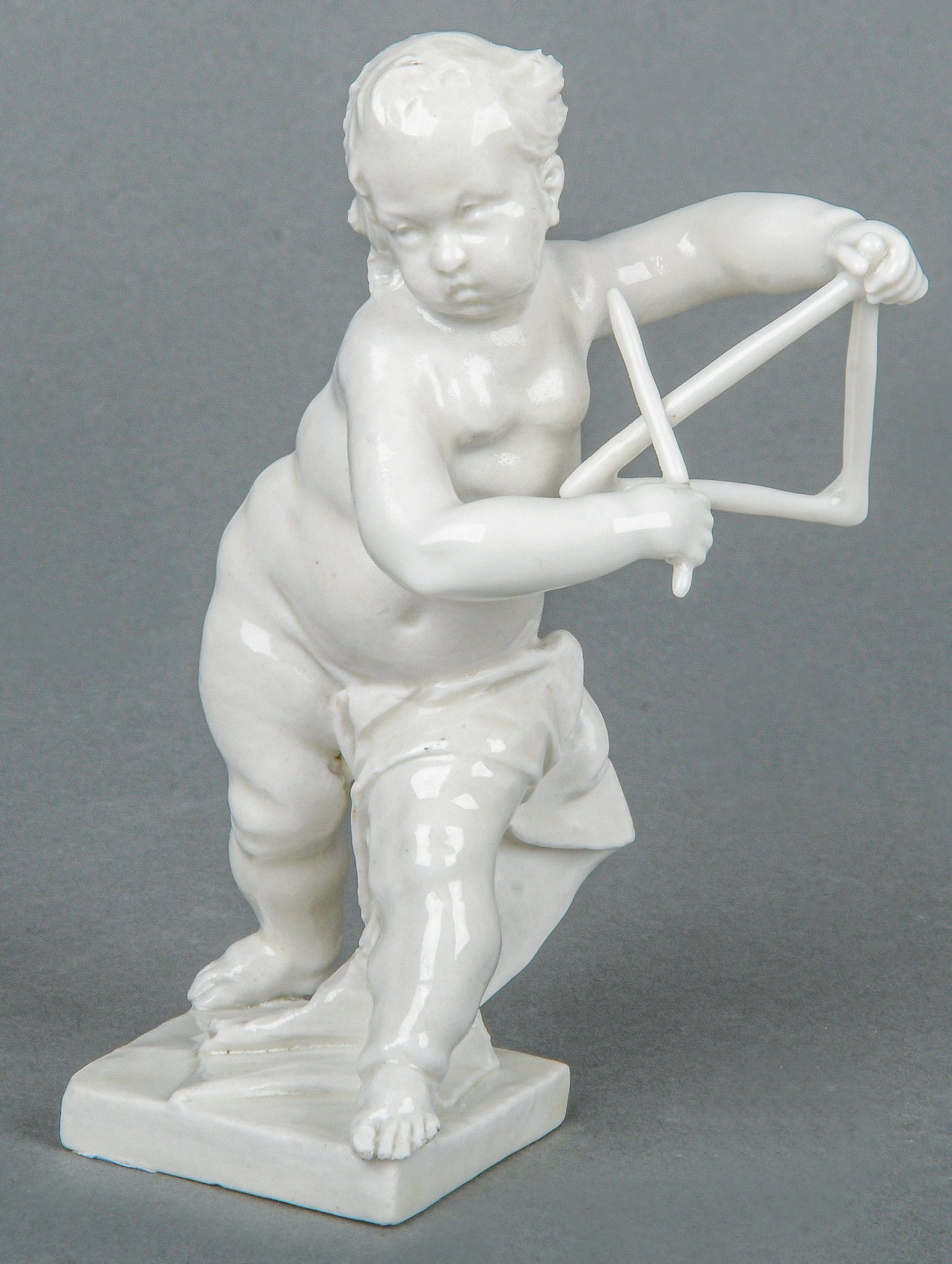 | Auf ovalem, unregelmäßigem Sockel mit aufbossierten Blüten und Blättern stehend. In den Händen das Instrument haltend. Porzellan, bunt bemalt, ohne Marke. Modell von Johann Joachim Kaendler. Vgl. S.-K. Andres-Acevedo, „Die autonomen figürlichen Plastiken“, Stuttgart 2023, S. 114, Nr. 288. (best. mit Rissen)