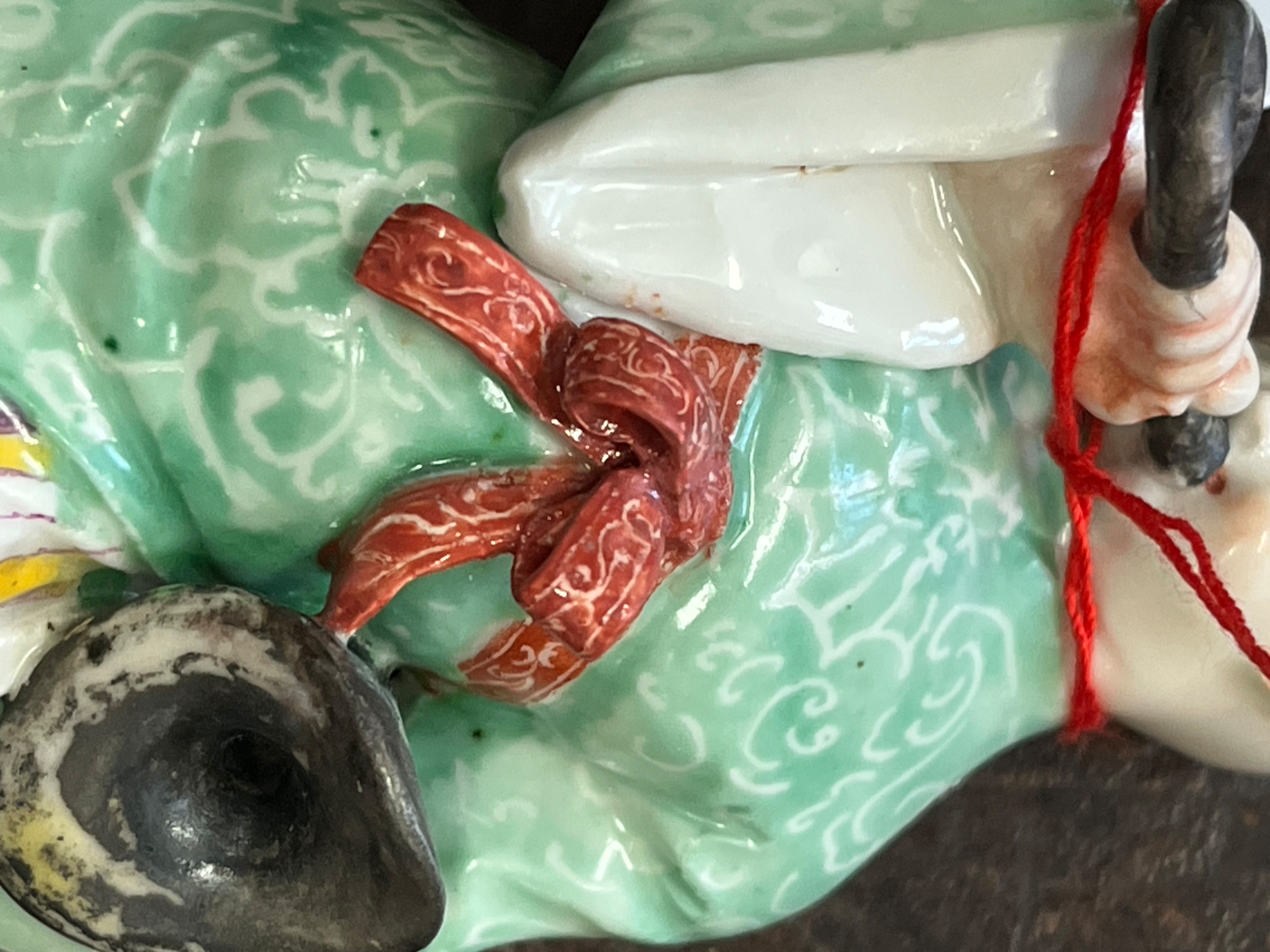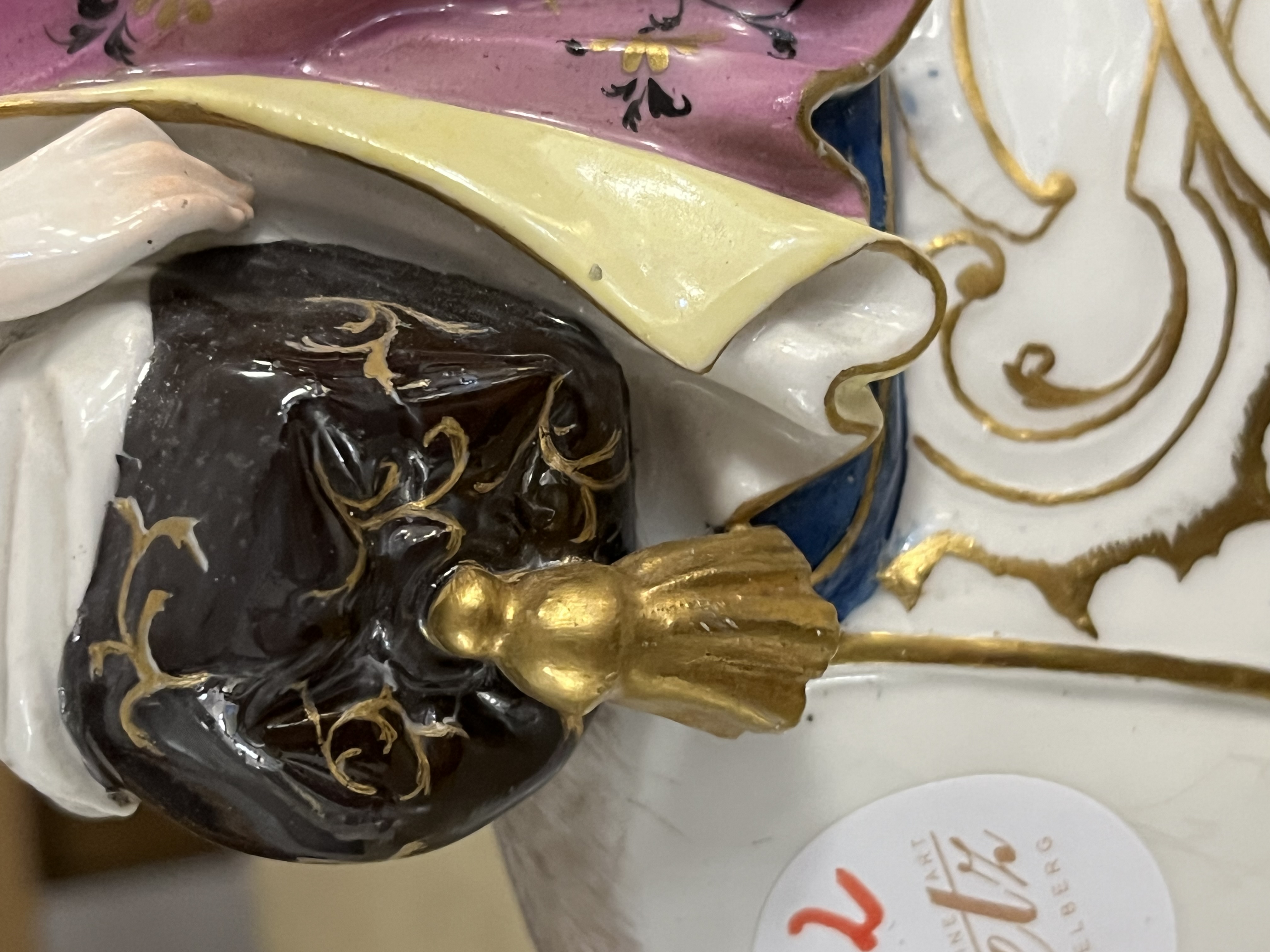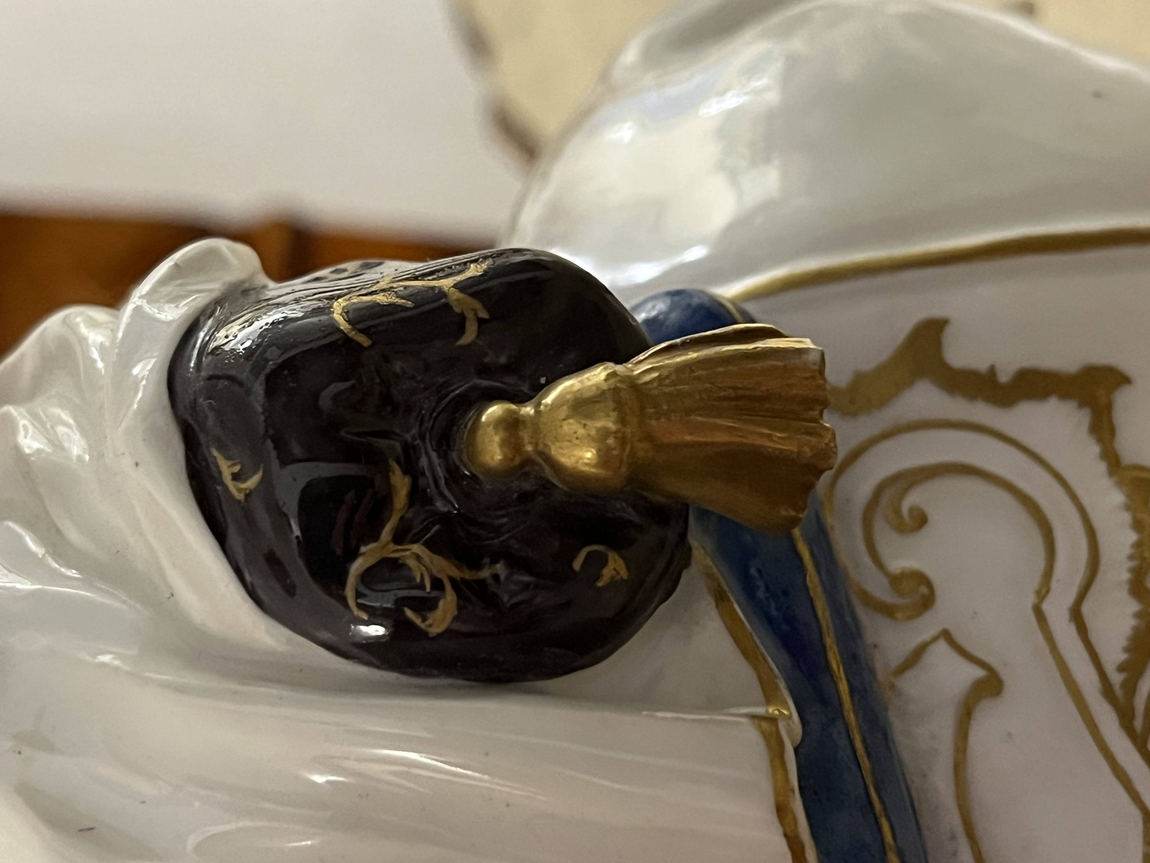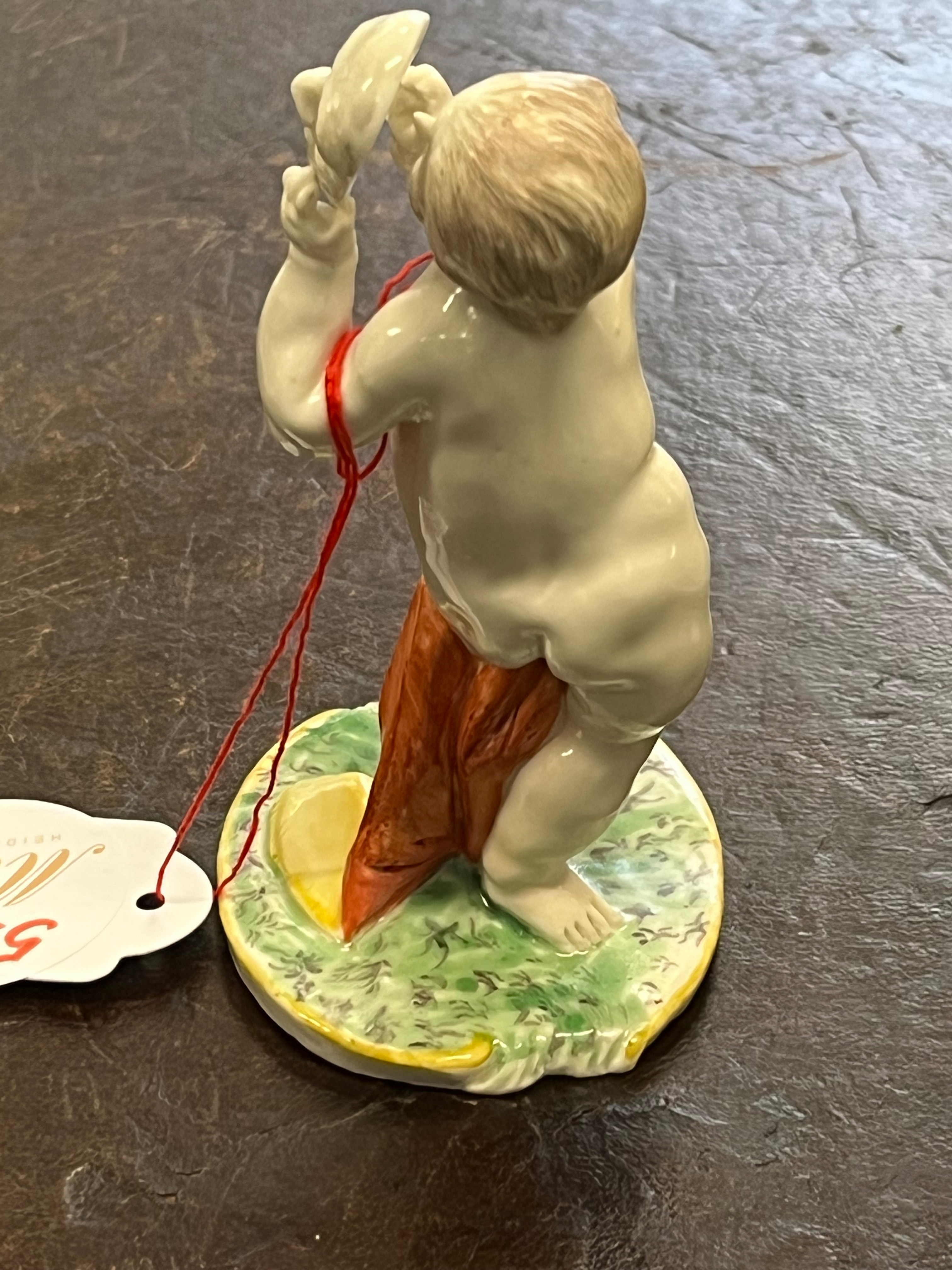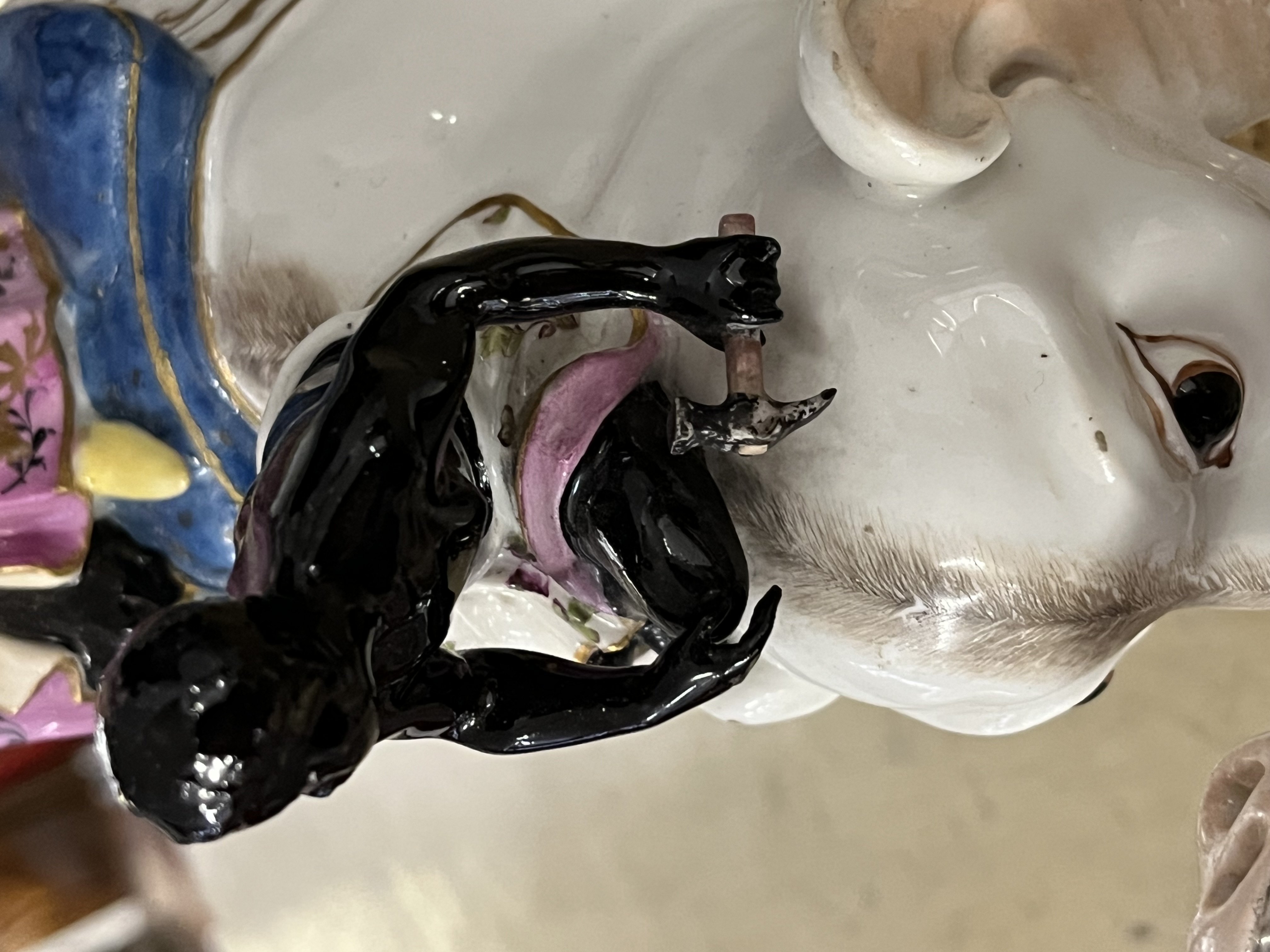 | Auf ovalem, unregelmäßigem Sockel mit aufbossierten Blüten und Blättern stehend. In den Händen das Instrument haltend. Porzellan, bunt bemalt, ohne Marke. Modell von Johann Joachim Kaendler. Vgl. S.-K. Andres-Acevedo, „Die autonomen figürlichen Plastiken“, Stuttgart 2023, S. 114, Nr. 288. (best. mit Rissen)