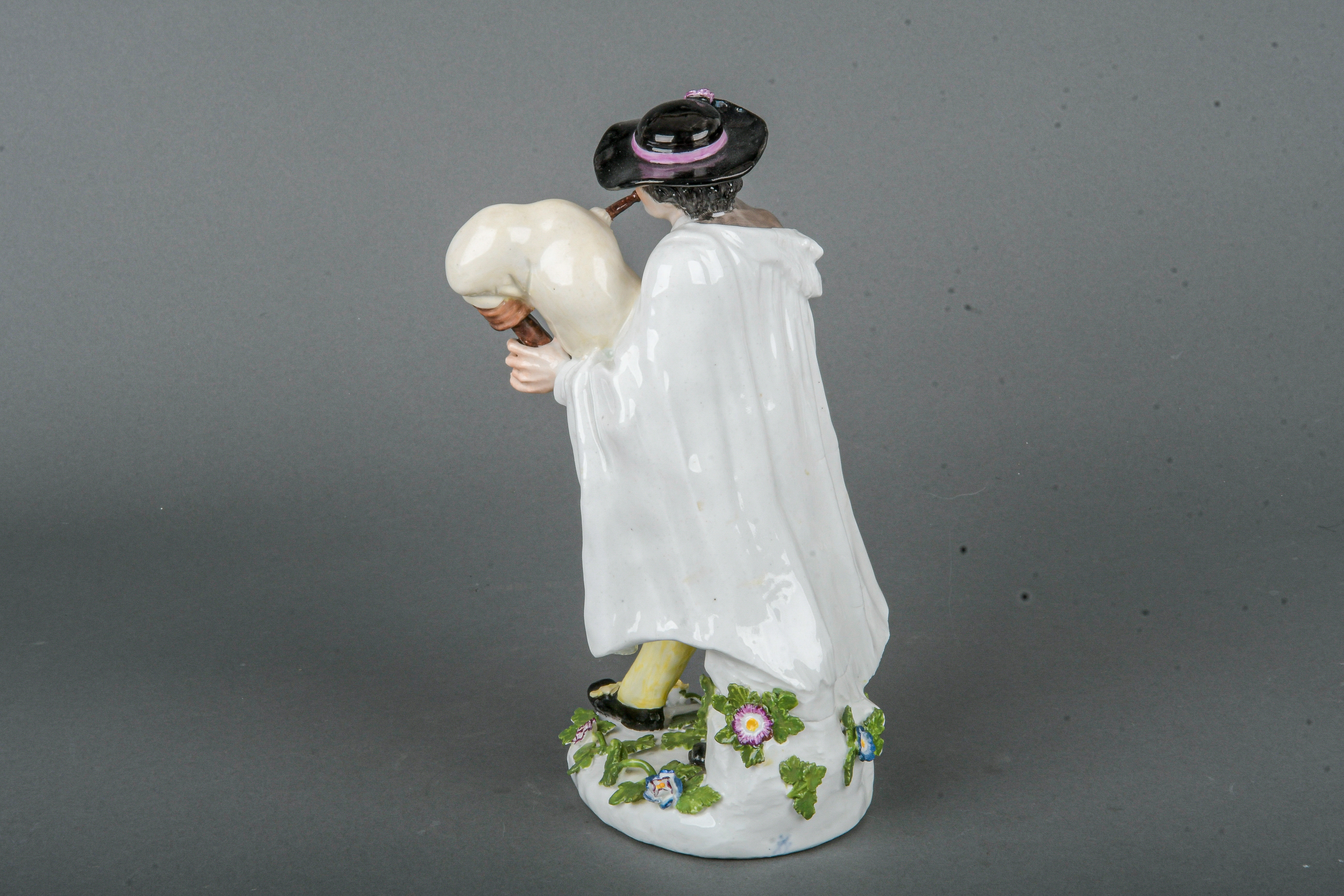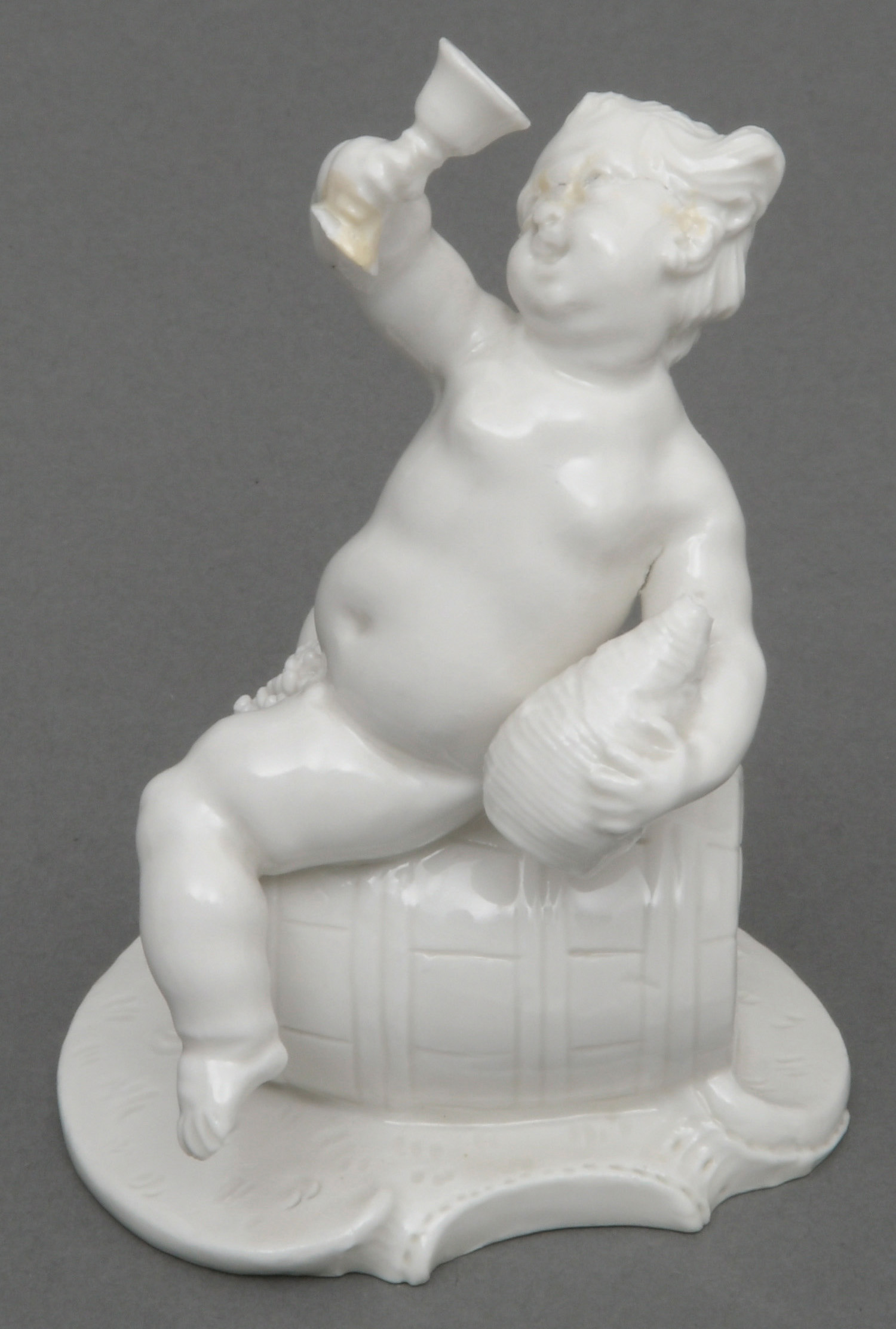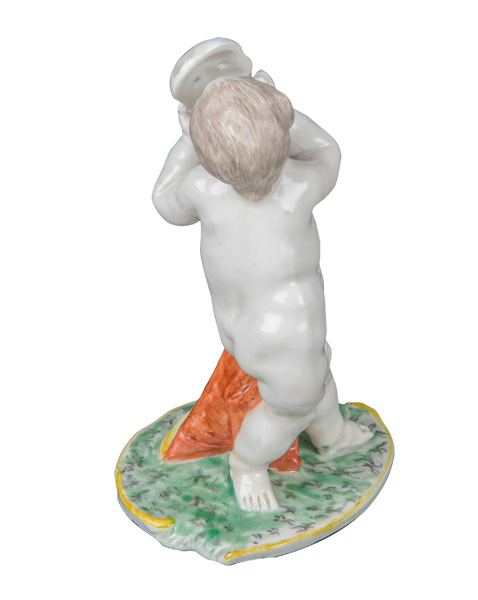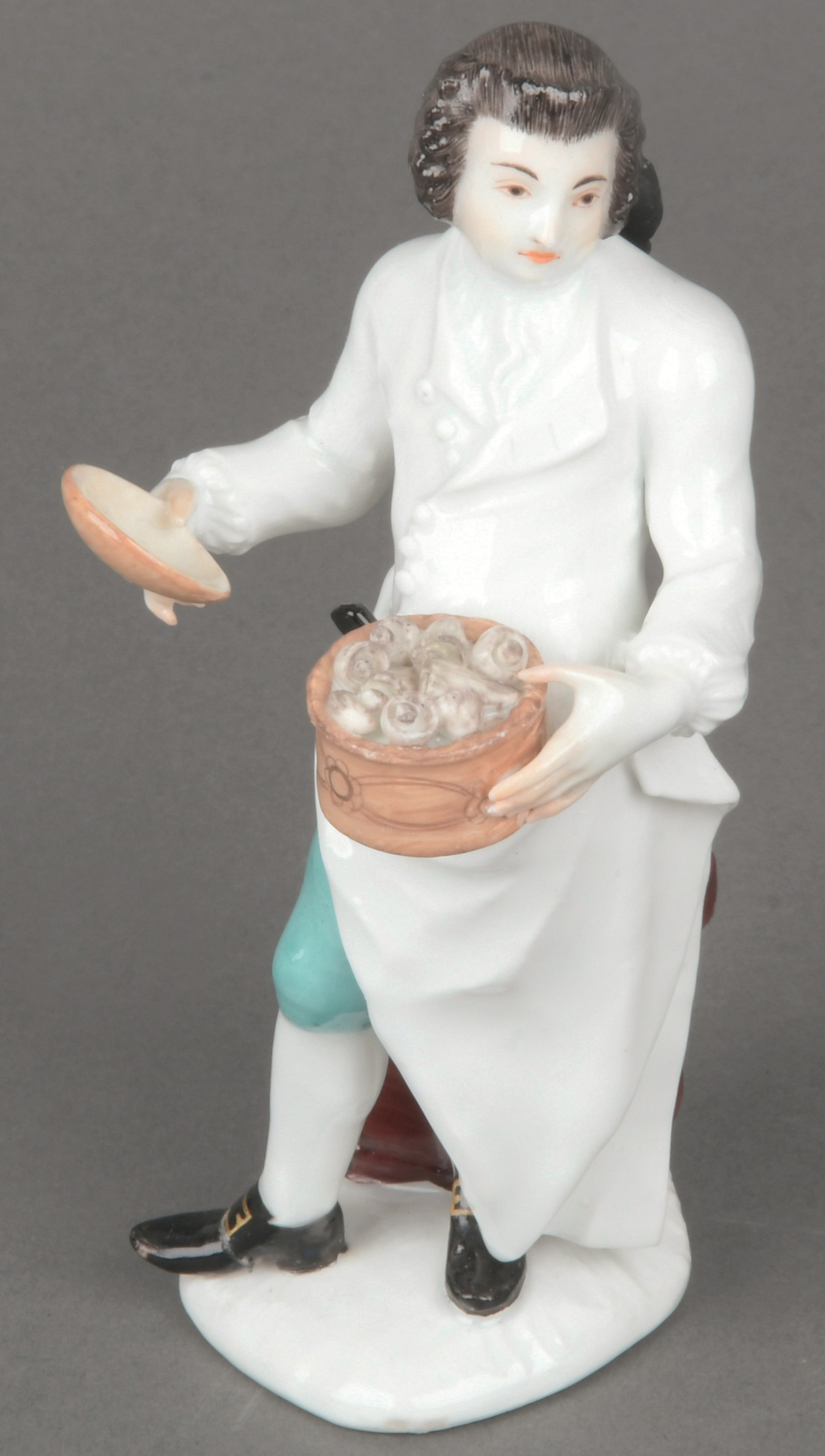 | Stehend auf quadratischem, unregelmäßigem Sockel. In den Händen einen mit Pilzen gefüllten Topf haltend. Porzellan, bunt bemalt, ohne Marke. Modell von Johann Joachim Kaendler.