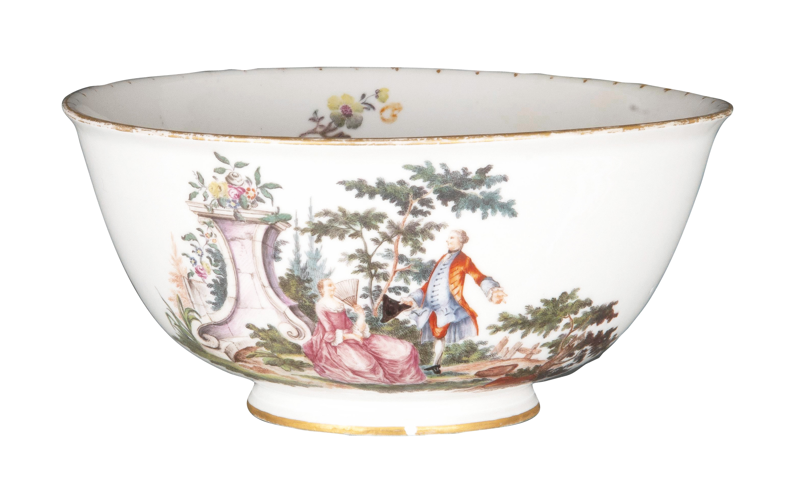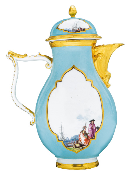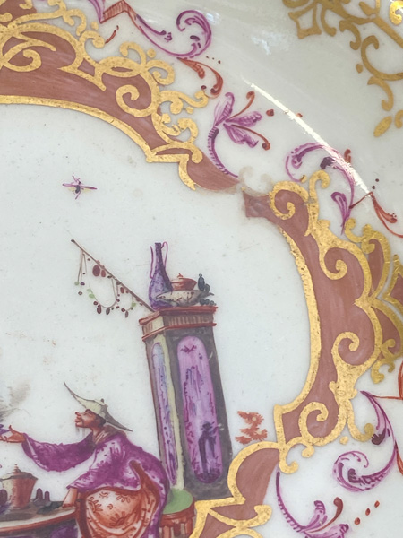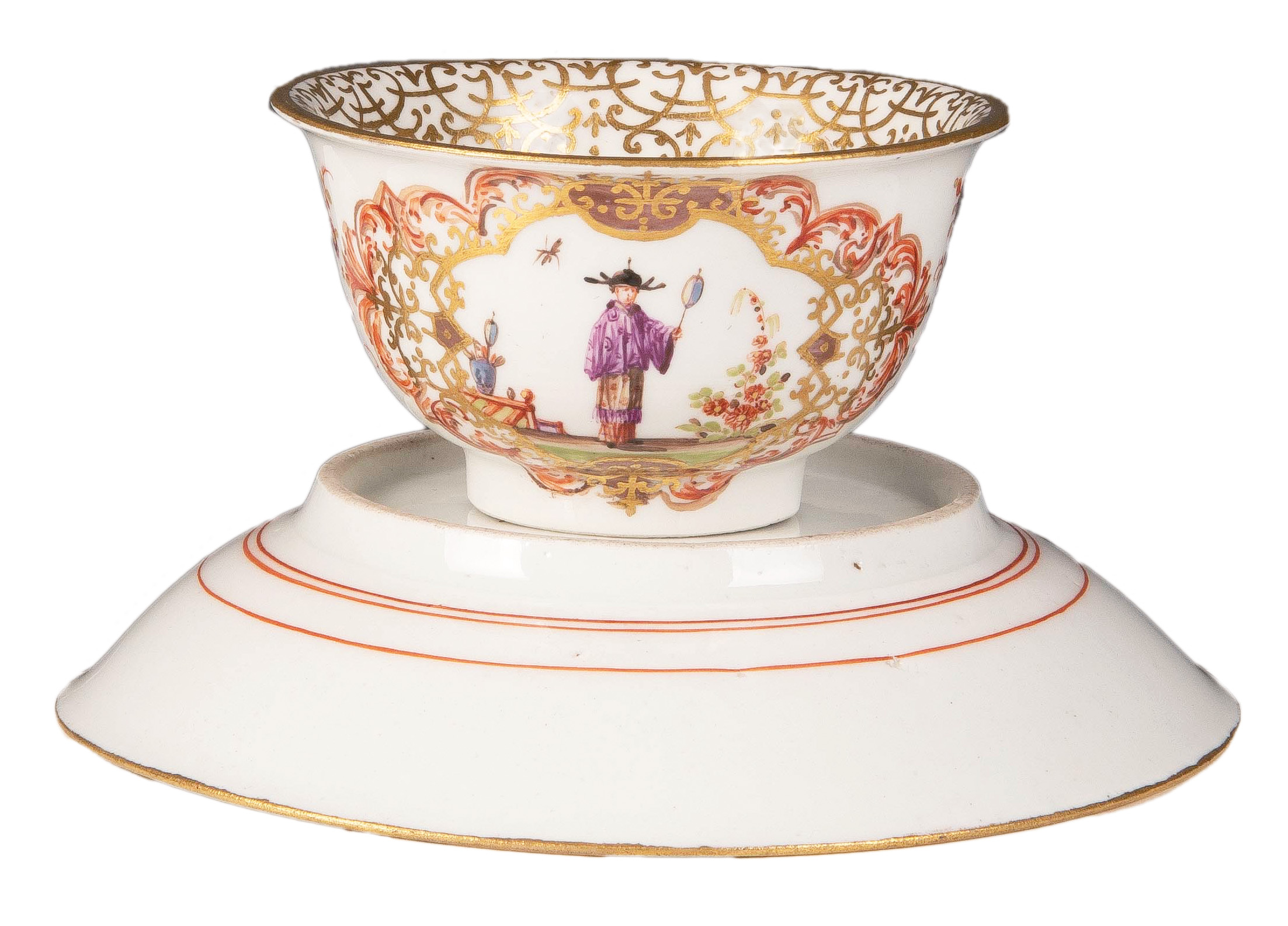 Beide Teile mit breiter Goldspitzenbordüre. Schauseiten mit Goldspitzenkartuschen und Böttgerlüster, eisenrot gesäumt. Reserven bunt bemalt mit Chinoiserien. Weißes Böttgerporzellan, ohne Marke, am Boden Goldziffer „80.“. Malerei von Johann Gregorius Hoeroldt. Vgl. R. Rückert 1966, Taf. 48ff., Nr. 153ff.