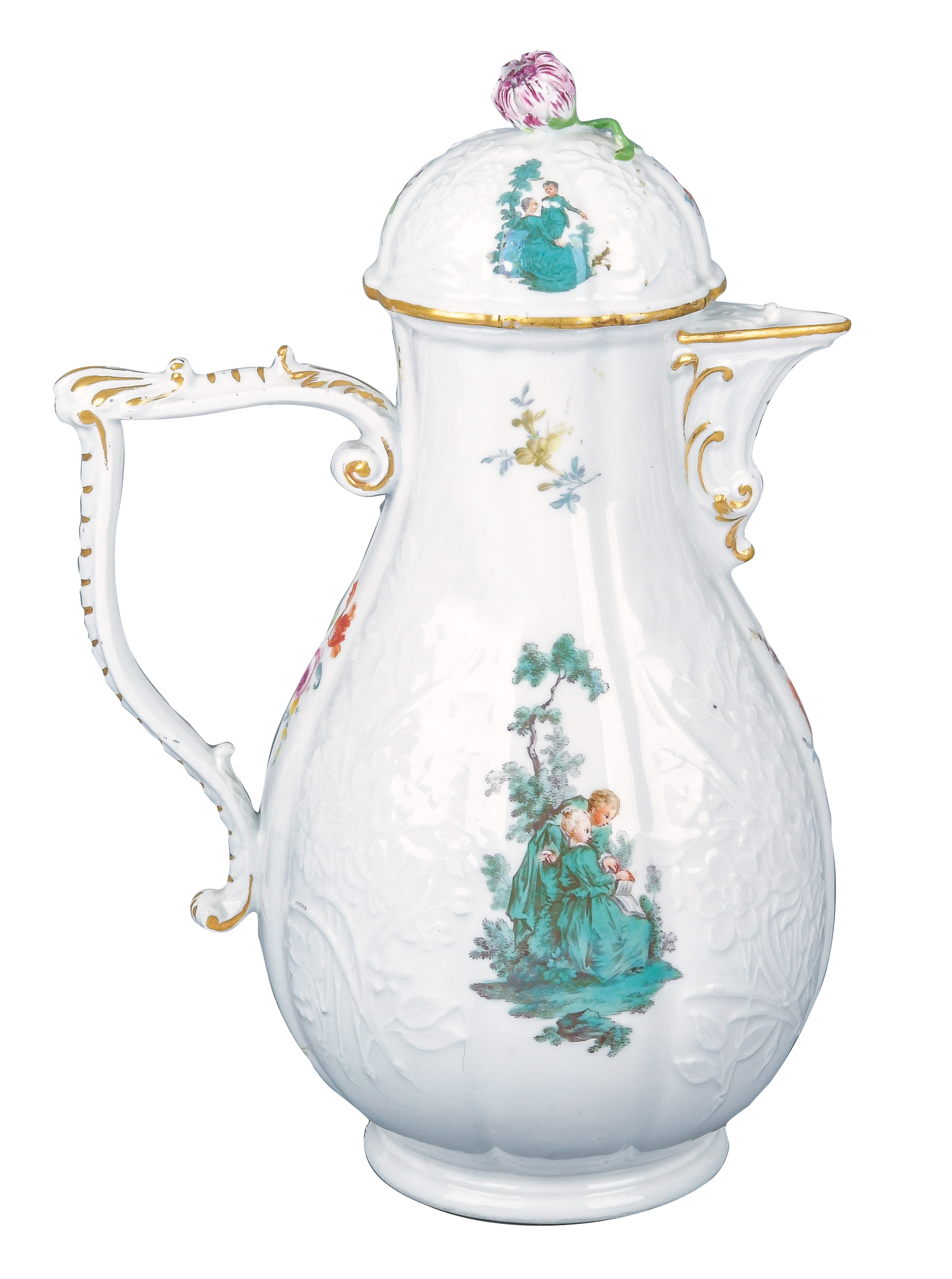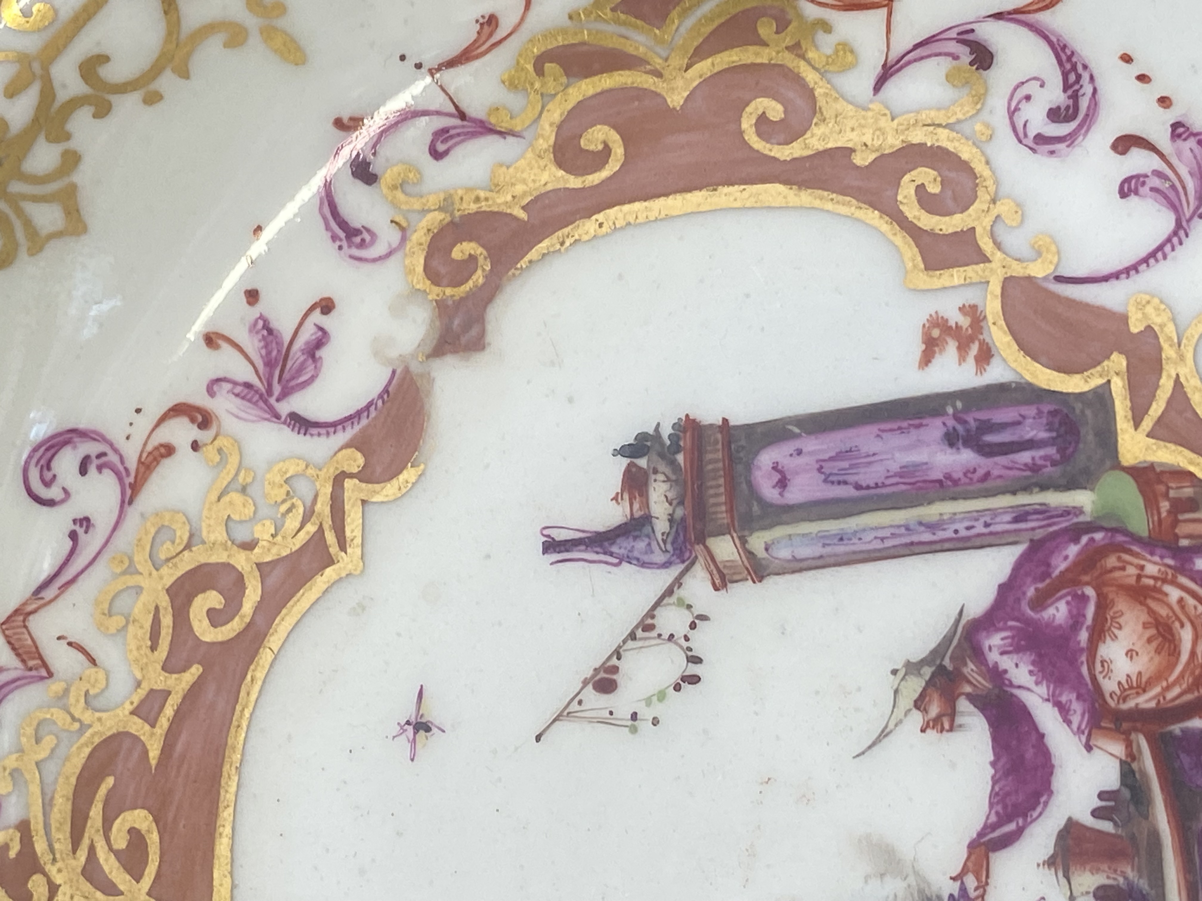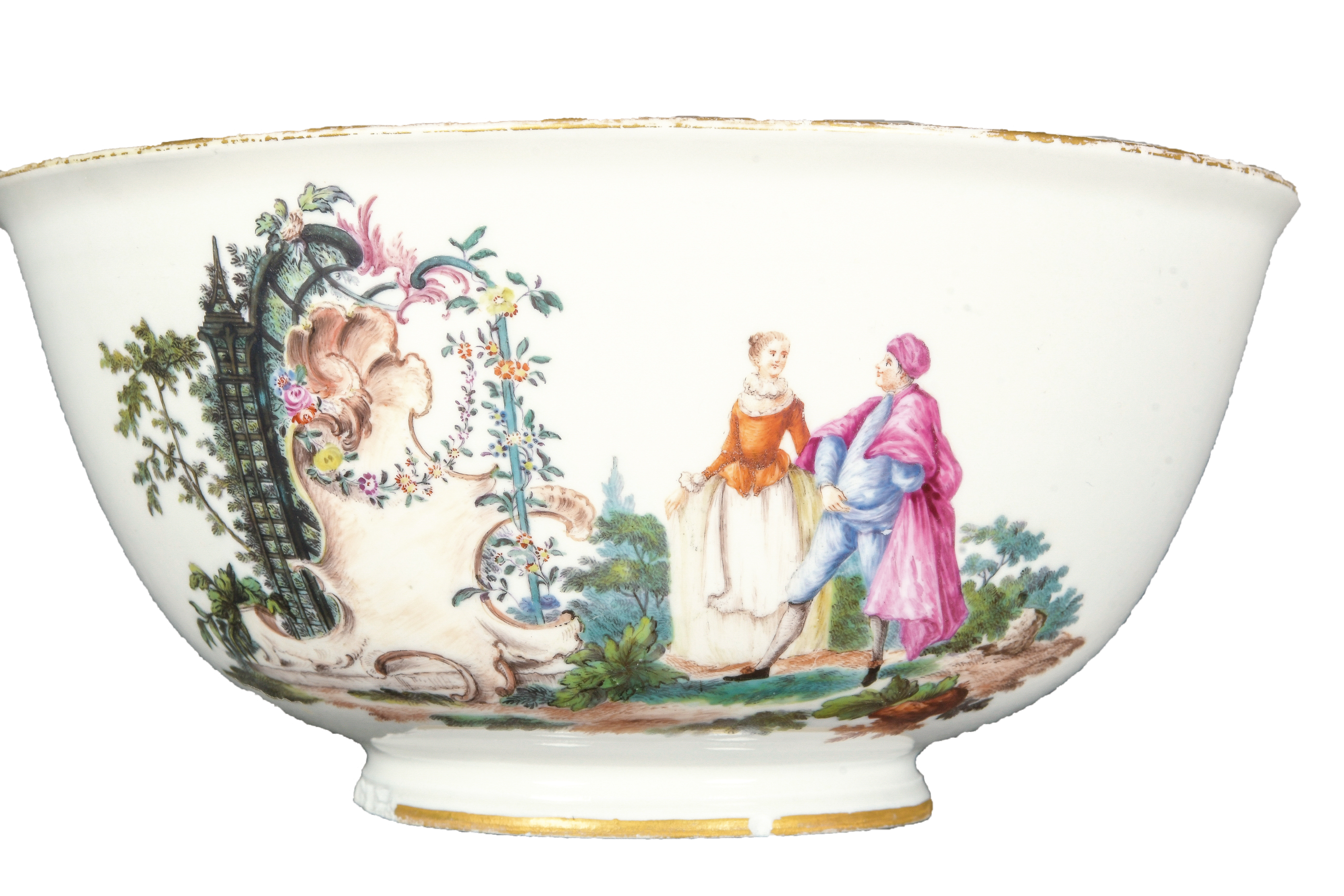 Beide Teile mit breiter Goldspitzenbordüre. Schauseiten mit Goldspitzenkartuschen und Böttgerlüster, eisenrot gesäumt. Reserven bunt bemalt mit Chinoiserien. Weißes Böttgerporzellan, ohne Marke, am Boden Goldziffer „80.“. Malerei von Johann Gregorius Hoeroldt. Vgl. R. Rückert 1966, Taf. 48ff., Nr. 153ff.