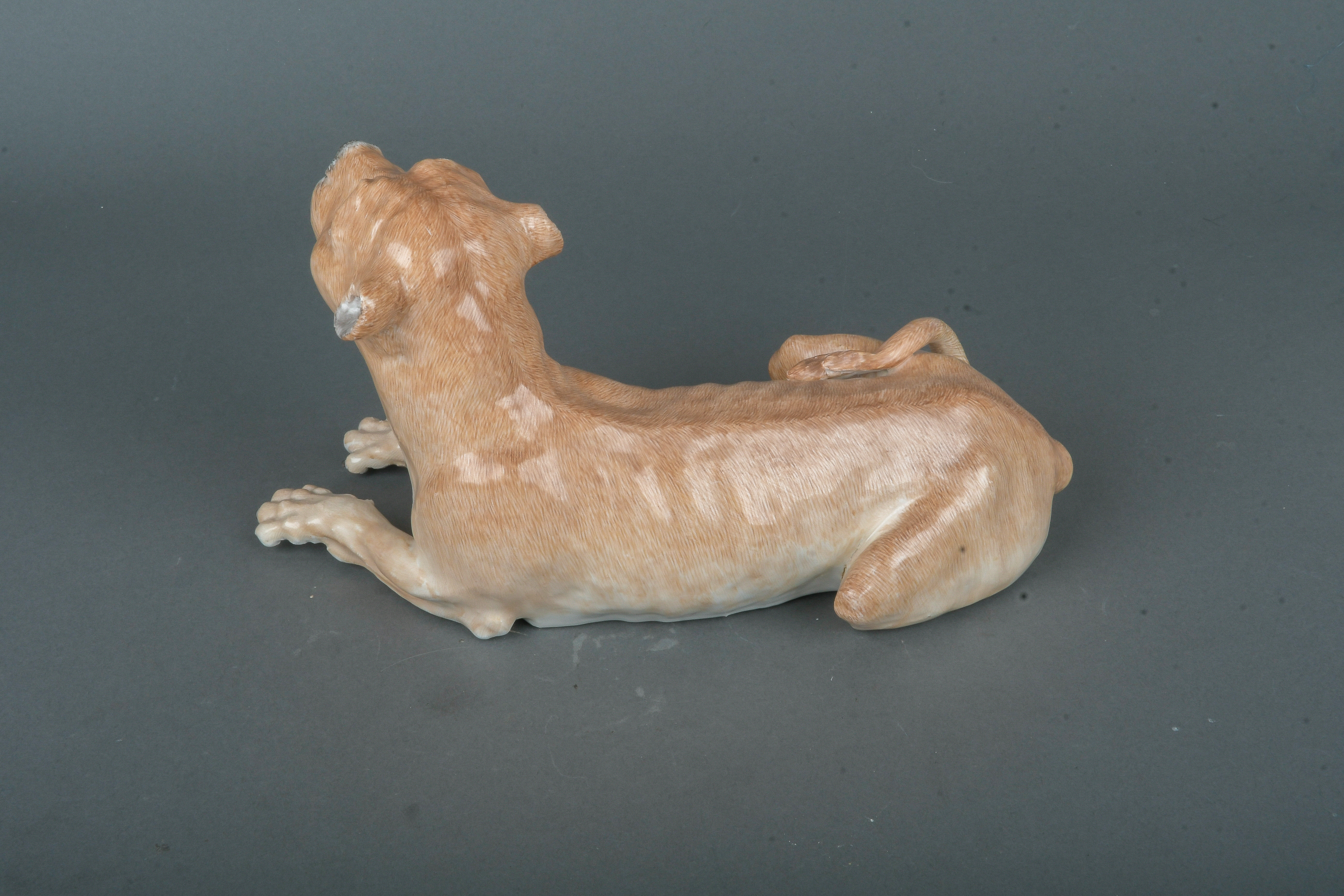 | Liegend, naturalistisch modelliert und staffiert. Porzellan, verso unterglasurblaue Schwertermarke. Modell von Johann Joachim Kaendler. Taxa: „1 Löwe, mittelmässiger Grösse, liegend mit offenem Rachen, vor Ihro Königl. Maj.“. Vgl. C. Albiker, „Die Meissner Porzellantiere im 18. Jahrhundert“, Berlin 1959, Nr. 159.
