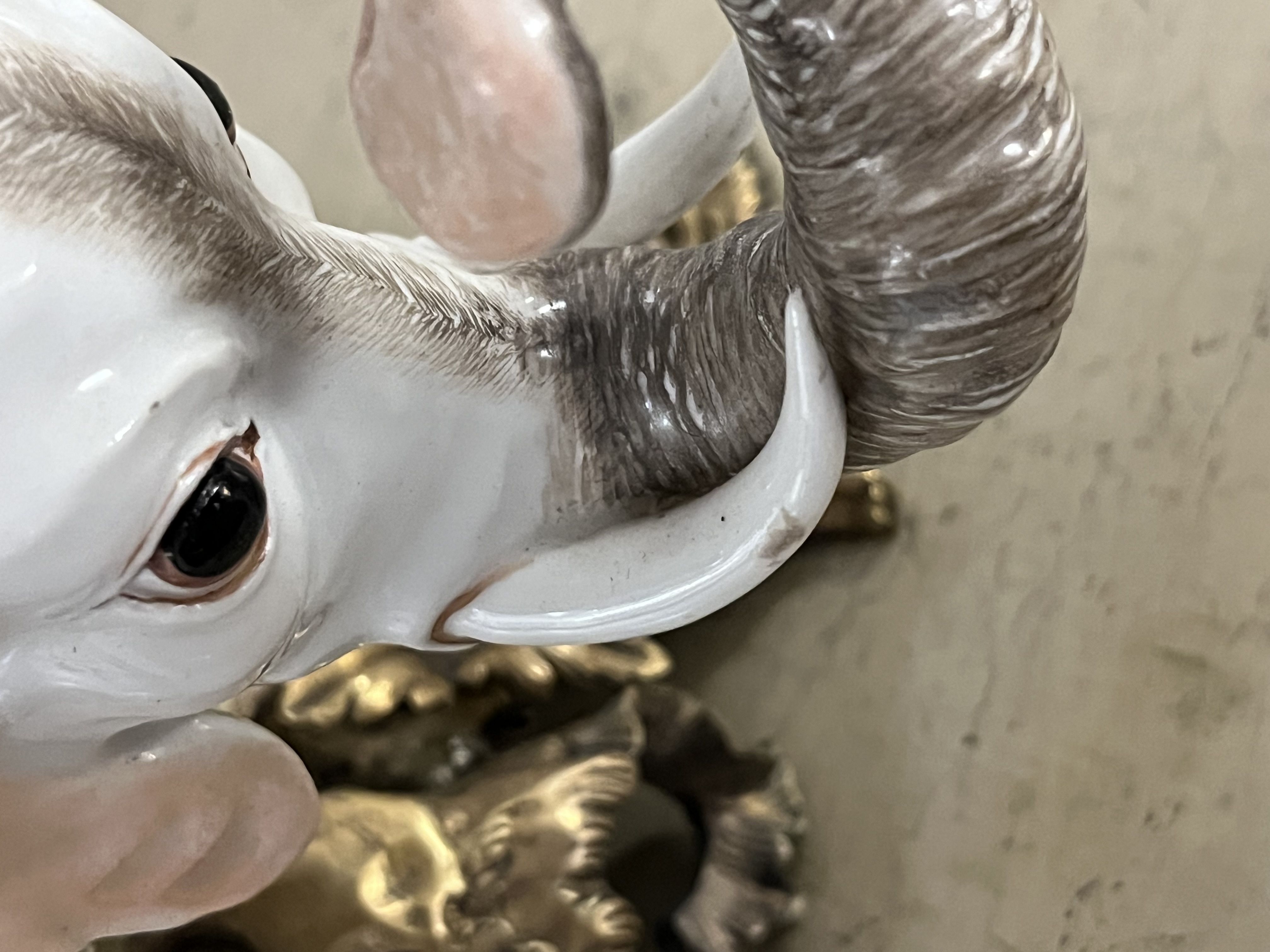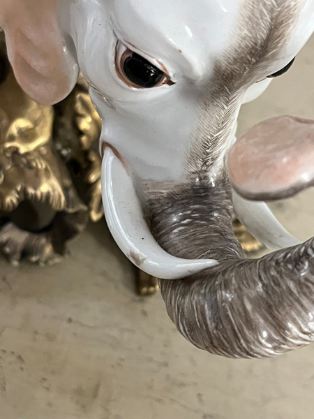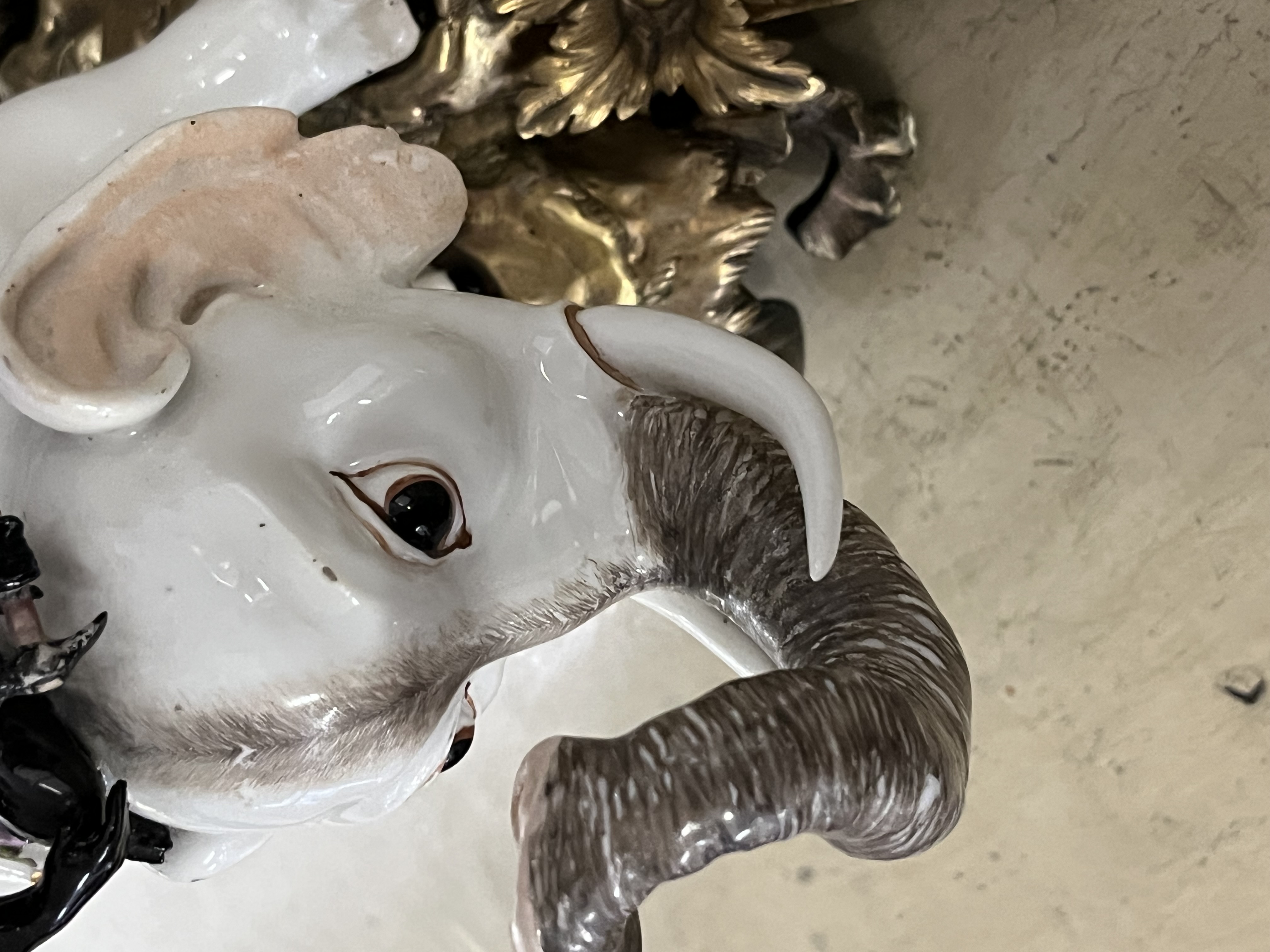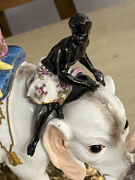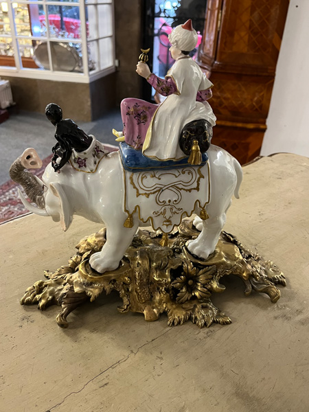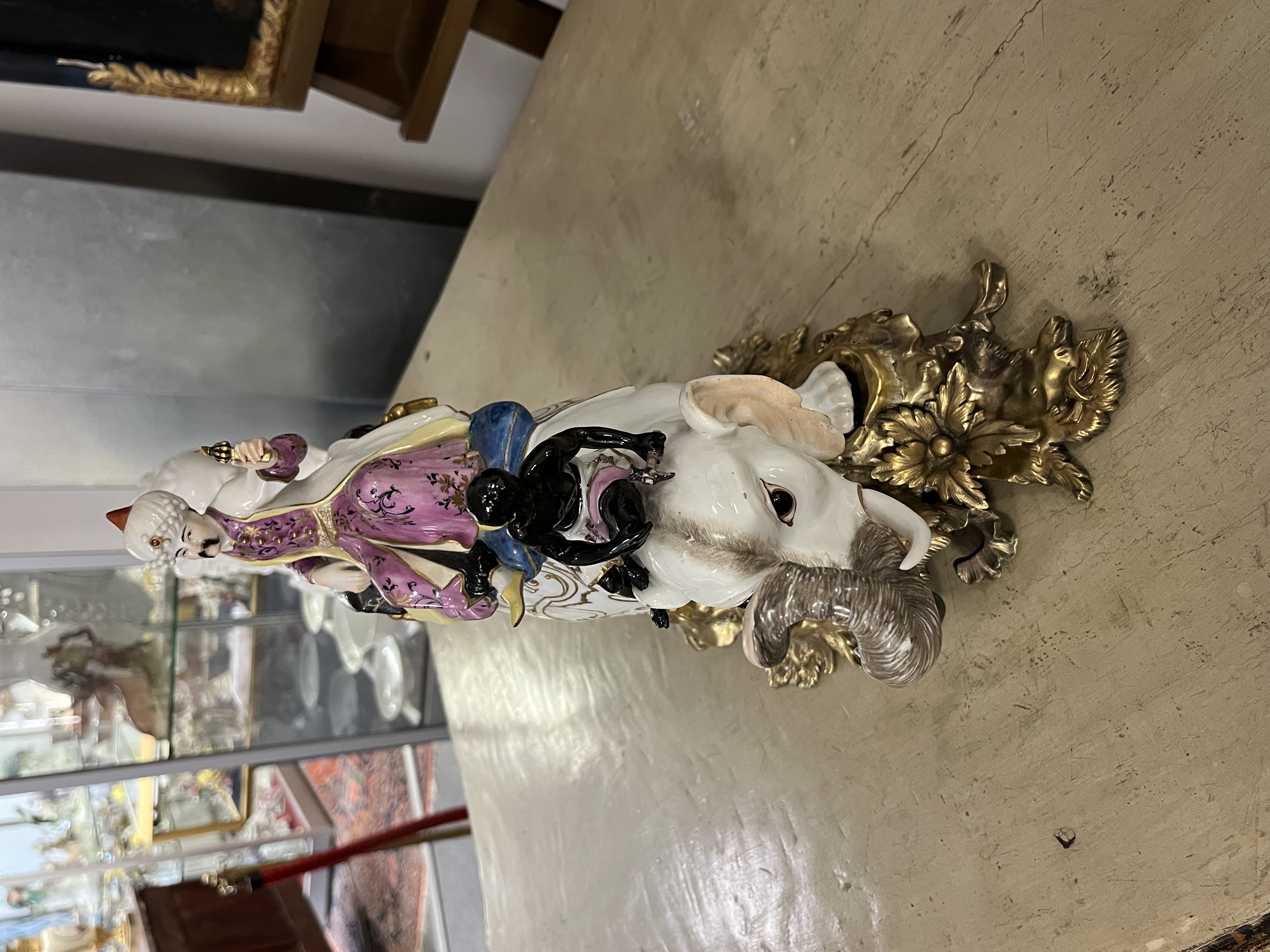 | Naturalistisch modellierter Elefant mit erhobenem Rüssel. Auf seinem Rücken thronender Sultan in Sänfte, gestützt auf Rollkissen und in der Hand ein Zepter haltend. Im Genick reitend der Elefantenführer als Afrikaner in ein Lendentuch gehüllt. Bunt bemalt, teilweise mit indianischem Floraldekor, Ränder gold gesäumt. Porzellan, am Boden unterglasurblaue Schwertermarke. Modell von Johann Joachim Kaendler und Peter Reinicke. Auf feuervergoldeten und mit Blättern und Blüten geschmücktem Bronzesockel. Provenienz: Kunsthandel Gerhard Röbbig, München 1999, für DM 120.000,00. Vgl. R. Rückert 1966, Taf. 263, Nr. 1061.