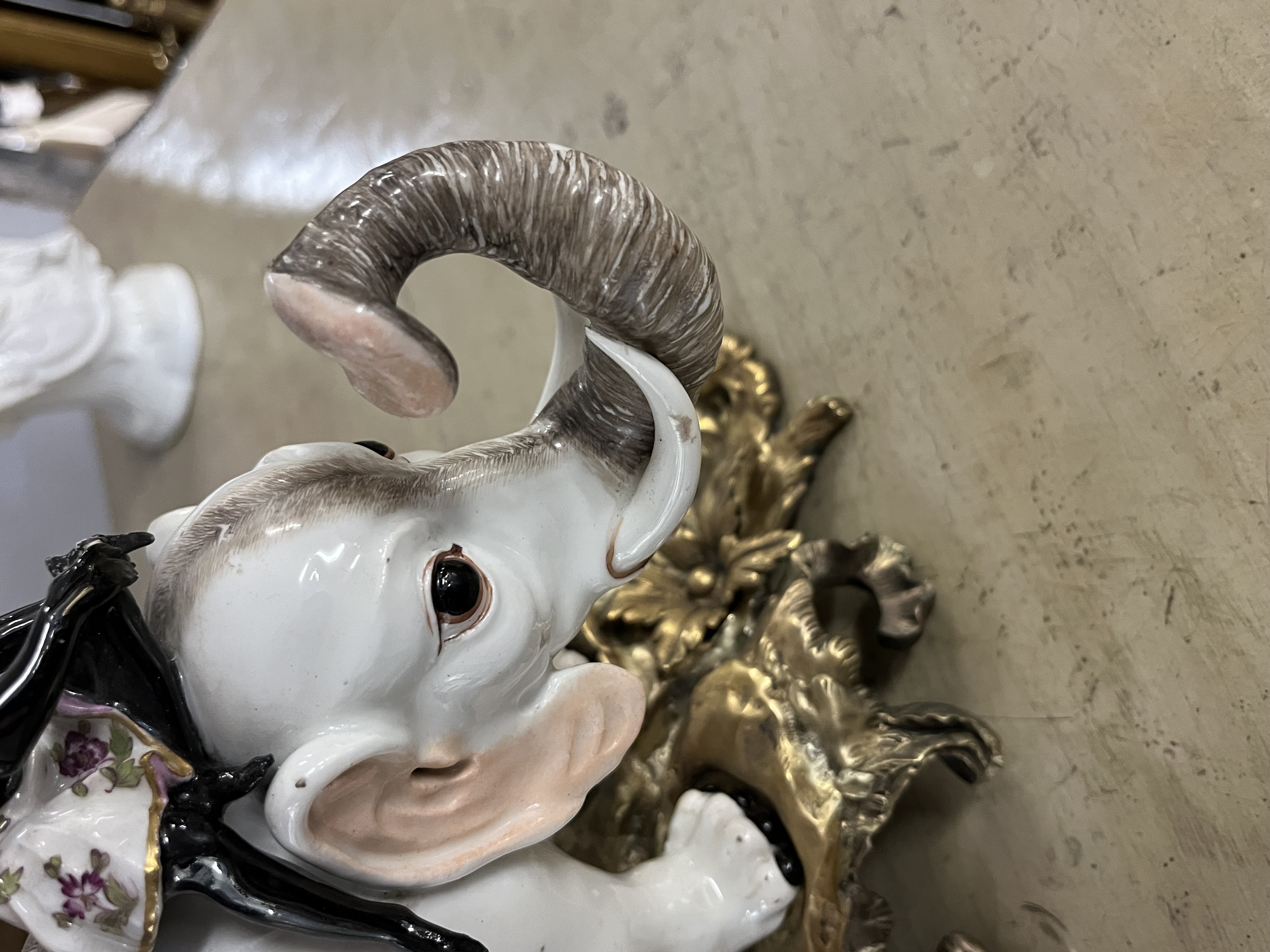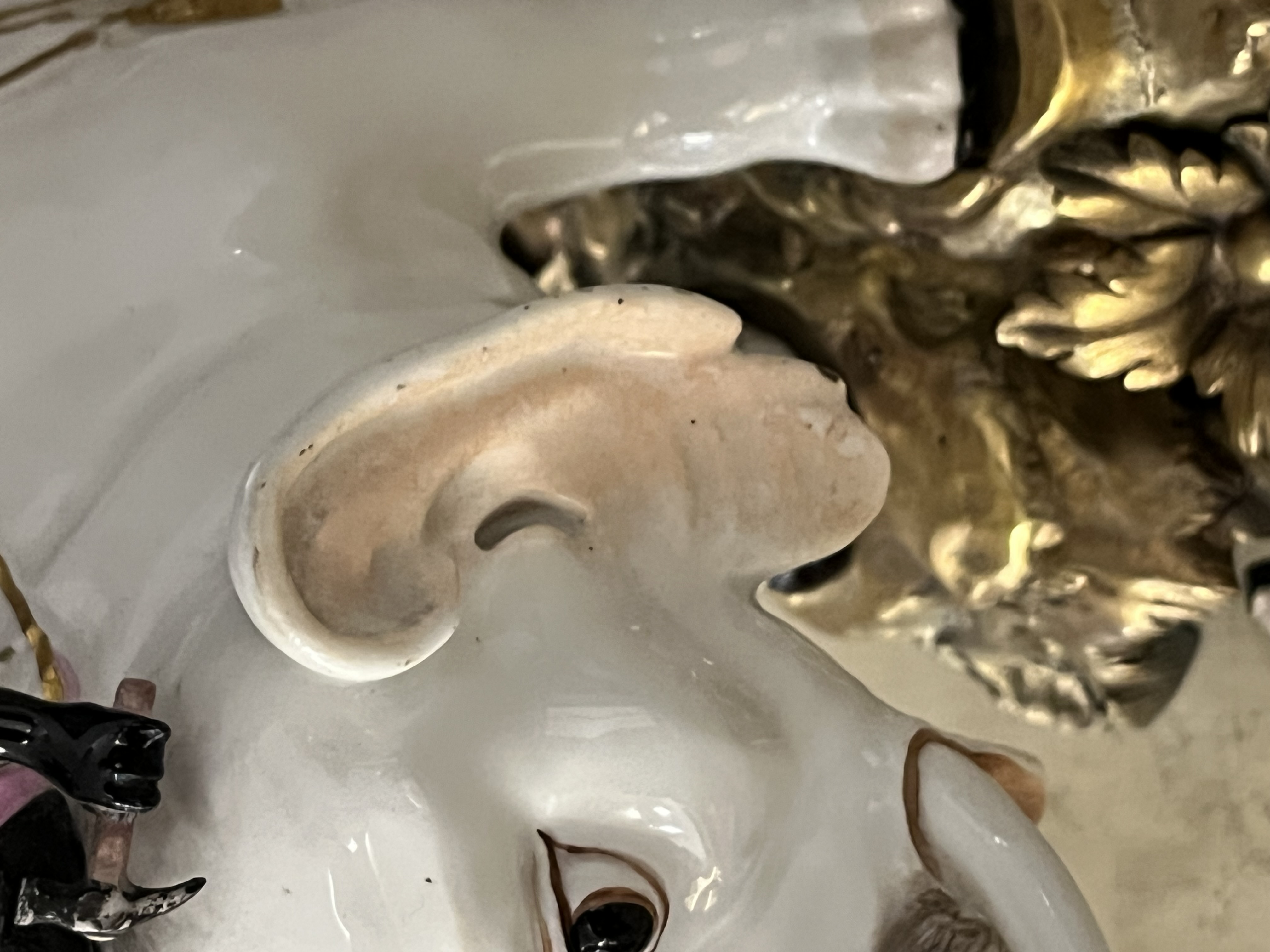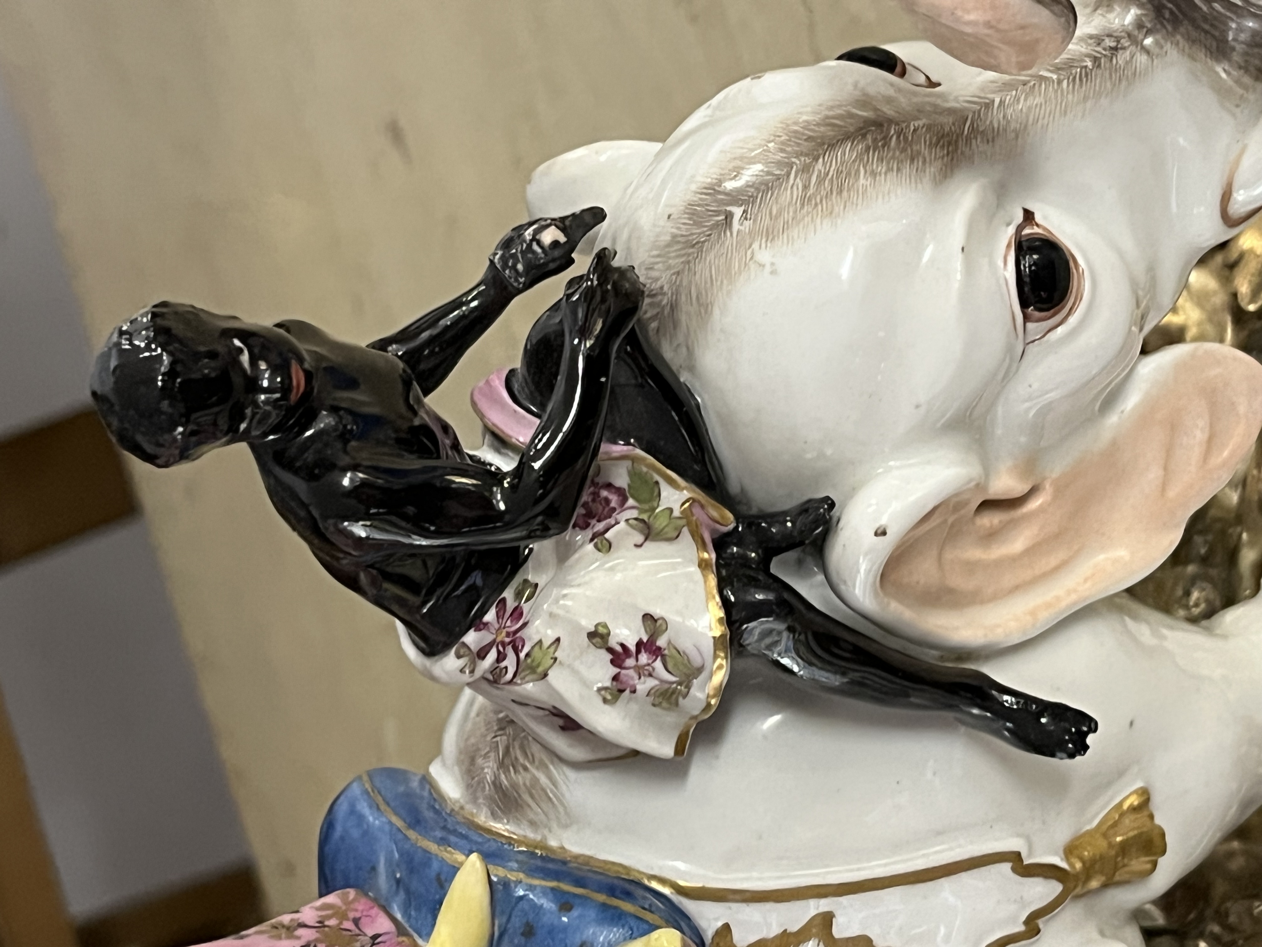 | Naturalistisch modellierter Elefant mit erhobenem Rüssel. Auf seinem Rücken thronender Sultan in Sänfte, gestützt auf Rollkissen und in der Hand ein Zepter haltend. Im Genick reitend der Elefantenführer als Afrikaner in ein Lendentuch gehüllt. Bunt bemalt, teilweise mit indianischem Floraldekor, Ränder gold gesäumt. Porzellan, am Boden unterglasurblaue Schwertermarke. Modell von Johann Joachim Kaendler und Peter Reinicke. Auf feuervergoldeten und mit Blättern und Blüten geschmücktem Bronzesockel. Provenienz: Kunsthandel Gerhard Röbbig, München 1999, für DM 120.000,00. Vgl. R. Rückert 1966, Taf. 263, Nr. 1061.