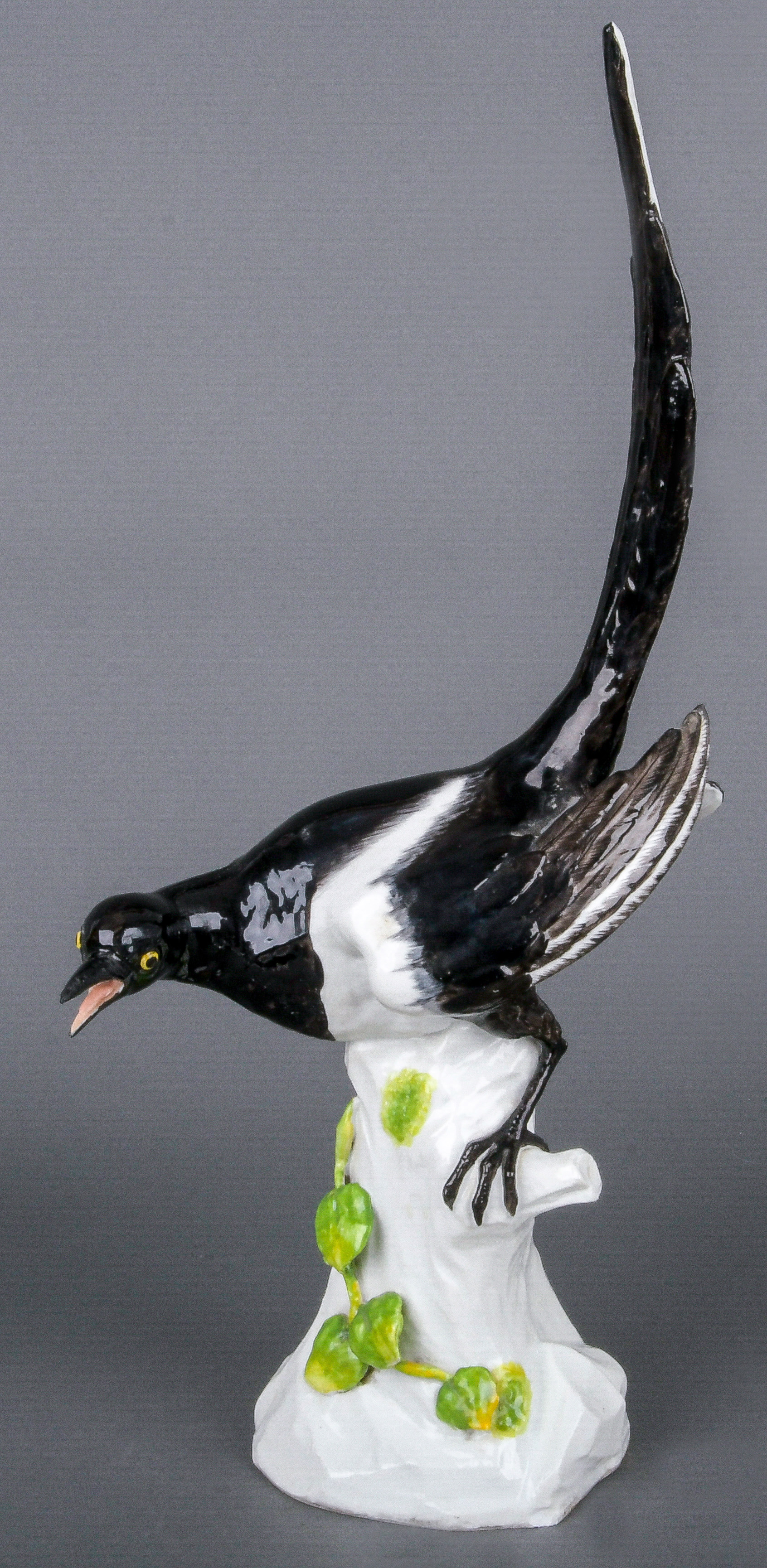 | Exzellent naturalistisch in Lebensgröße modelliert und staffiert, auf hohem Baumstamm mit aufbossierten Blättern. Porzellan, bunt bemalt, ohne Marke. Modell von Johann Joachim Kaendler. Vgl. R. Rückert 1966, Taf. 271, Nr. 1105. (min. best.)