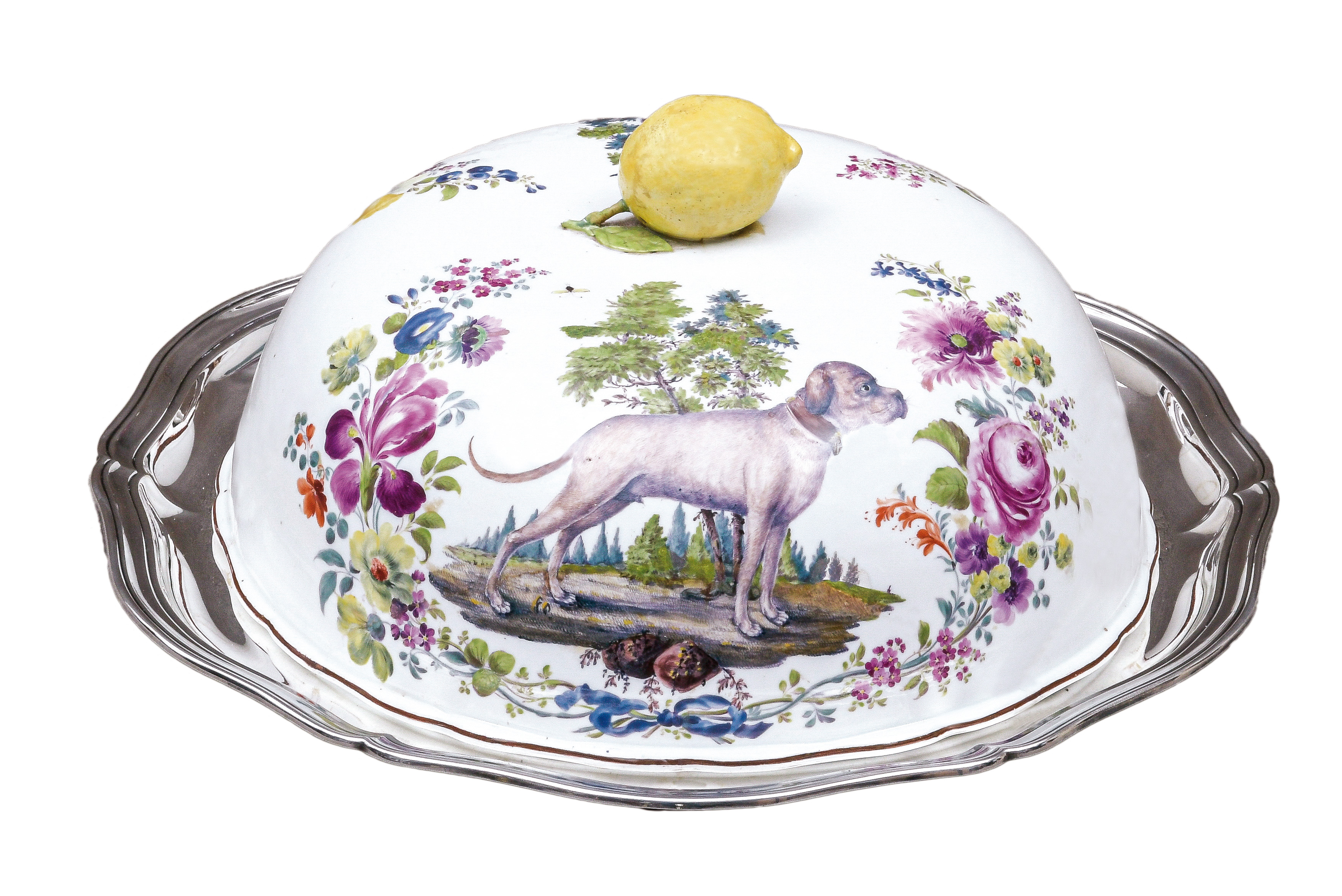 | Große halbkugelförmige Glocke mit wulstigem, gewelltem, kapuzinerbraun staffiertem Lippenrand und naturalistisch modellierter Zitrone als Knauf. Beidseitig bunt bemalt mit Hund bzw. Affe in Landschaft, umrahmt von Blumengirlanden mit Schlupfwerk. Porzellan, ohne Marke. August III. schenkte dem englischen Gesandten am Dresdener Hof, Sir Charles Hambury-Williams, das Service mit dieser Wärmeglocke im Jahr 1747. Vermutlich ist sie das einzige nachweisbare Formteil aus diesem Service. Insgesamt sind nur 44 Serviceteile überliefert, die in Alnwick Castle aufgewahrt werden. Weitere fünf Teile befinden sich in Museen. (nicht sichtbar rest.)