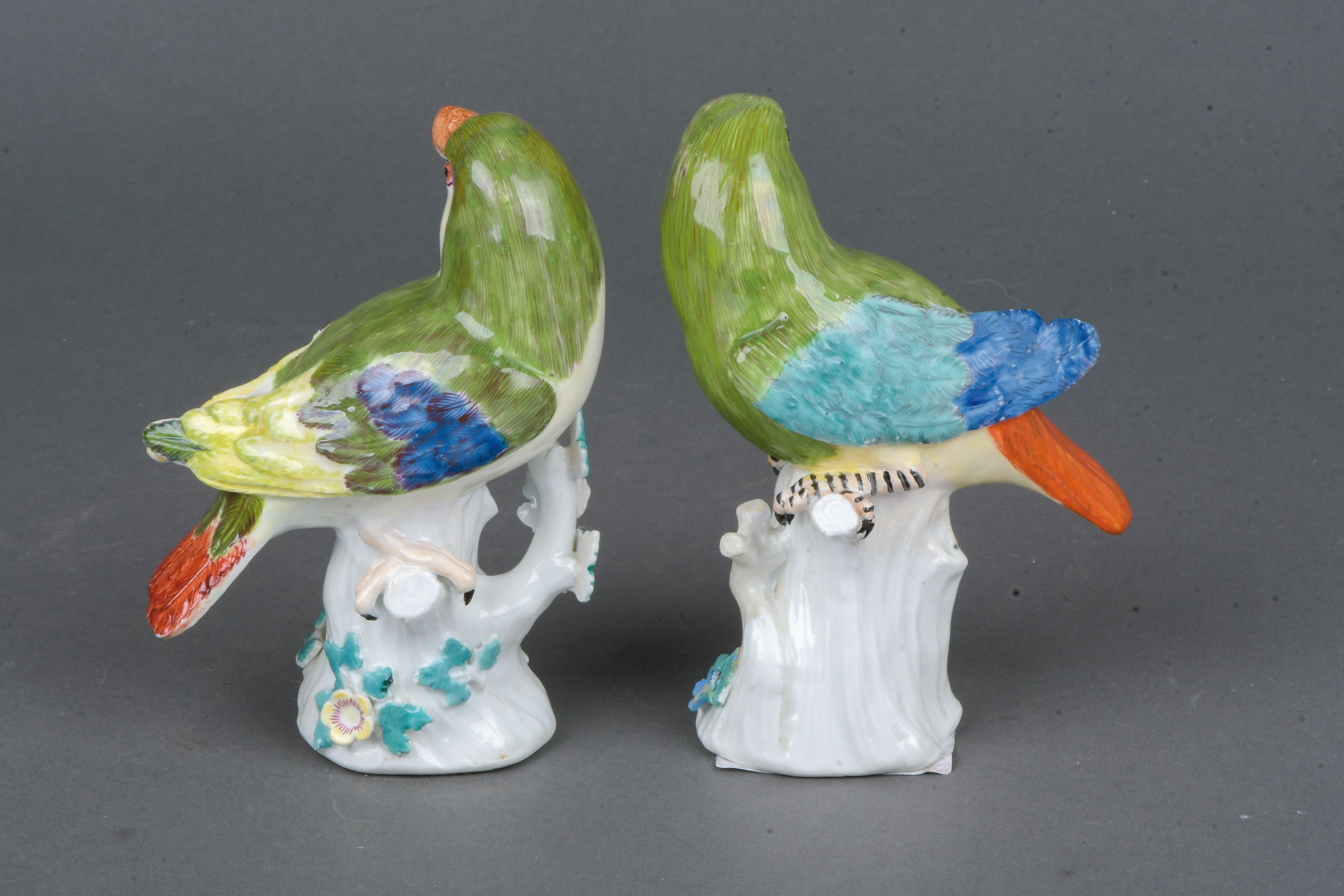 | Je sitzend auf Baumstamm, reliefiert mit Blüten und Blättern. Naturalistisch modelliert und staffiert. Porzellan, am Boden unterglasurblaue Schwertermarke. Modelle von Johann Joachim Kaendler. Auszug aus der Taxa Kaendlers: „Einen Neuen Pappagoy mittlerer Sorte in Thon poussiret welcher gegen den schon im Waaren Laager befindl. Pappagoy siehet“. Vg. S.-K. Andres-Acevedo, „Die autonomen figürlichen Plastiken“, Stuttgart 2023, S. 121, Nr. 310.