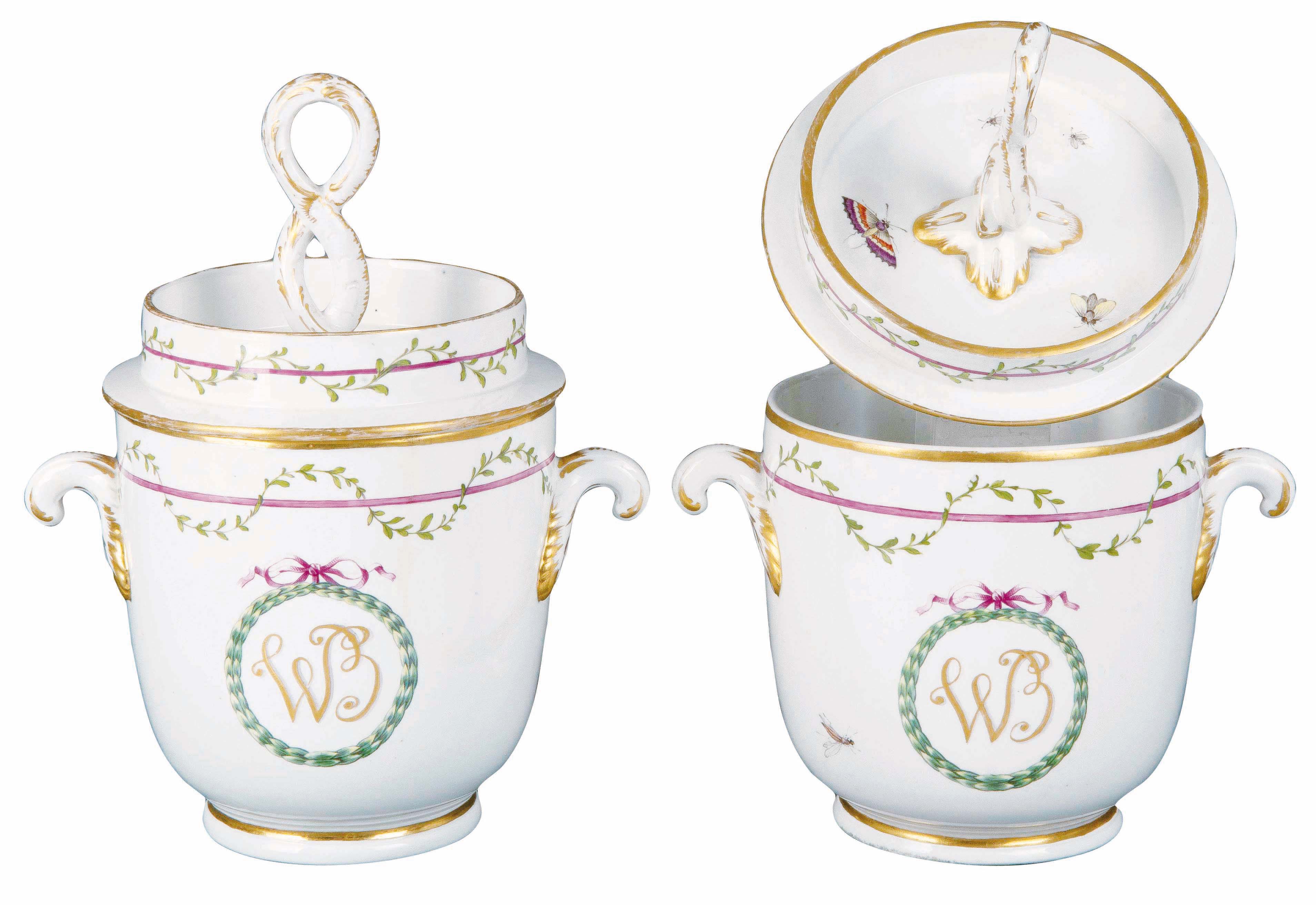 | Je walzenförmig, auf rundem, eingeschnürtem Standring. Seitlich oberhalb gebogte, V-förmige Griffe. Flacher Deckel mit erhöhtem, mittig doppelt geschweiftem Henkel. Beide Schauseiten bemalt mit Eichenlaubmedaillons, bekrönt von Schleife und rosé Band mit gewellten Blattgirlanden und bunt gemalten Insekten. Reserven mit ligiertem Monogramm „WB“. Ränder gold staffiert. Porzellan, am Boden unterglasurblaue, ligierte, bekrönte FF-Marke.