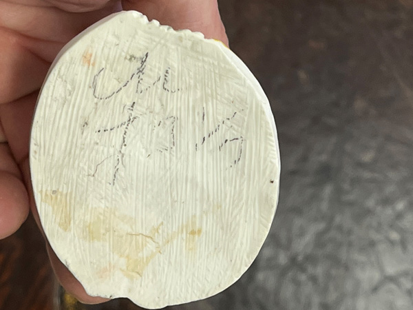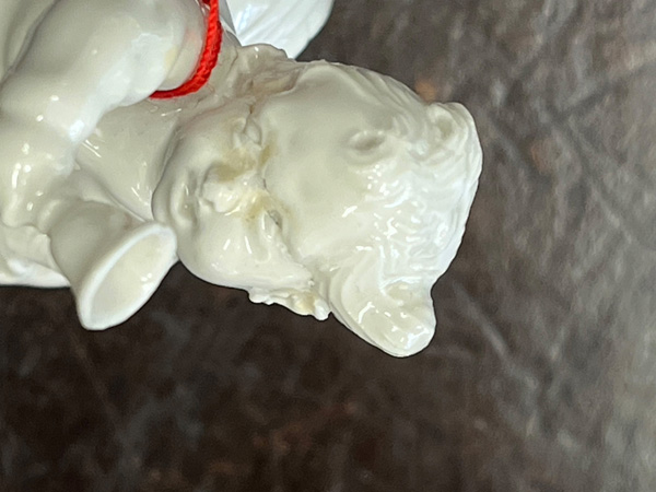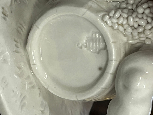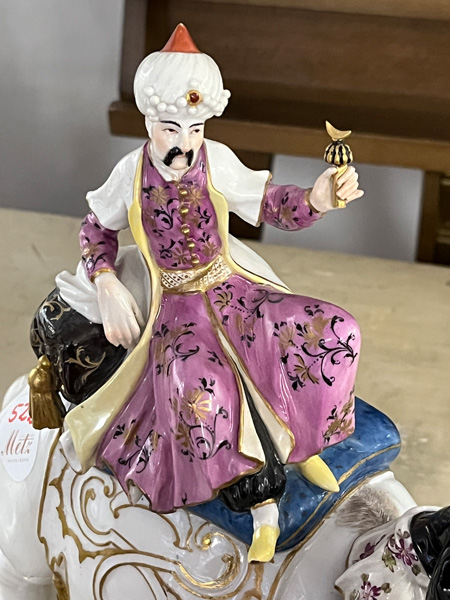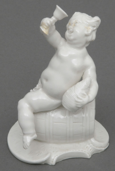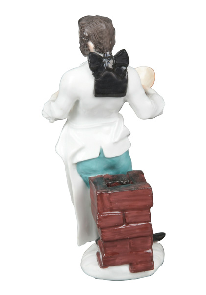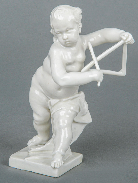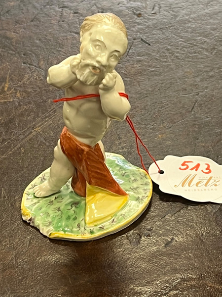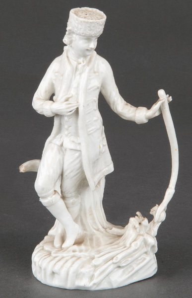 | Auf rundem, unregelmäßigem, kanneliertem Sockel stehend. Seitlich in der Hand eine Heugabel haltend. Porzellan, weiß glasiert, am Boden unterglasurblaue „HC“-Marke. Vgl. M. Wienert, Kasseler Porzellan, Nr. 95; S. Ducret, „Die landgräfliche Porzellansammlung Kassel“, Titelseite. (min. best.)