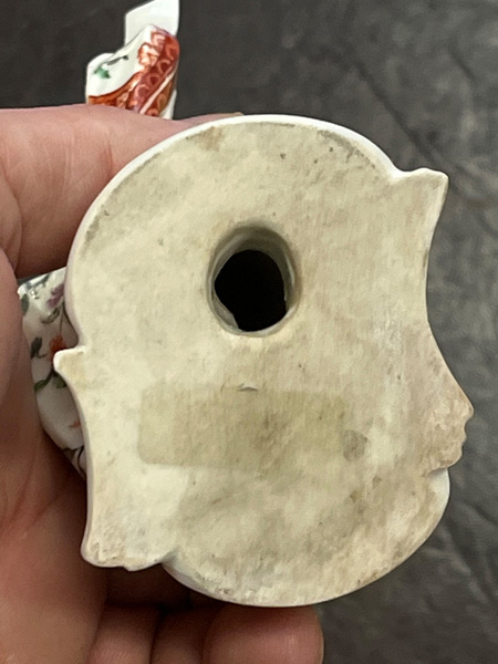 | Vierpassiger, rocaillereliefierter Sockel. Darauf sitzend eine Dame mit Katze. Seitlich ein die Zähne fletschender Mops. Im Hintergrund ein Baumstumpf mit durchbrochenem Deckelgefäß. Teilw. bunt bemalt mit Insekten, gold gesäumt. Porzellan, am Boden unterglasurblaue Schwertermarke, Pressziffer „34“. Modell von Johann Joachim Kaendler und Peter Reinicke. (min., nicht sichtbar rest.)