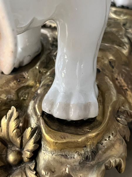 | Je auf ovalem, unregelmäßigem Sockel mit aufbossierten Blüten und Blättern stehend. Naturalistisch modelliert und bunt staffiert. Porzellan, am Boden unterglasurblaue Schwertermarke. Modelle von Johann Joachim Kaendler. Auszug aus der Taxa Kaendlers: „3. Einen bereits angefangenen Auer-Ochsen,auf der Flucht vorgestellet, in Thon vollends verfertigt“. Vgl. S.-K. Andres-Acevedo, „Die autonomen figürlichen Plastiken“, Stuttgart 2023, S. 225, Nr. 658. (nicht sichtbar, unwesentlich best.)