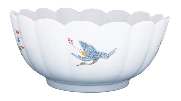 | Walzenförmig, sich nach unten verjüngend, auf eingeschnürtem Standring. Umlaufend mit gefächerter, gewellter Wandung und Lippenrand. Schauseiten bunt bemalt mit Kranichen und Kakiemonblütenzweigen, teilw. gold überdekoriert. Porzellan, am Boden unterglasurblaue Schwertermarke. Vgl. R. Rückert 1966, Taf. 75, Nr. 294 (Dekor) und Taf. 105, Nr. 415 (Form). (min.best.)