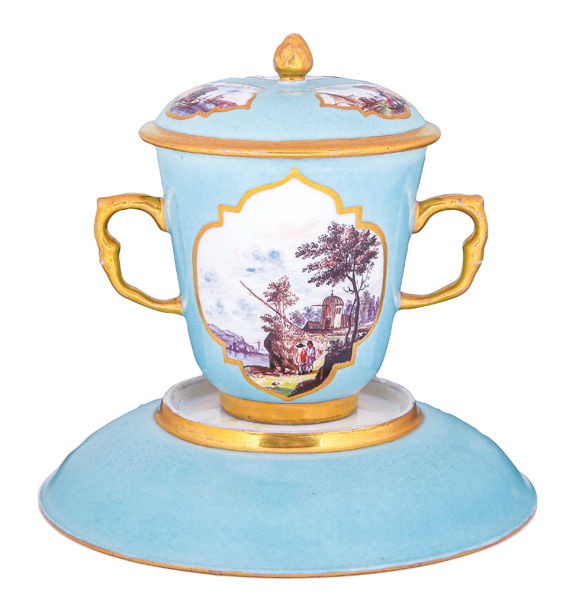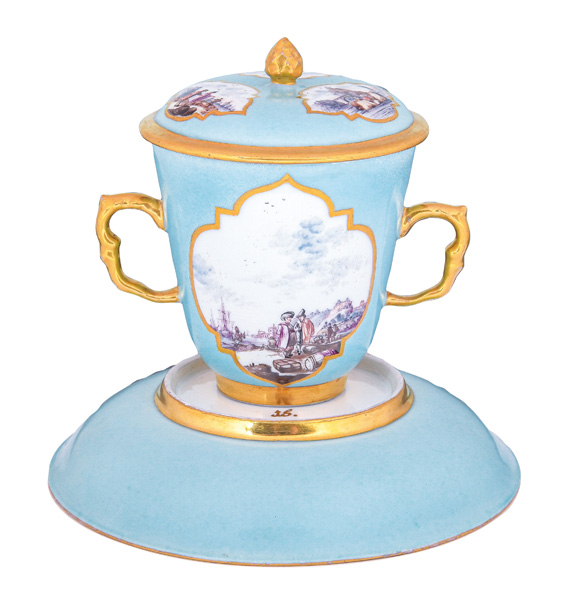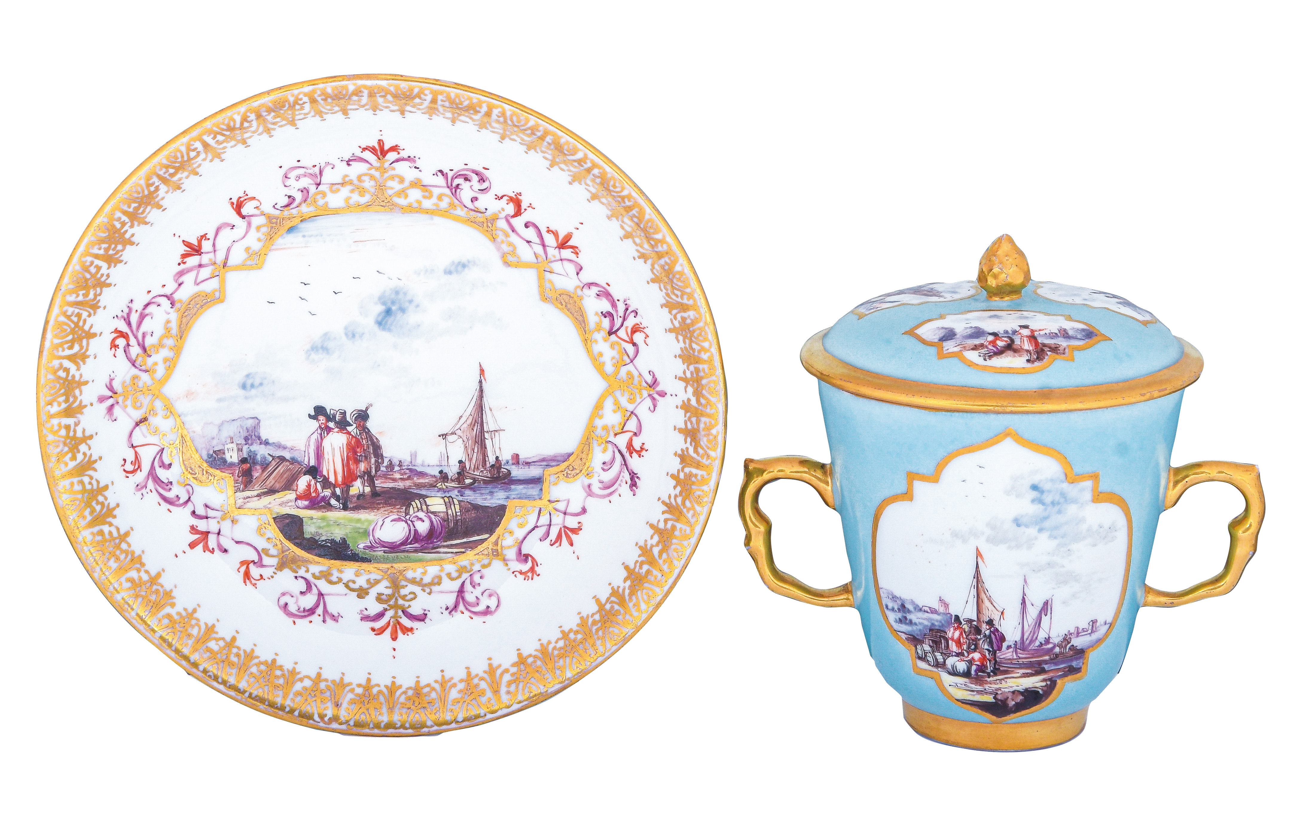 Alle Teile mit türkisfarbenem Fond, Goldrändern und Goldkartuschen. Reserven bunt bemalt mit Uferlandschaften, Figurenstaffagen und Segelbooten. Porzellan, am Boden unterglasurblaue Schwertermarke mit Goldziffer „15.“. Malerei Umkreis Christian Friedrich Herold. Vgl. R. Rückert 1966, Taf. 109, Nr. 421 (Dekor).