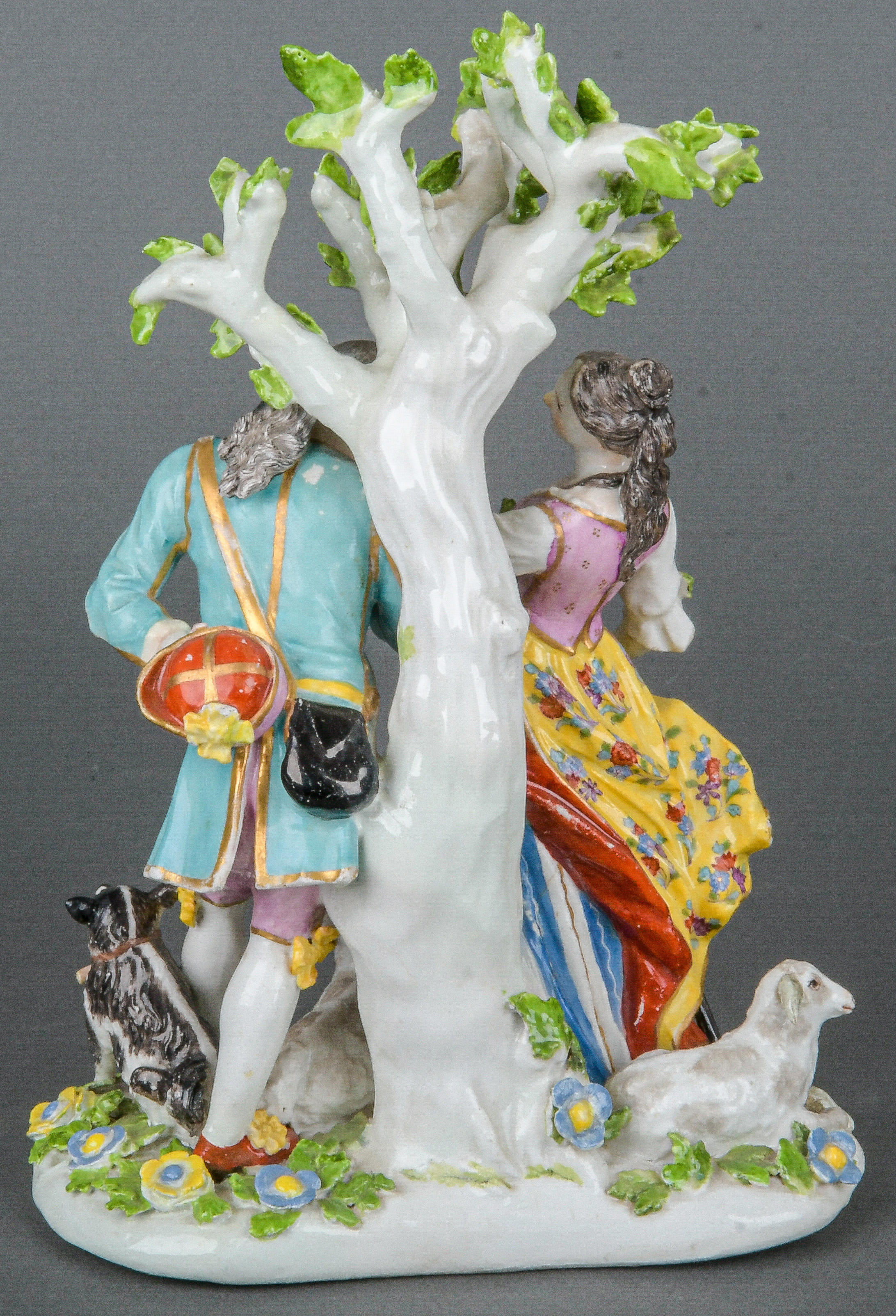 | Kavalier und Schäferin, auf ovalem Sockel mit üppigem Blatt- und Blütenreliefdekor stehend. Seitlich zwei Schafe und ein Hund, im Hintergrund ein aufragender Baum. Bunt bemalt, teilw. mit indianischem Floraldekor. Porzellan, ohne Marke. Modell von Johann Joachim Kaendler und Peter Reinicke. Vgl. M. Kunze-Köllesperger, „Slg. F. Burda“, Augsburg 1997, Taf. 161, Nr. 90. (rest.)