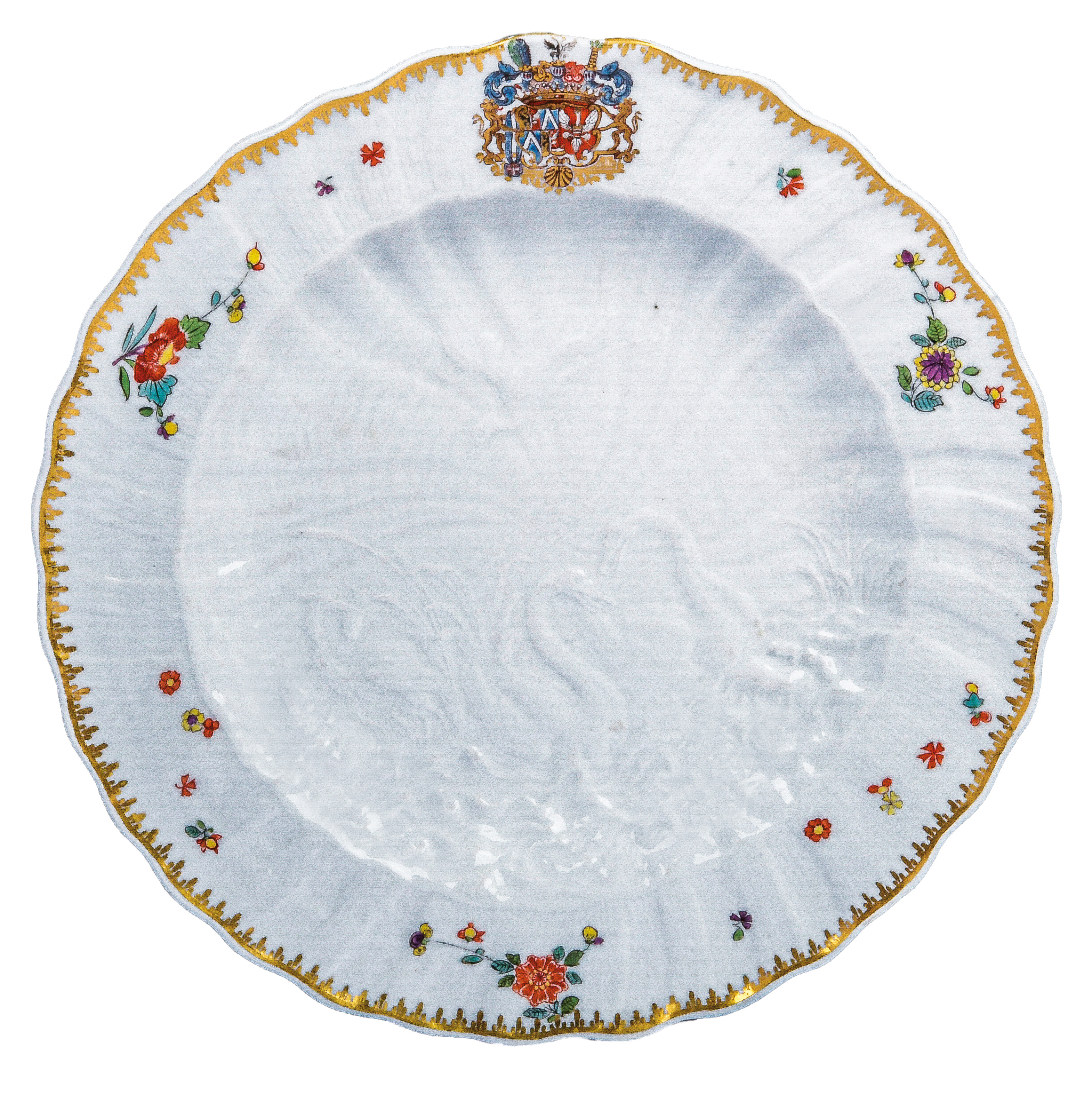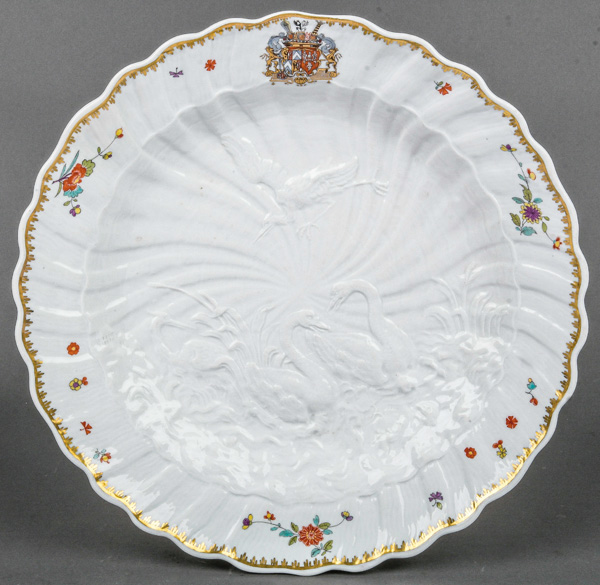 | Rund gemuldet, mit muschelförmig ausmodellierter Fahne, bunt bemalt mit asiatischem Floraldekor sowie dem Allianzwappen des Grafen von Brühl und seiner Gemahlin Kolowrat-Krakowský. Spiegel reliefiert mit dem namensgebenden Dekor. Porzellan, verso unterglasurblaue Schwertermarke, Drehermarke „4“ für Friedrich August Albrecht. Modell von Johann Joachim Kaendler und Johann Friedrich Eberlein. Provenienz: Kunsthandel Röbbig, München 1999; davor Sotheby's New York 1999. Vgl. U. Pietsch, „Schwanenservice - Meissener Porzellan für Heinrich Graf von Brühl“, Dresden 2000, S. 159, Nr. 29.