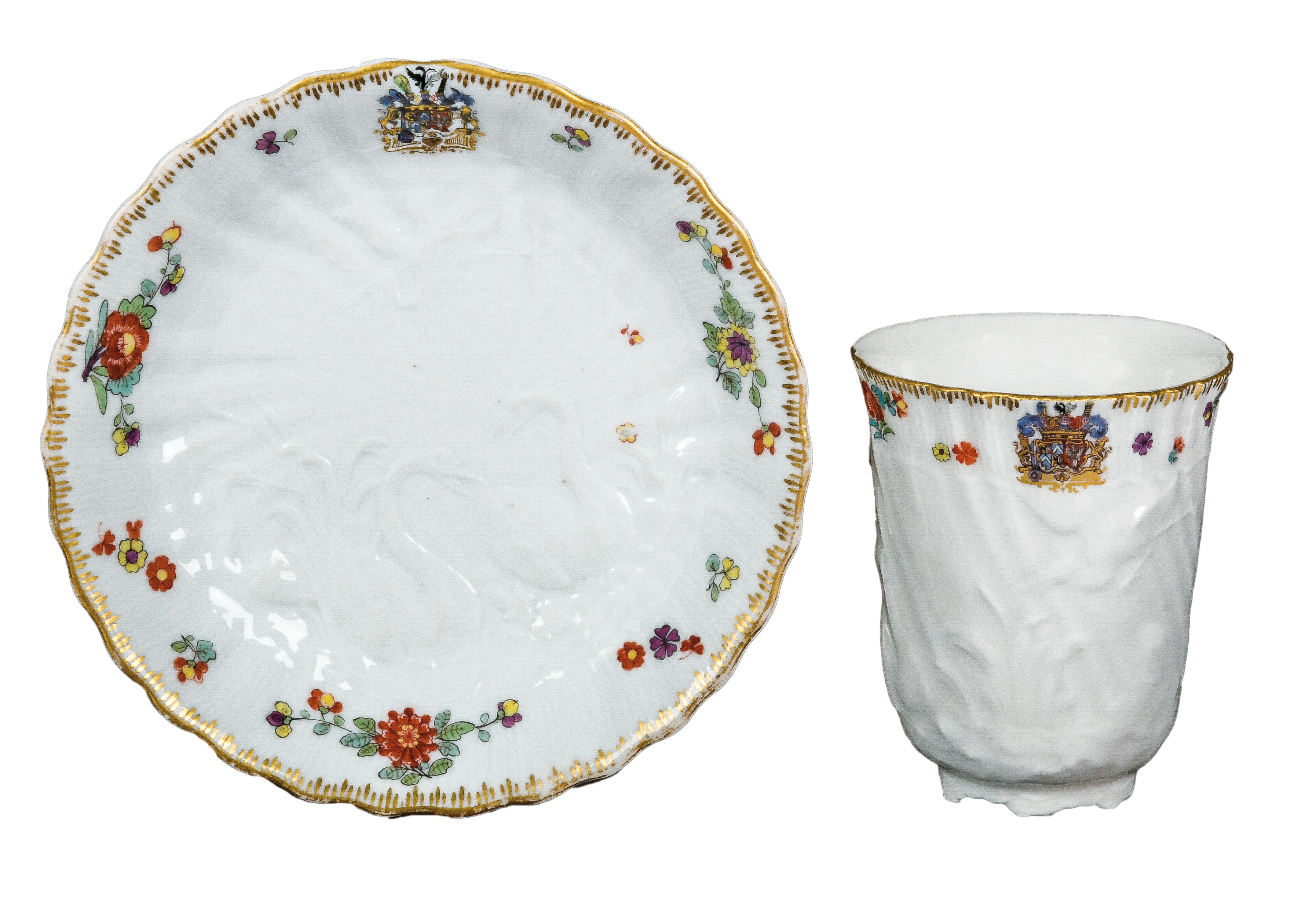 | Beide Teile reliefiert mit dem namensgebendem Dekor und bunt bemalt mit asiatischem Floraldekor sowie dem Allianzwappen des Grafen von Brühl und seiner Gemahlin Kolowrat-Krakowský. Porzellan, verso unterglasurblaue Schwertermarke. Modell von Johann Joachim Kaendler und Johann Friedrich Eberlein. Das Schwanenservice gilt als eines der bedeutendsten und umfangreichsten Service der Meissener Manufaktur. Es bestand ursprünglich aus insgesamt 2.200 Teilen. Vgl. U. Pietsch „Schwanenservice - Meissener Porzellan für Heinrich Graf von Brühl“, S. 173, Nr. 50.Provenienz: Rudolph Lepke, „Slg. Ludwig Darmstädter“, Berlin 1925, Nr. 126; danach Hugo Helbing, München 1930. Insgesamt sind nur drei Becher mit Unterschalen überliefert.