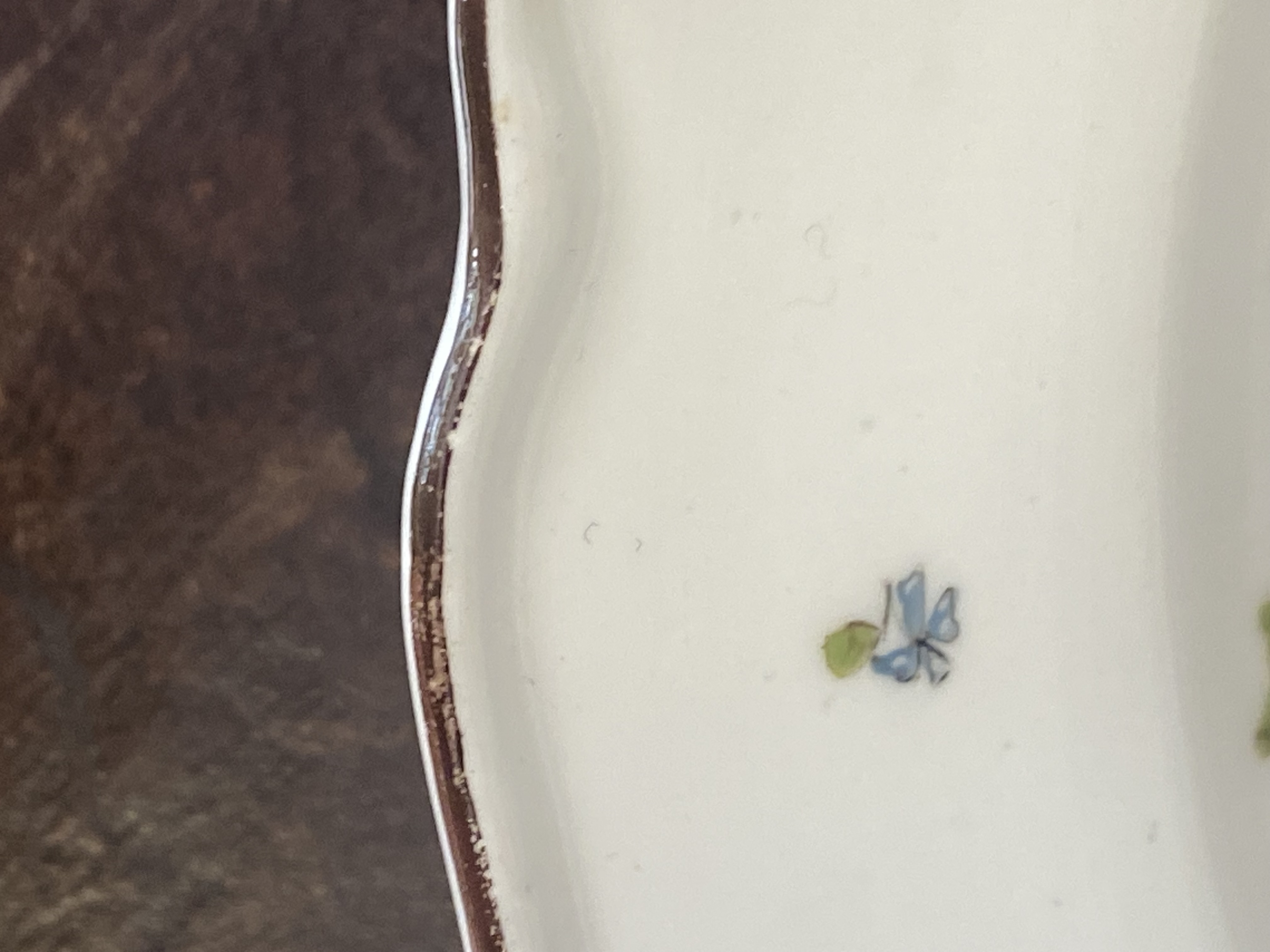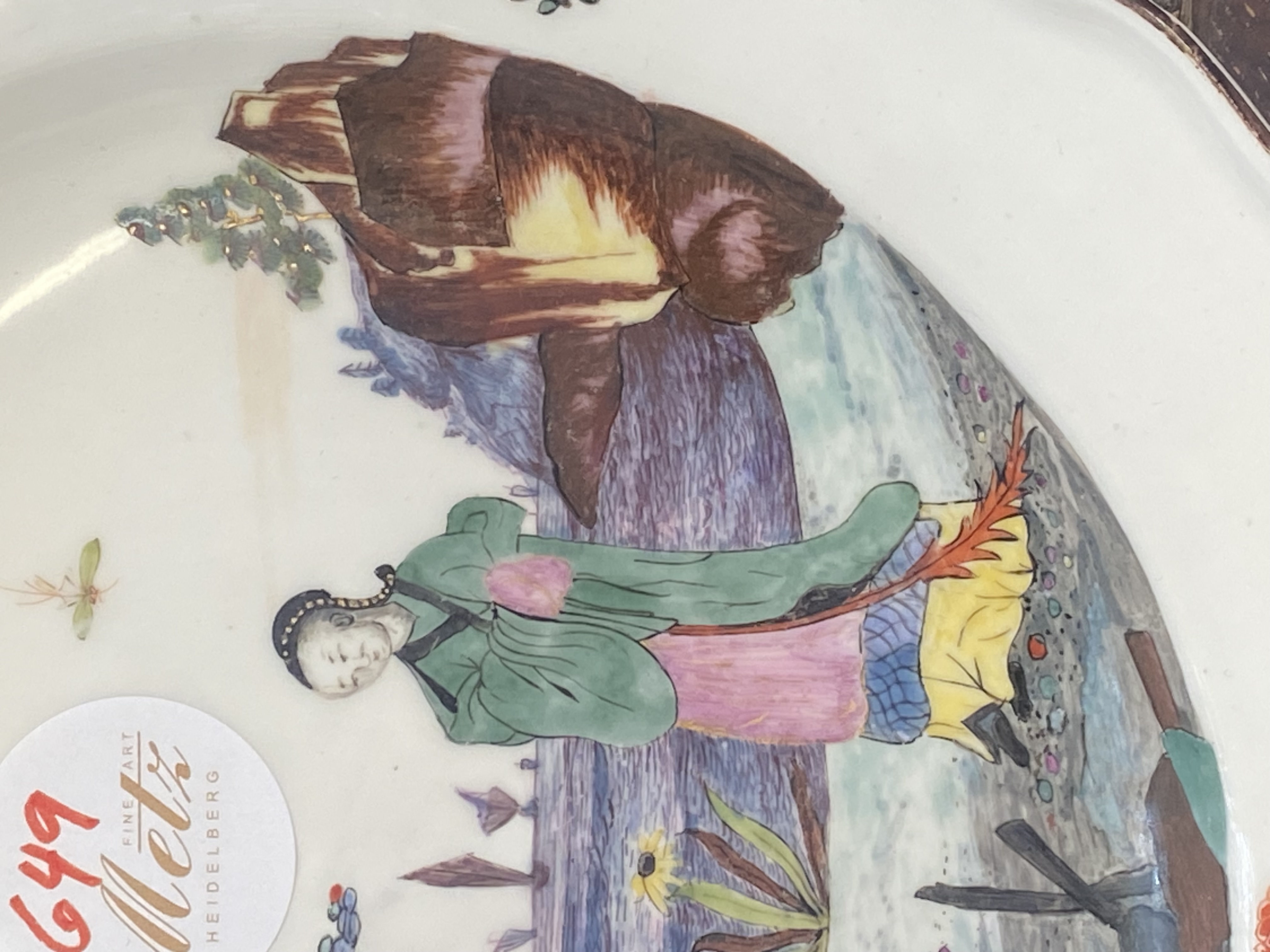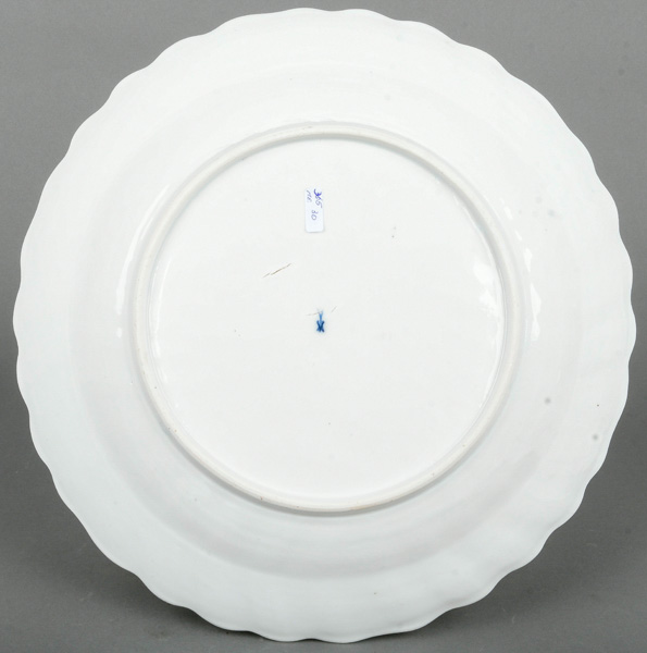 | Rund gemuldet. Steigende Fahne mit umlaufend gewelltem, wulstigem, kapuzinerbraun staffiertem Lippenrand. Spiegel bunt bemalt mit Fasanenpaar, je auf einem Baum sitzend in bunt gemalter Landschaft vor purpur staffierter Uferlandschaft. Porzellan, verso unterglasurblaue Schwertermarke. Vgl. Slg. Hoffmeister, Bd. I, S. 306ff, Nr. 195.