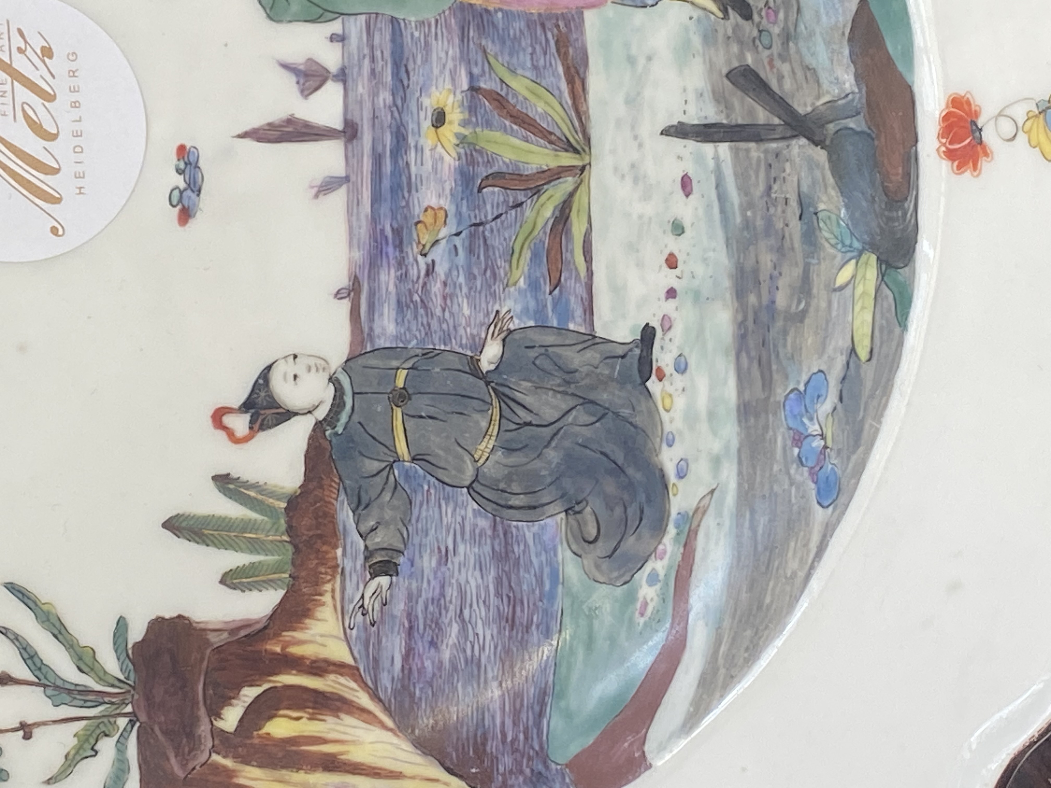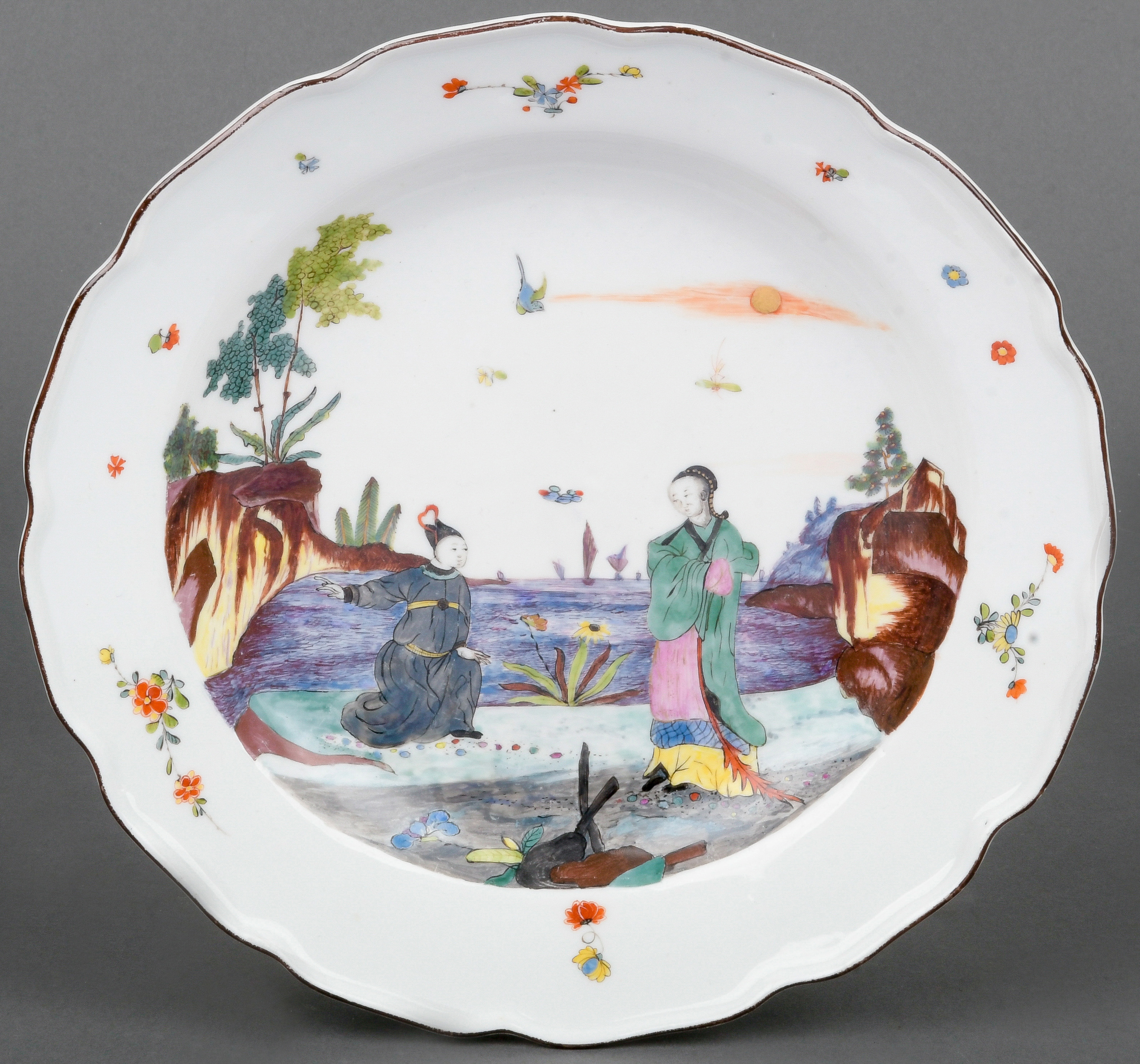 | Rund gemuldet. Steigende Fahne mit umlaufend gewelltem, wulstigem, kapuzinerbraun staffiertem Lippenrand. Spiegel fein bunt bemalt mit Chinoiserie in Uferlandschaft, umgeben von Streublumen. Porzellan, verso unterglasurblaue Schwertermarke, Pressziffer „16“. Malerei in der Art von Adam Friedrich von Löwenfinck. (nicht sichtbar rest.) Erworben: Sotheby's, London 24. Nov. 1998, Nr. 65. Vgl. Slg. Gebr. Hoffmeister, S. 88, Nr. 47.