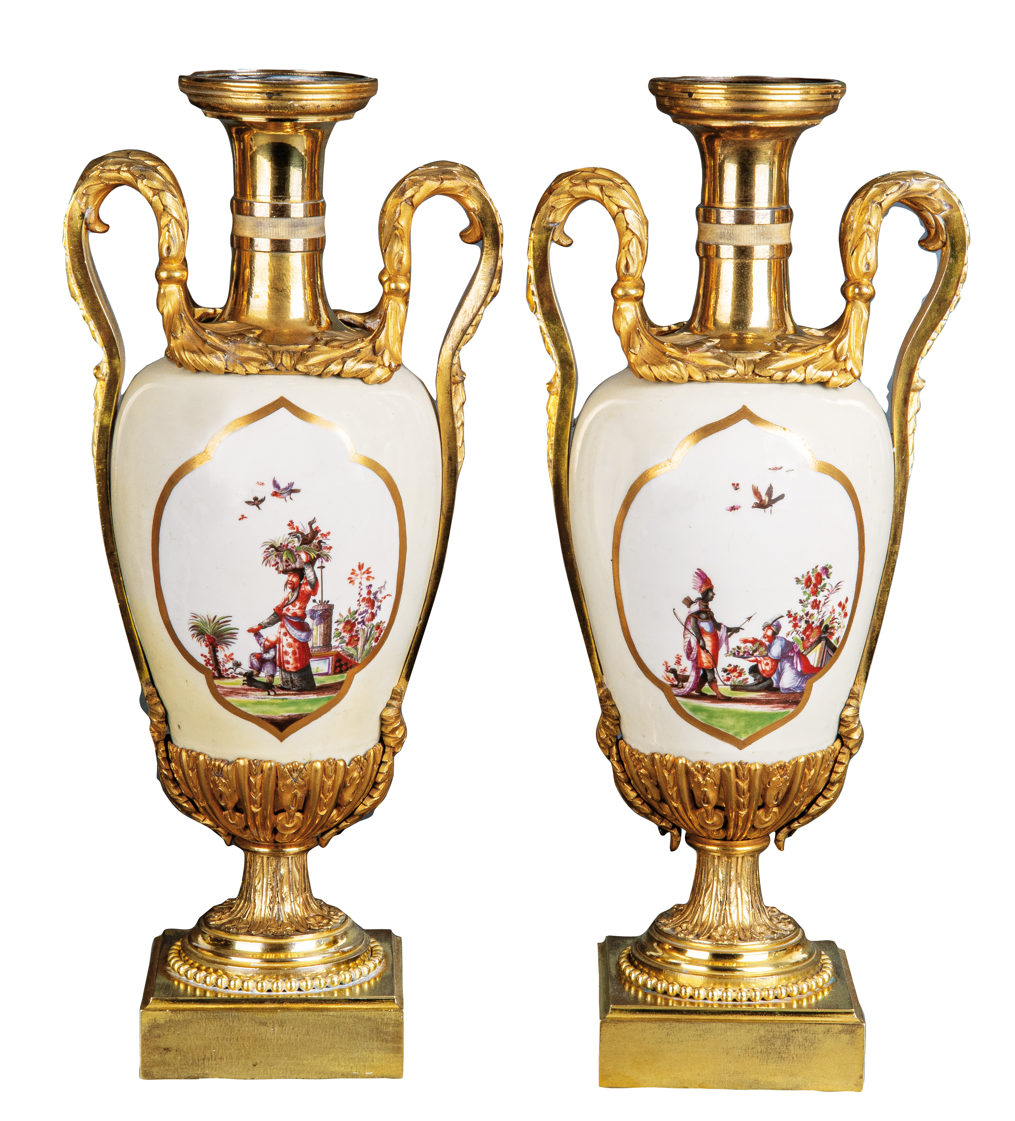 | Je birnförmig, mit hellem, crèmefarbenem Fond. Beidseitig mit mehrpassigen Goldkartuschen. Reserven bunt bemalt mit Chinoiserien und Drachen, umgeben von Insekten. Porzellan, ohne Marke, mit zeitgenössischer, fein modellierter, feuervergoldeter Bronzemontur. Malerei von Johann Gregorius Hoeroldt.