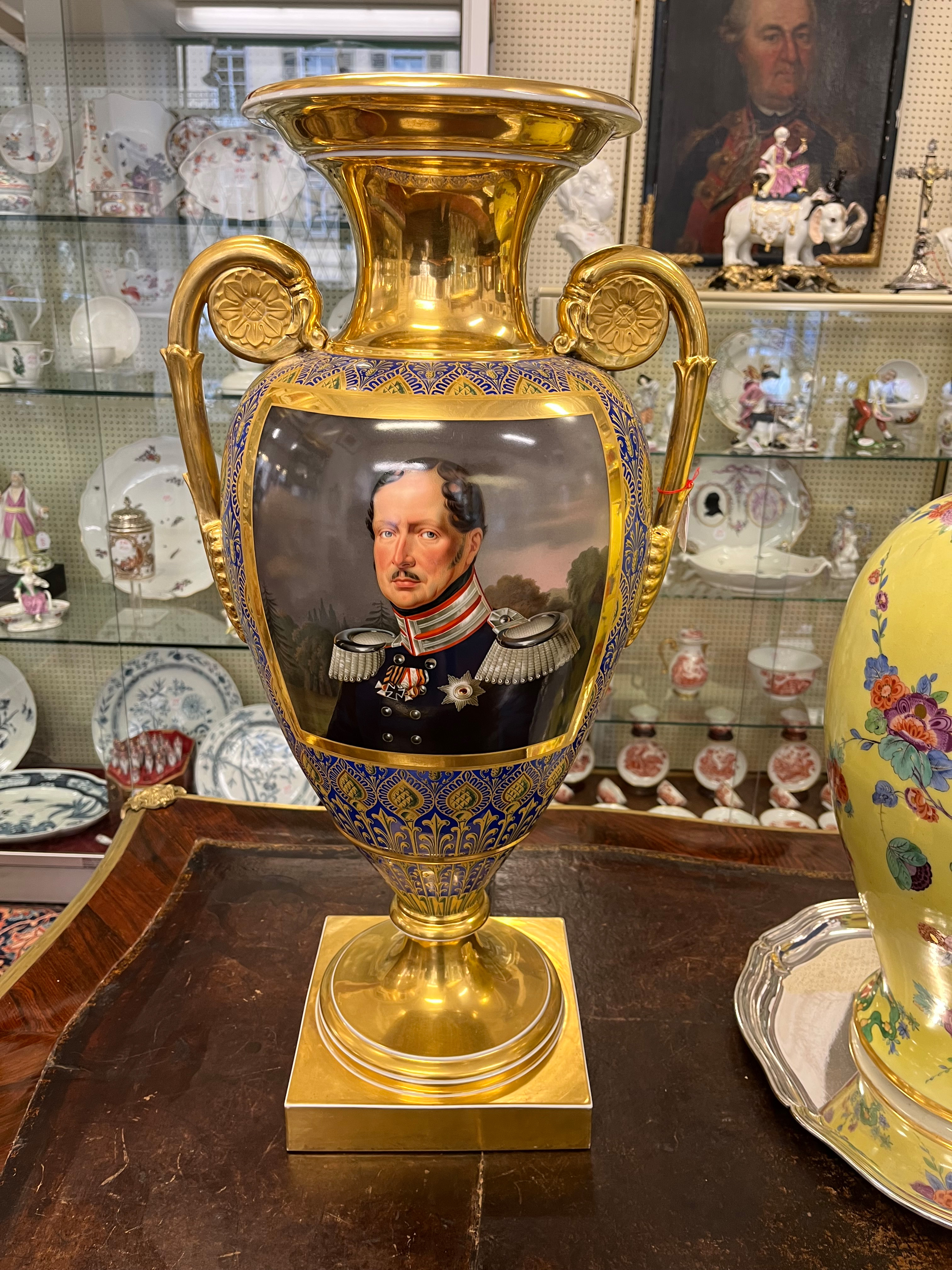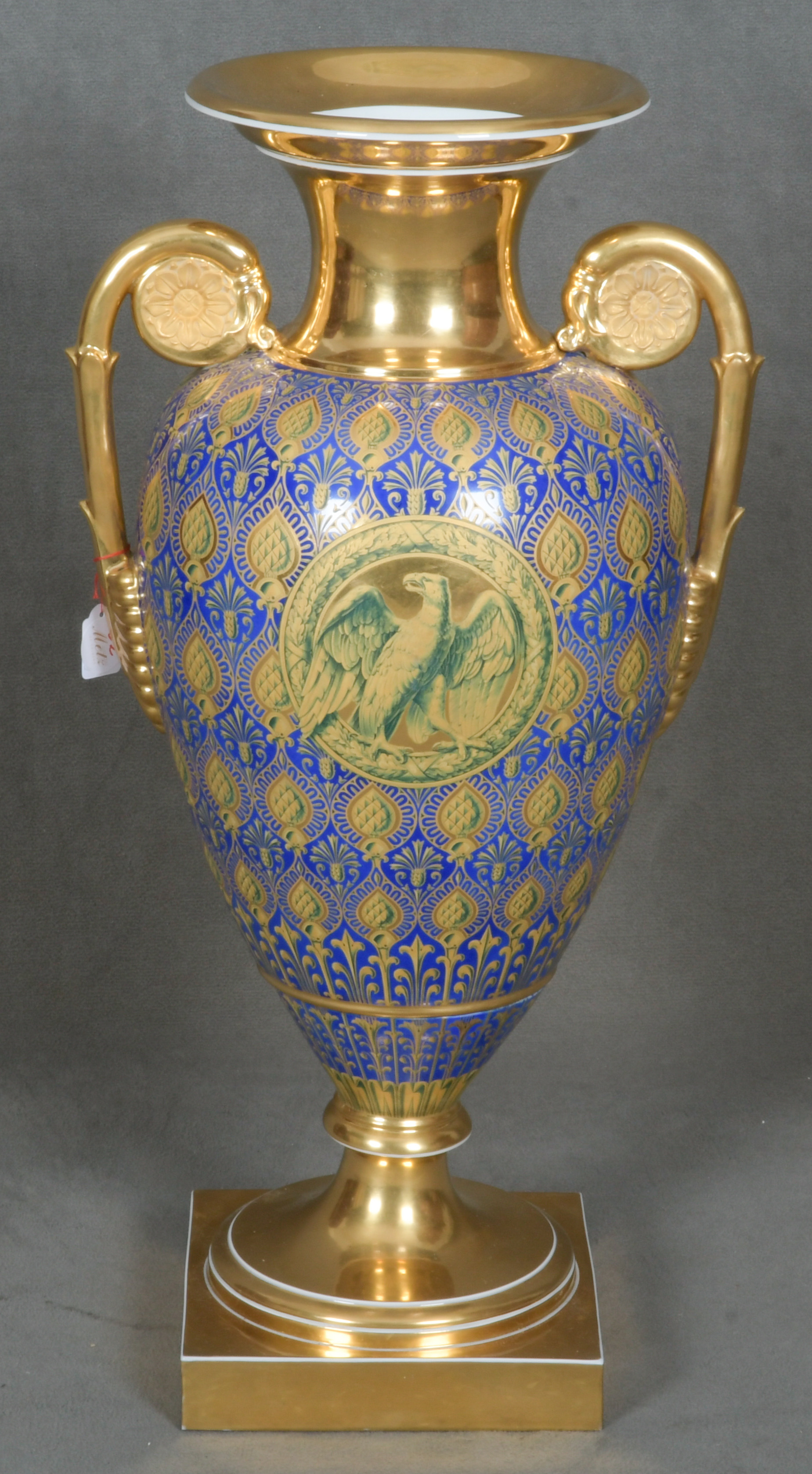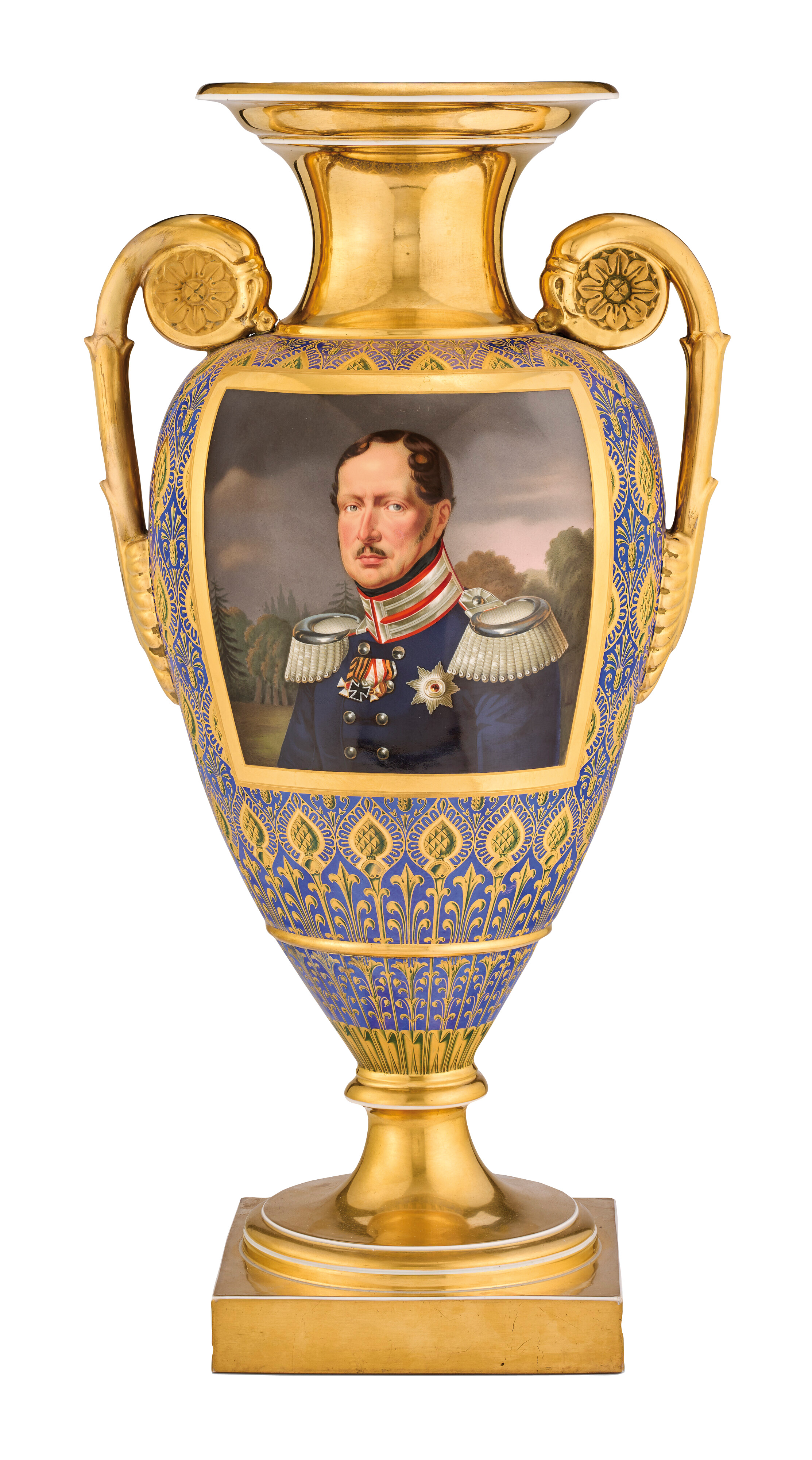 | Quadratische Plinthe mit trichterförmigem Fuß. Eiförmiger Korpus mit seitlich eingerollten Henkeln. Abgerundete Schultern mit walzenförmigem, überlappendem Mündungshals. Königsblauer Fond mit exzellenter, teilweise radierter Goldstaffierung. Fuß, Henkel und Mündungshals gold gehöht. Schauseite museal bemalt mit dem Porträt von König Friedrich Wilhelm III von Preußen. Verso mit dem Preußischen Adler, umrahmt von einem Lorbeerkranz. Porzellan, am Boden unterglasurblaue Szeptermarke mit eisenrotem „KPM“. Solche außergewöhnlich qualitätvollen Vasen wurden direkt vom König hochgestellten Persönlichkeiten als Geschenk überreicht. Provenienz: Eheleute Horst und Ruth E. Denk, New York.
