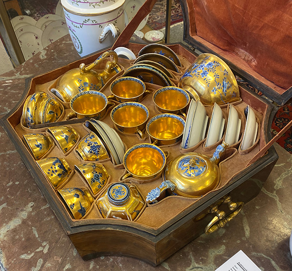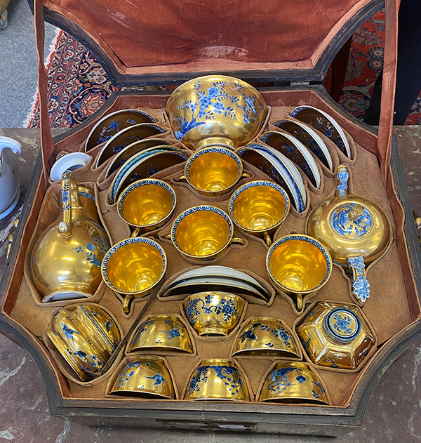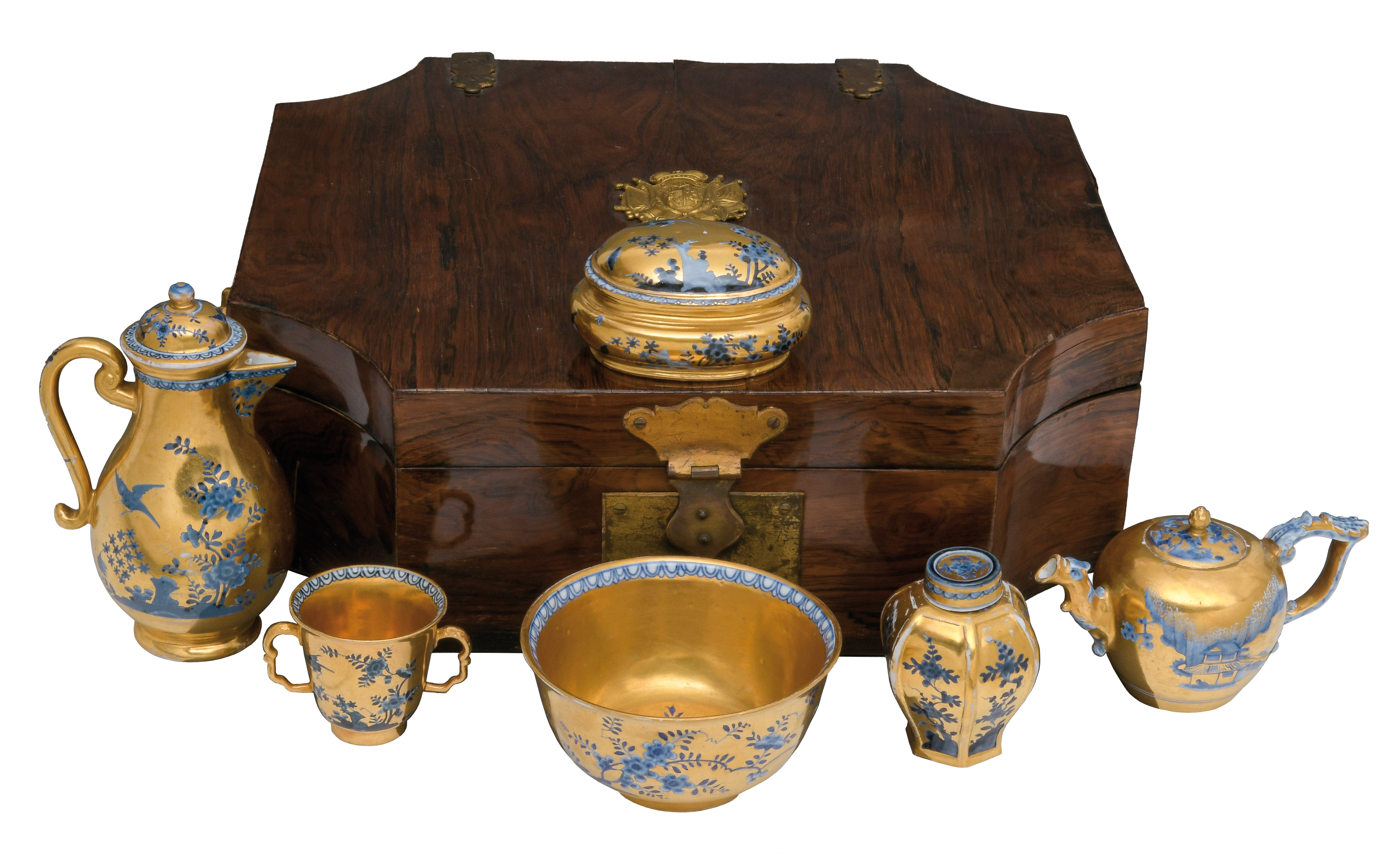 | Bestehend aus: Eine Kaffeekanne (H=19,8 cm), eine hexagonale Teedose (H=10 cm), eine runde Kumme (H=8,1 cm, D=15,2 cm), eine ovale Zuckerdose (H=6,5 cm), sechs Doppelhenkelbecher (H=7,2 cm), sechs Koppchen (H=4,2 cm) und zwölf Unterschalen (D=12,5 cm). Alle Teile mit gold gehöhtem Fond, unterglasurblau bemalt mit Fels- und Vogeldekor bzw. mit Landschaften. Porzellan, am Boden unterglasurblaue Schwertermarke; die Kumme mit Malerbuchstabe „K“. Malerei von Johann David Kretzschmar. In massivem Mahagonikoffer, furniert mit Palisander, mit seitlich beweglichen Griffen und Frontschloß. Provenienz: Kunsthandel Röbbig, München 2000; davor Christie's, Monaco. Vgl. R. Rückert 1966, Taf. 139, Nr. 566 und 568. (Schlüssel fehlt)