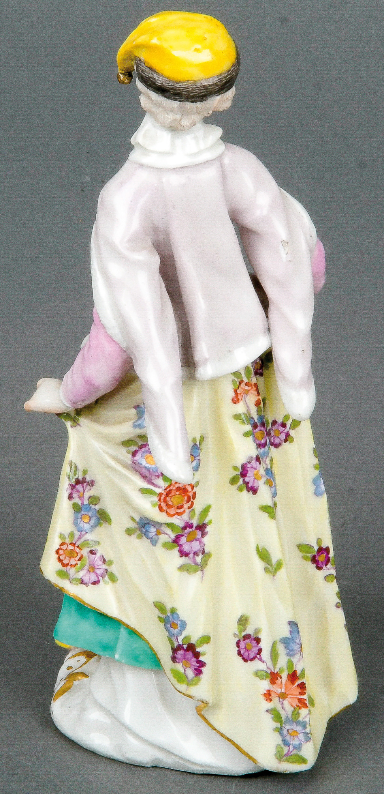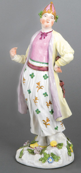 | Tanzend, auf rundem, gold gesäumtem Rocaillesockel. Bunt bemalt, teilw. mit indianischem Floraldekor. Porzellan, ohne Marke. Modell von Johann Joachim Kaendler.