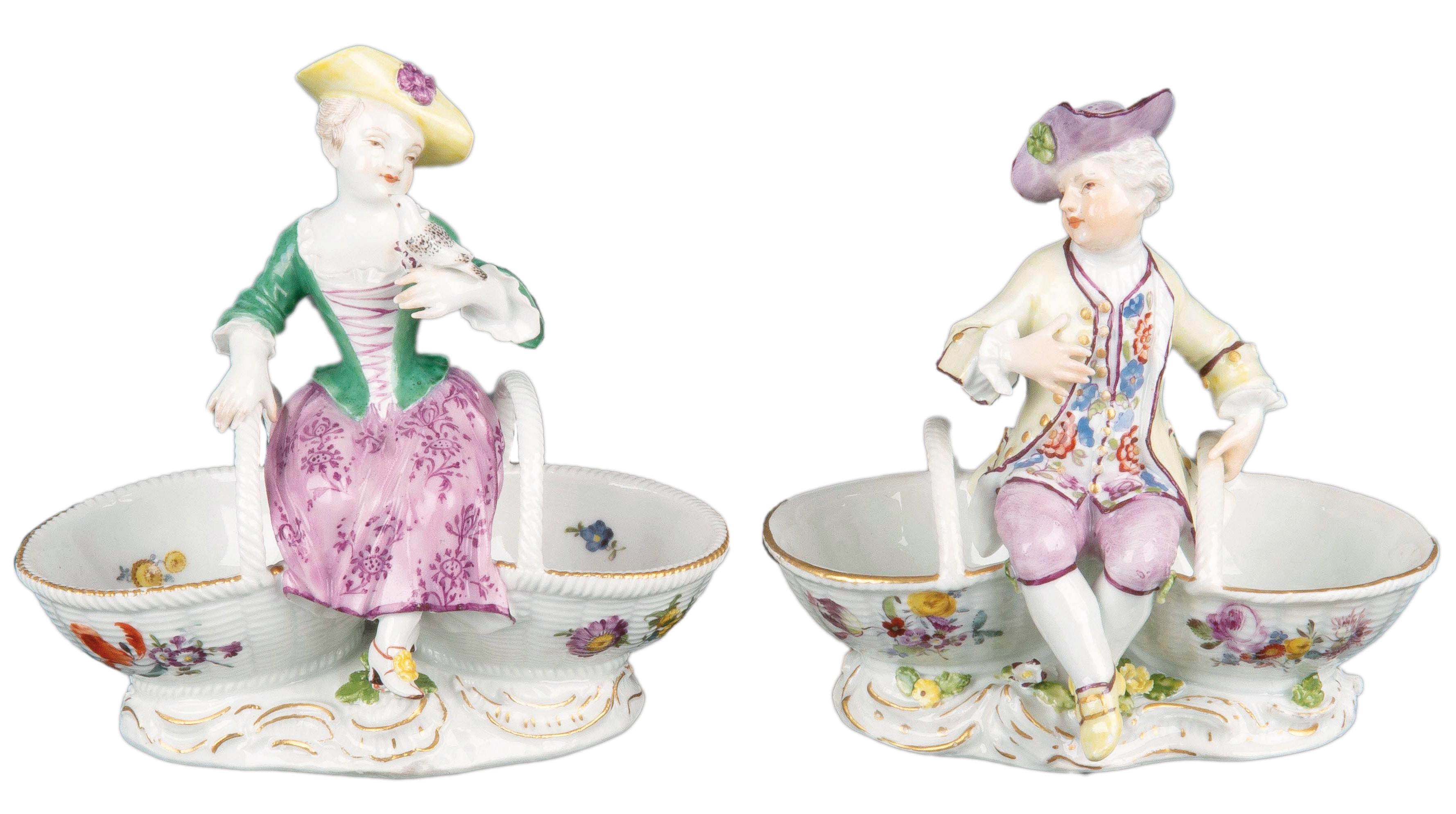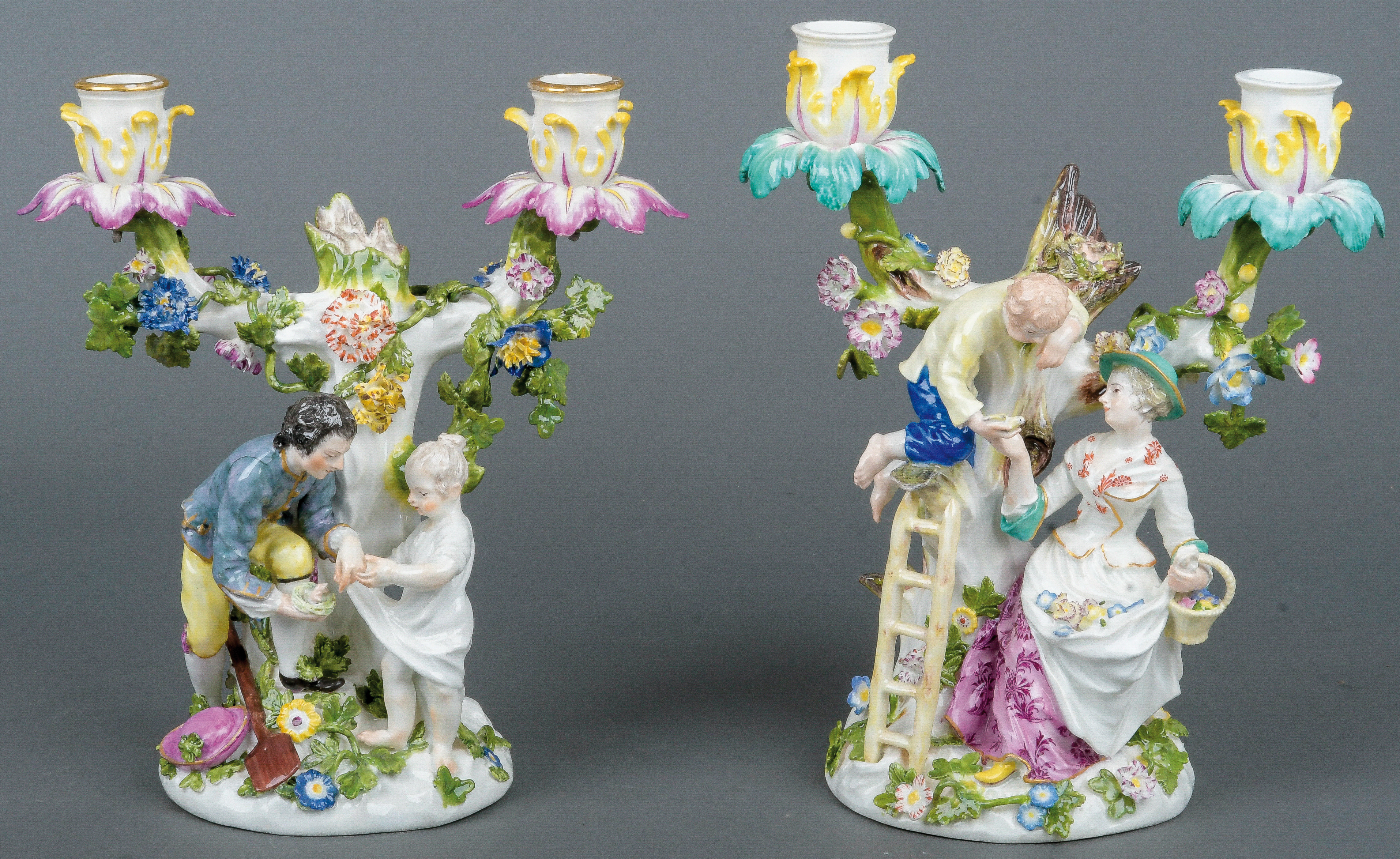 | Je zweiflammig, in Form eines Baumstammes modelliert, auf ovalem Sockel mit aufbossierten Blüten und Blättern. Darauf stehend ein Mann, der einem Mädchen ein Nest reicht bzw. ein Mann, der einer Dame ein Küken reicht. Porzellan, bunt bemalt, verso am Sockel unterglasurblaue Schwertermarke. Modelle von Johann Joachim Kaendler und Friedrich Elias Meyer. Vgl. R. Rückert 1966, Taf. 216, Nr. 884 .