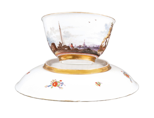 | Beide Teile mit Goldrändern. Schauseiten bunt bemalt mit dem namensgebendem Wappen, umgeben von Streublumen. Außenwandung des Koppchens verso bunt bemalt mit Kauffahrteiszene. Porzellan, am Boden unterglasurblaue Schwertermarke. Vgl. Slg. Hoffmeister, S. 500, Nr. 322.