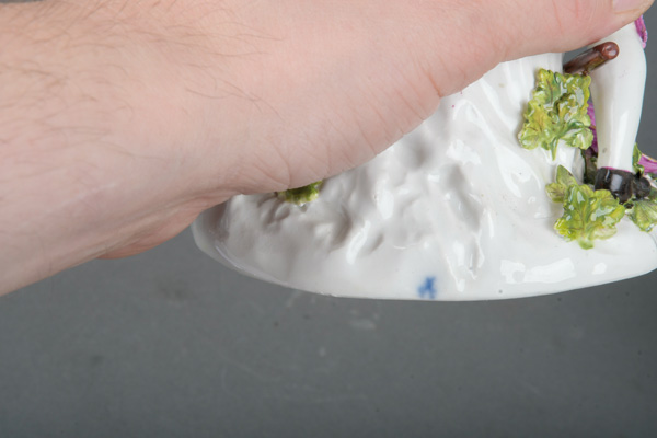 | Je sitzend, auf dem Rand des Gewürzkorbes. Ovaler, rocaillereliefierter Sockel, gold gesäumt. Bunt bemalt, teilweise mit asiatischen Blüten. Porzellan, am Boden unterglasurblaue Schwertermarke. Modell von Johann Joachim Kaendler. Vgl. R. Rückert 1966, Taf. 245, Nr. 1002 ff. (nicht sichtbar rest.)