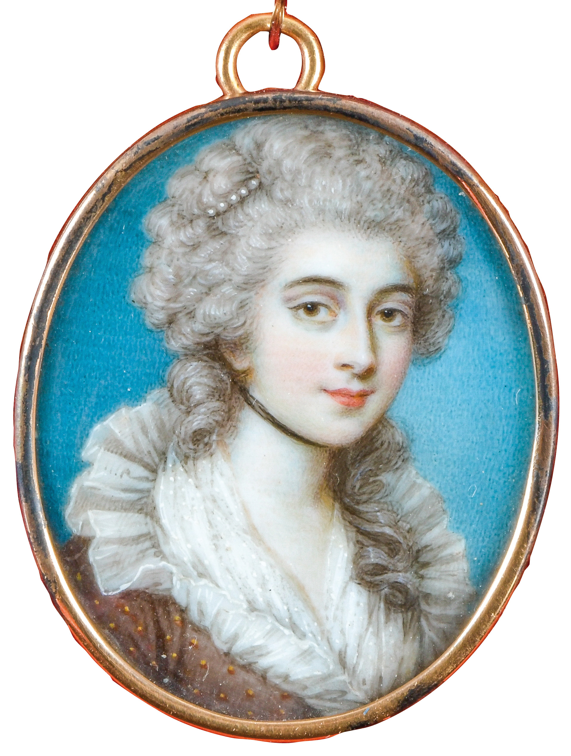 (1756-1804) Porträt einer Dame. Bunt gemalt in Puderfarben und aquarelliert auf Elfenbeinplatte, re./u./sign., hi./Gl. in zierlichem, aufwendigem, goldfarbenem Rahmen mit Reliefgrund. Provenienz: Koller, Zürich 23. Mai 1980 für SFR 9.500,00. Elfenbein-Gutachten und EU-Verkaufsgenehmigung liegen vor und können für EUR 150,00 erworben werden. D=6,6 / 7,7 cm € 1.500,- - Katalog-Nr: 111Thomas Emanuel Peter